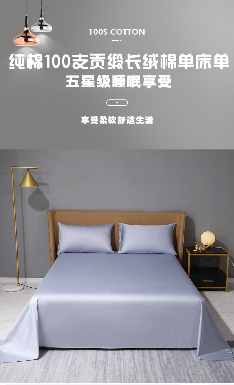晶缦家纺 2024新款100S全棉贡缎长绒棉纯色四件套和单品-纯沐系列 单床单 纯沐-绫兰灰