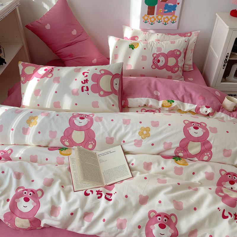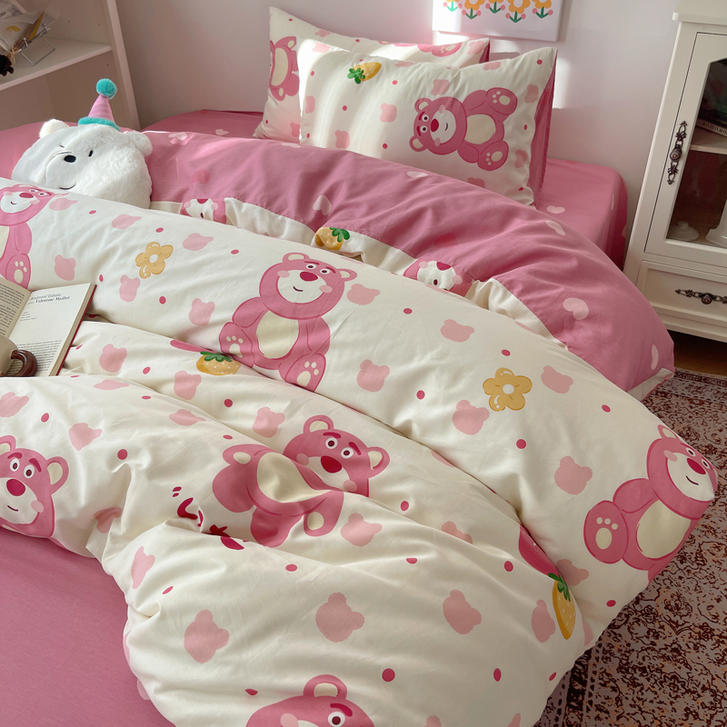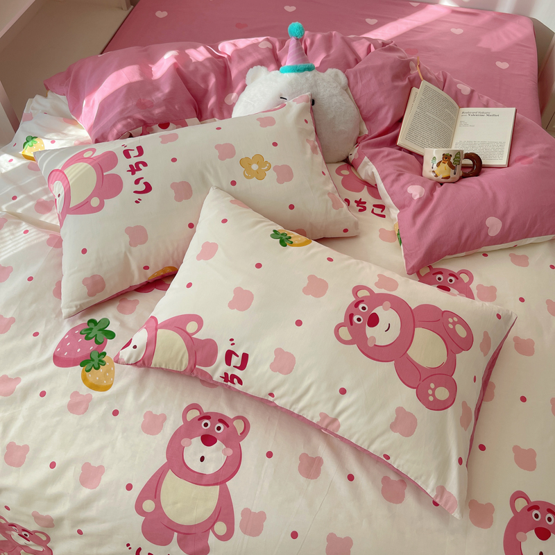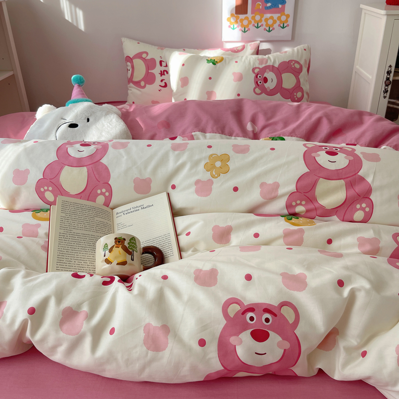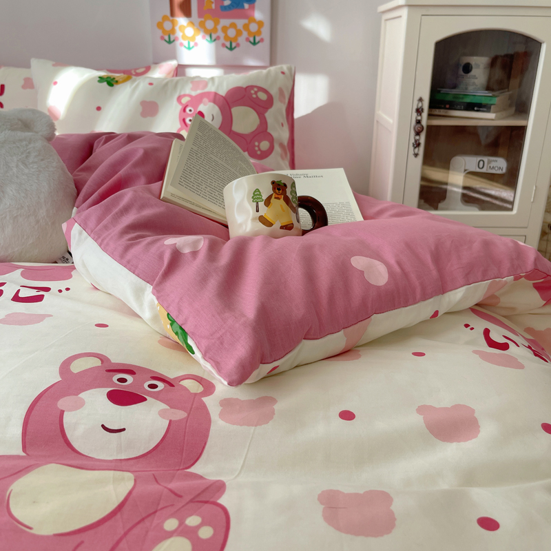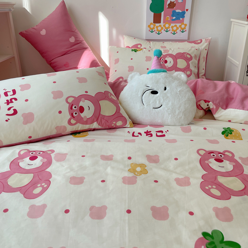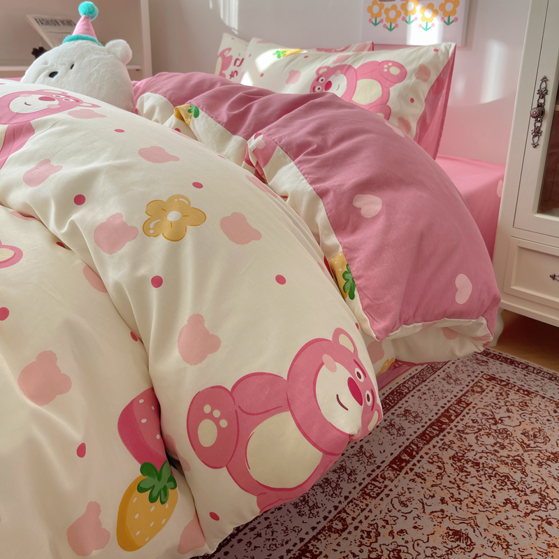 商品名称:桃喜 2024新款40支13372全棉卡通印花小清新四件套 开心草莓熊