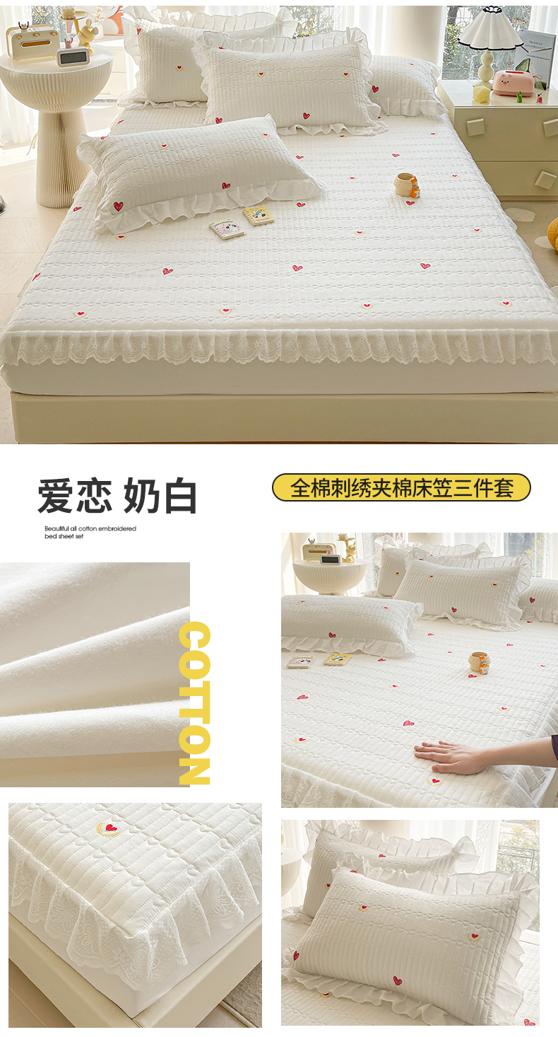 商品名称:宜凡家纺 2024新款全棉夹棉绣花花边系列床笠三件套 爱恋 奶白