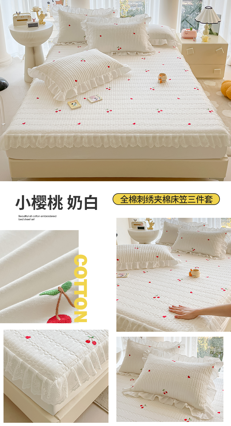 宜凡家纺 2024新款全棉夹棉绣花花边系列床笠三件套 小樱桃 奶白