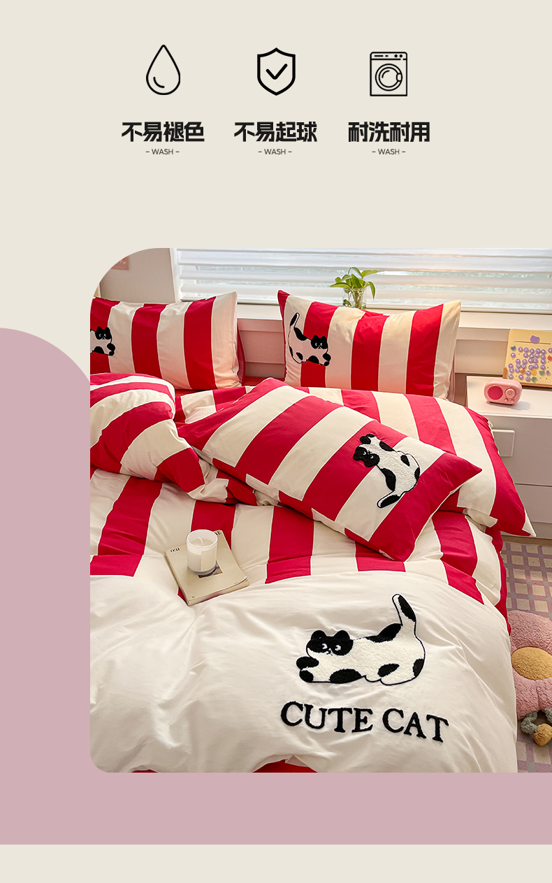 雅居纺家纺 2024新款全棉拼接贴布绣绣花四件套 竖条红猫咪