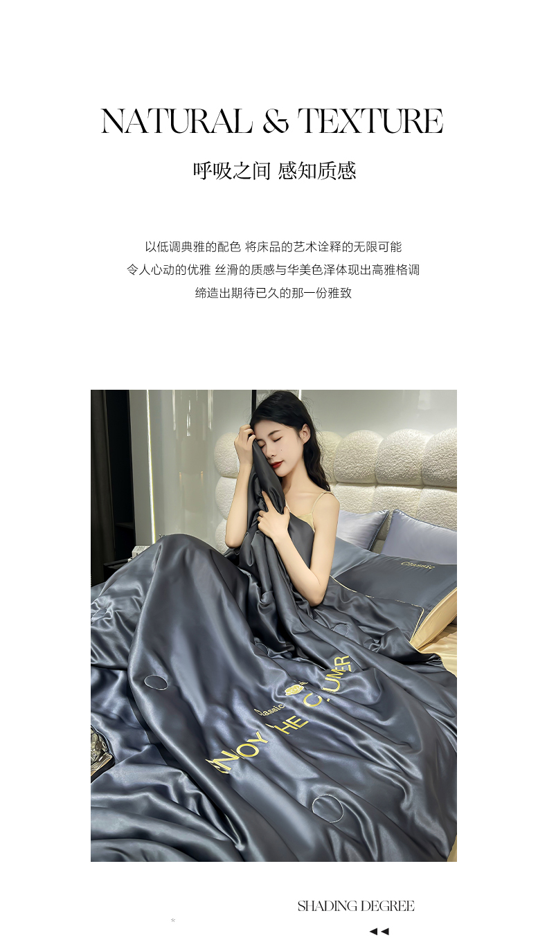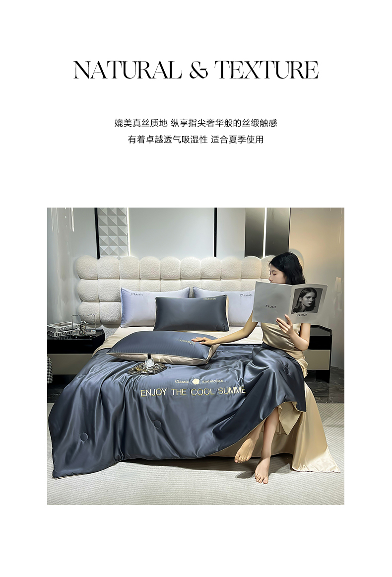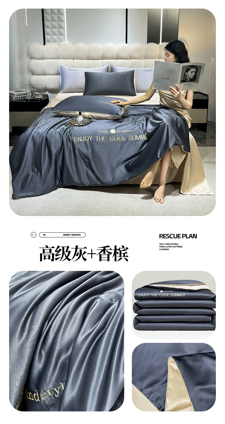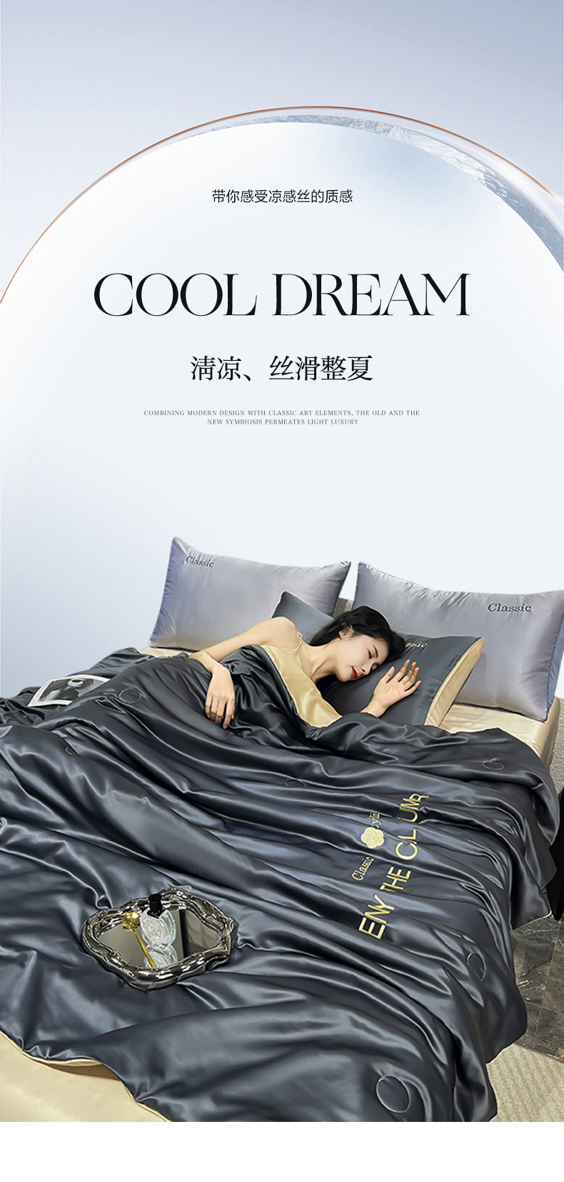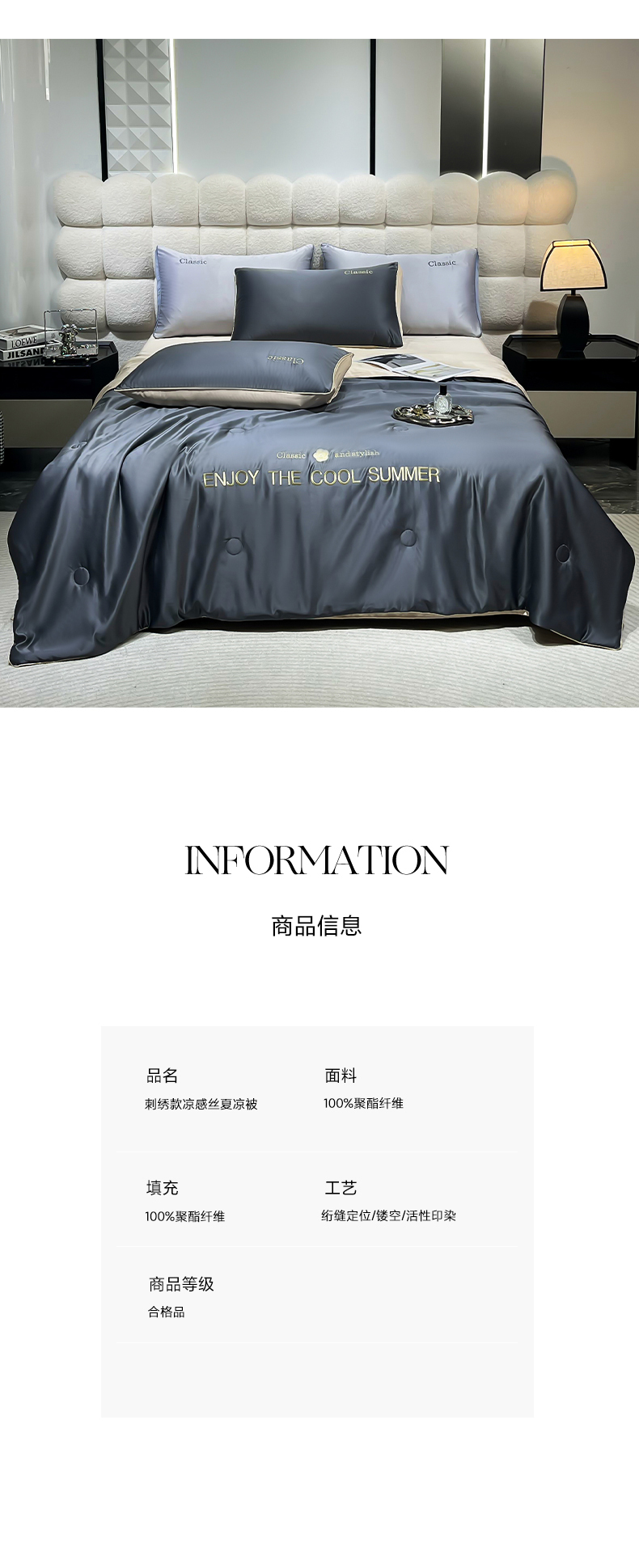 • 91家纺网 家纺一手货源 找家纺 梦镜家纺 2025新款凉感丝刺绣系列夏被 高级灰+香槟