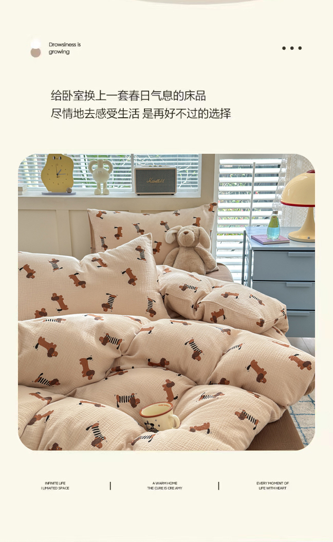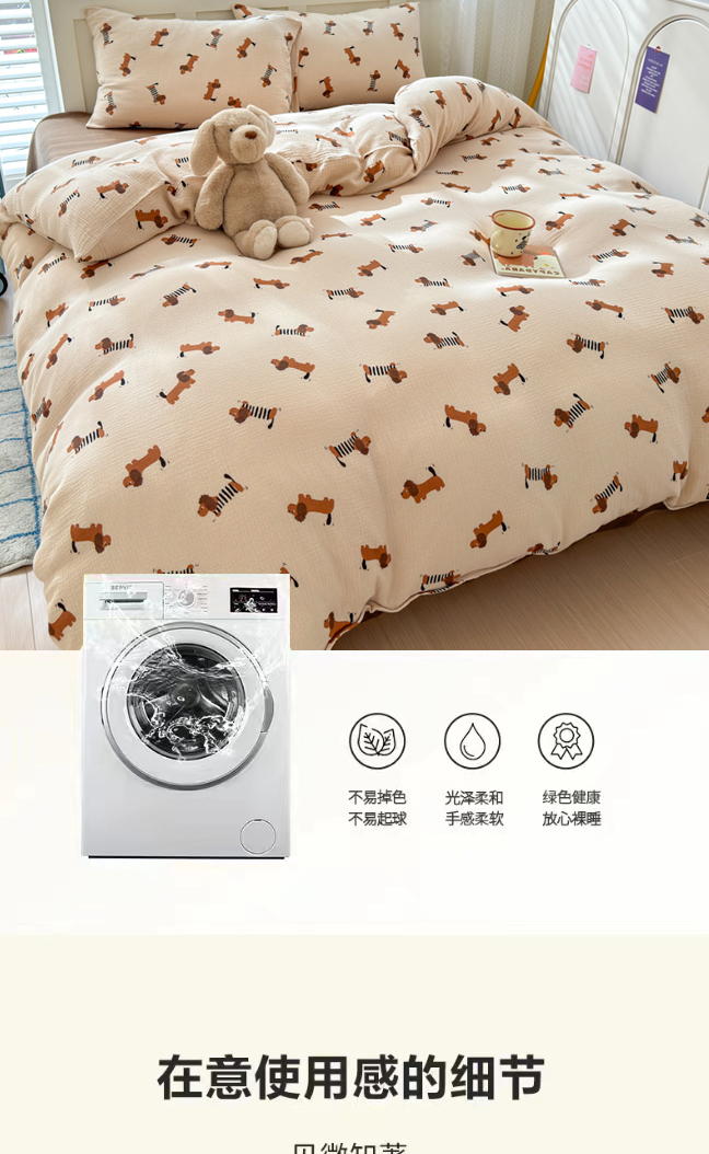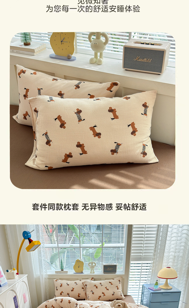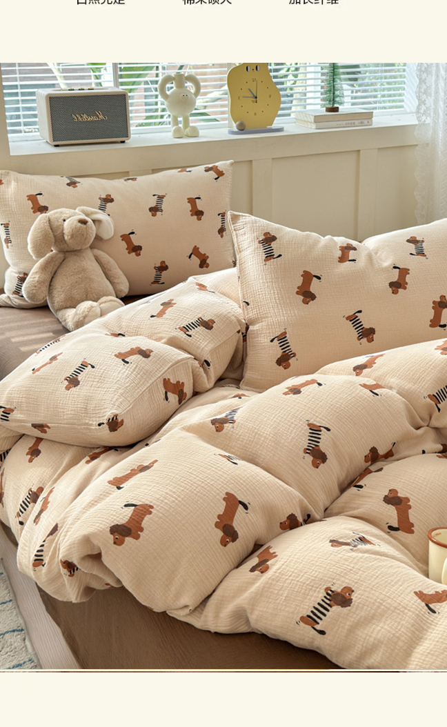 商品名称:山舍2024新款母婴级全棉双层纱印花四件套 腊肠狗