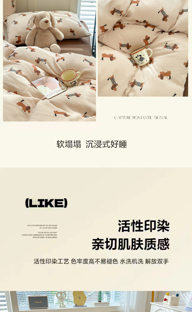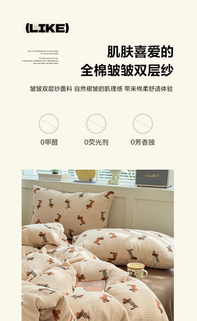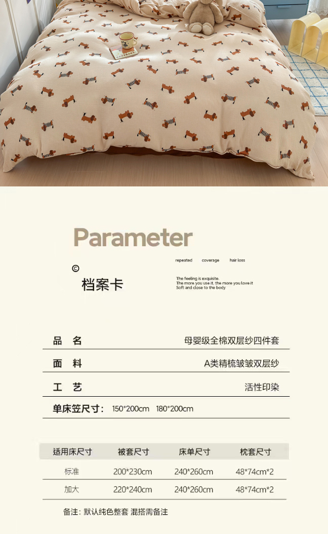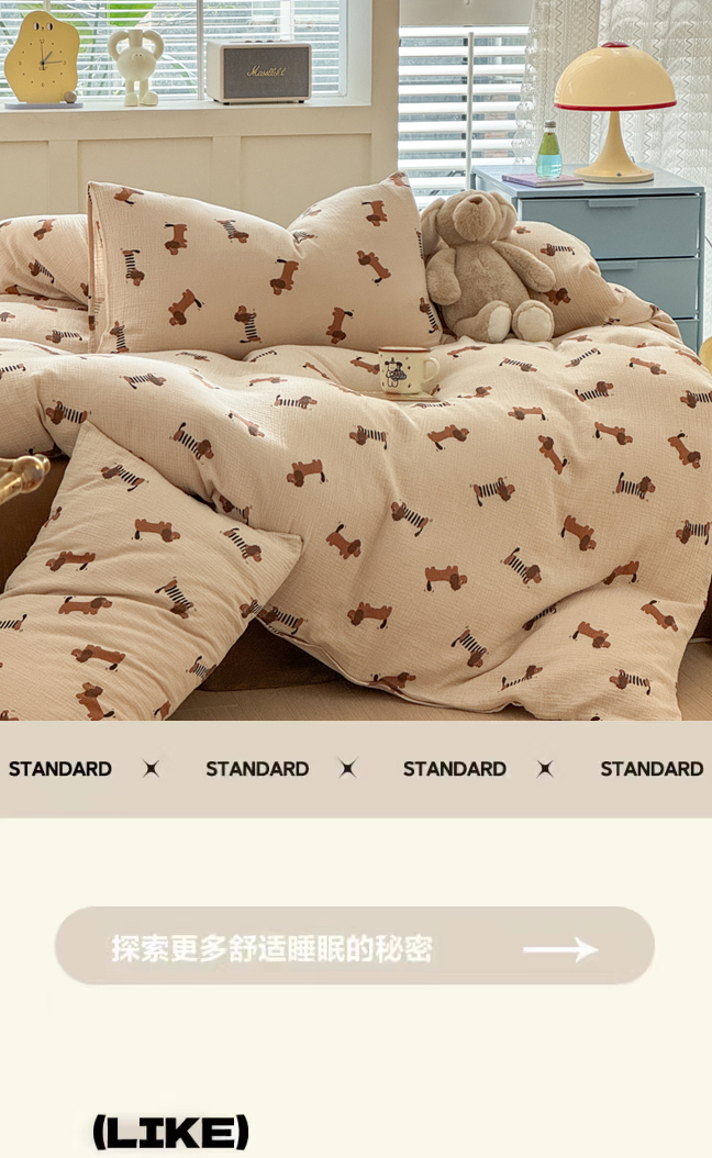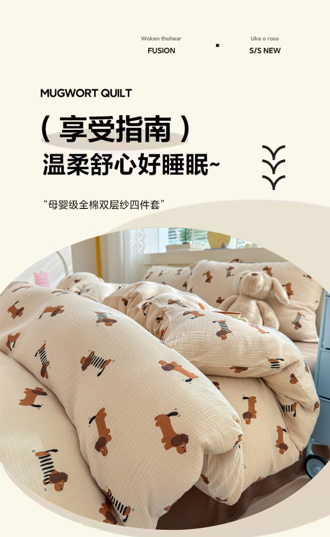 商品名称:山舍2024新款母婴级全棉双层纱印花四件套 腊肠狗