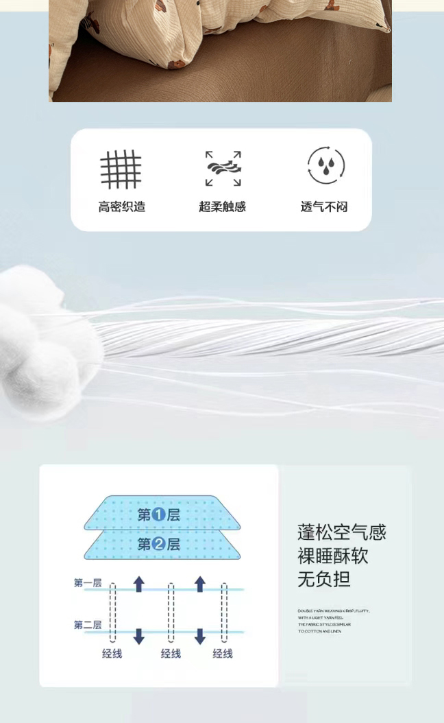 (总)山舍家居 2022新款双层纱布四件套,莱茵蓝,清绿,透白,雅灰,芥黄,裸粉,茶卡,甜白,星蓝,摩卡