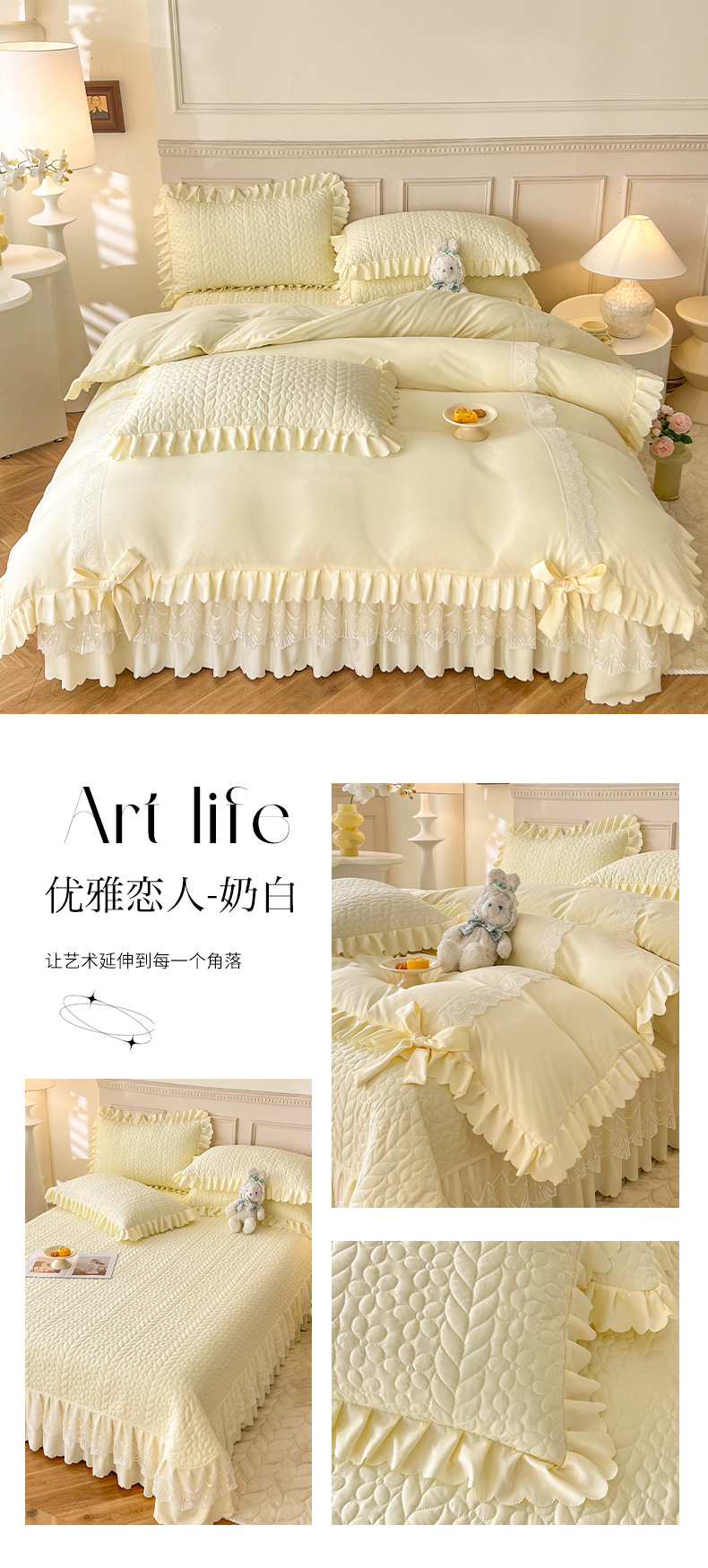 商品名称:唐人居 2025新款韩式花边蝴蝶结床盖四件套-优雅恋人 优雅恋人-奶白