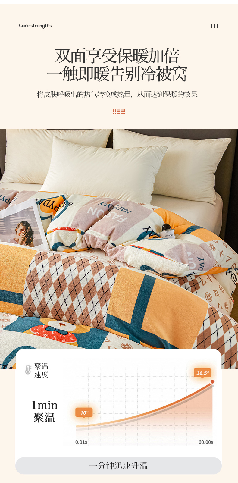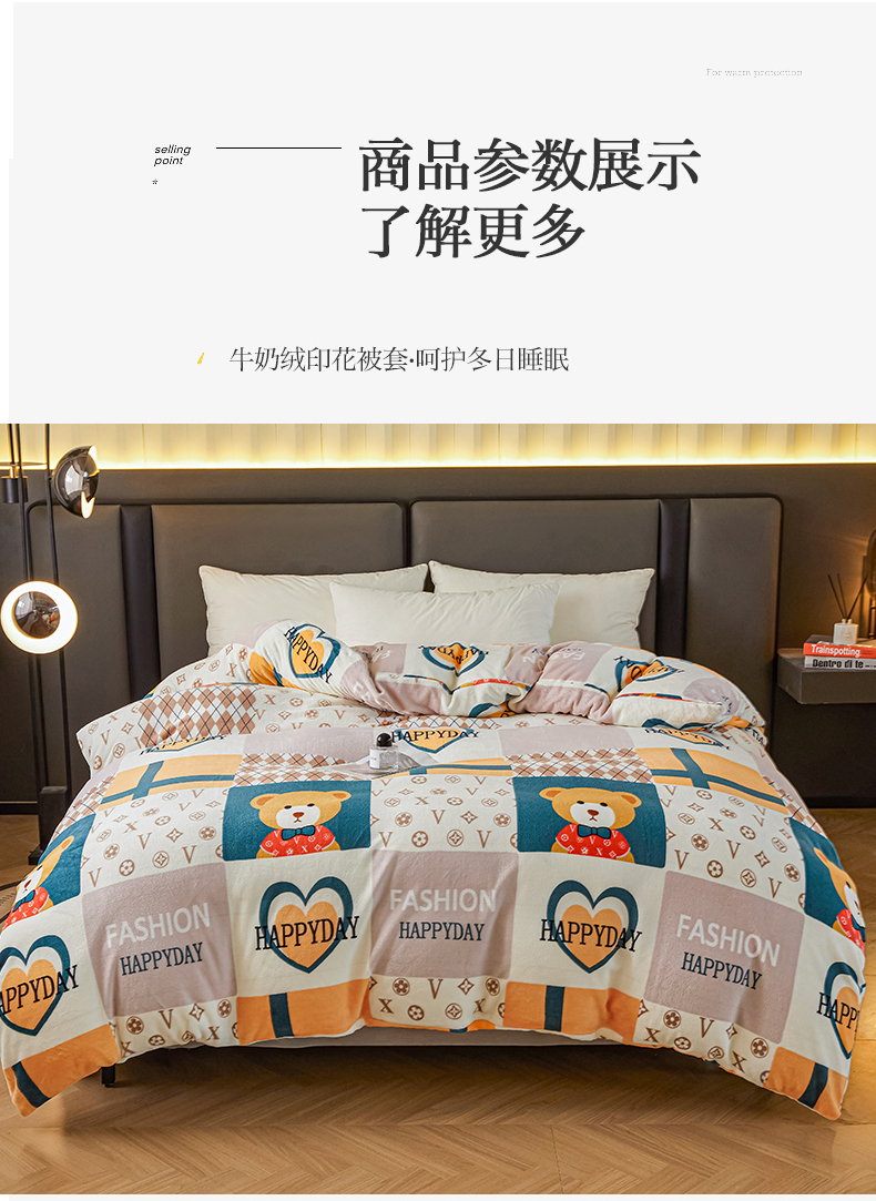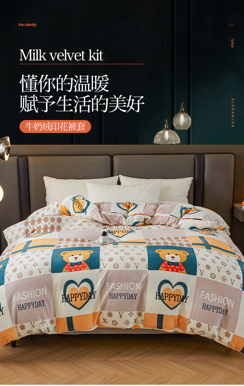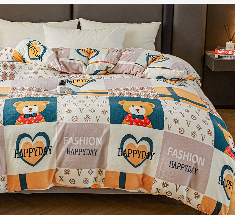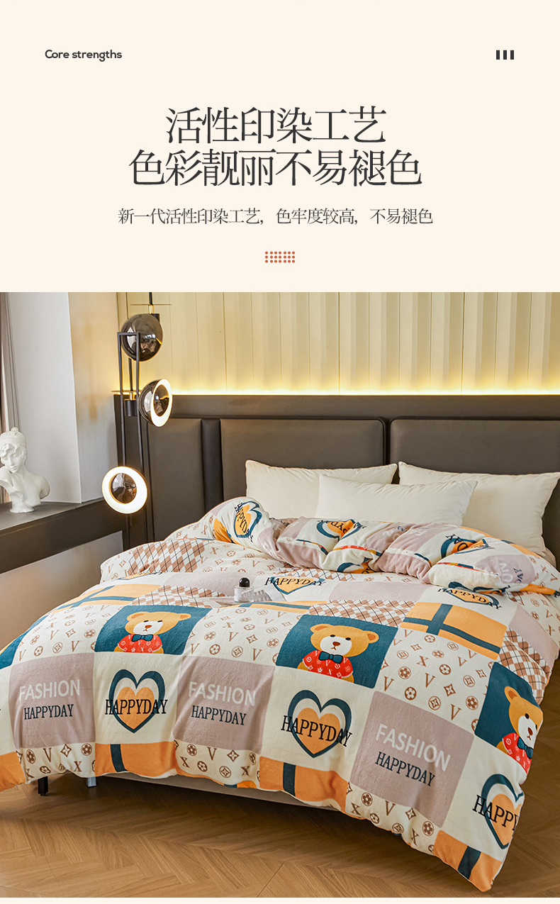 商品名称:董韵家纺 2025新款高克重全消光牛奶绒法莱绒金貂绒印花单品被套床裙四件套(提供买家秀) 呆呆萝莉熊