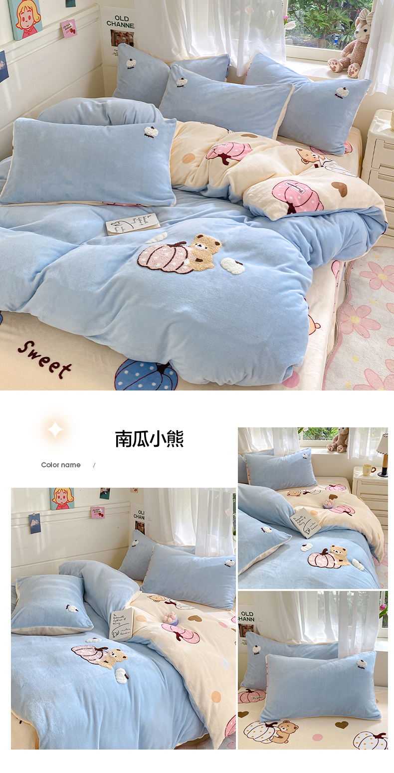 商品名称:莱米家纺 2024新款牛奶绒毛巾绣绣花四件套 南瓜小熊