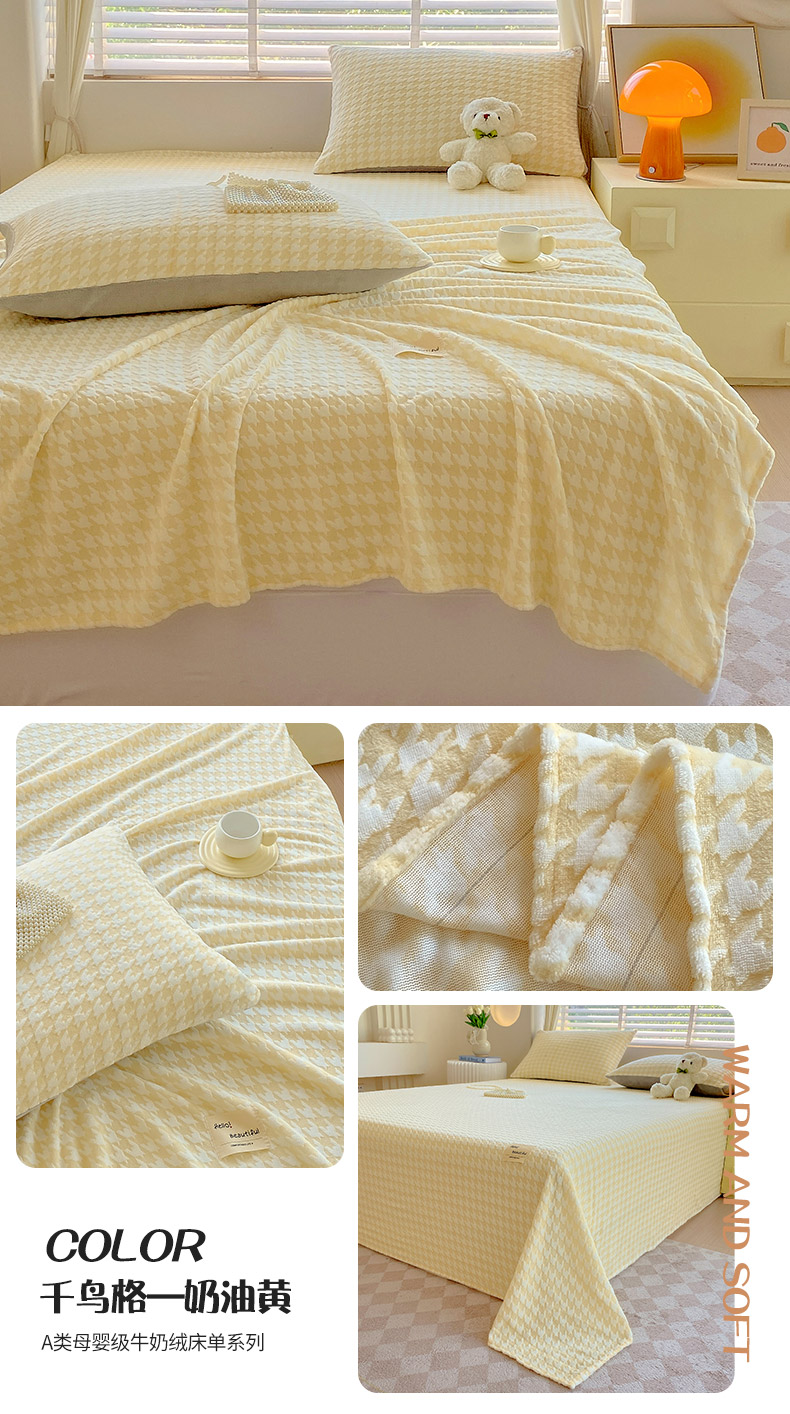 莱米家纺 2024新款秋冬华夫格加密千鸟格牛奶绒床单 千鸟格-奶油黄