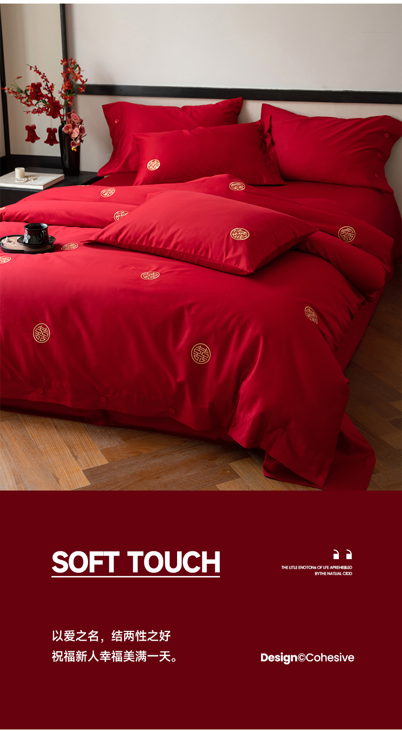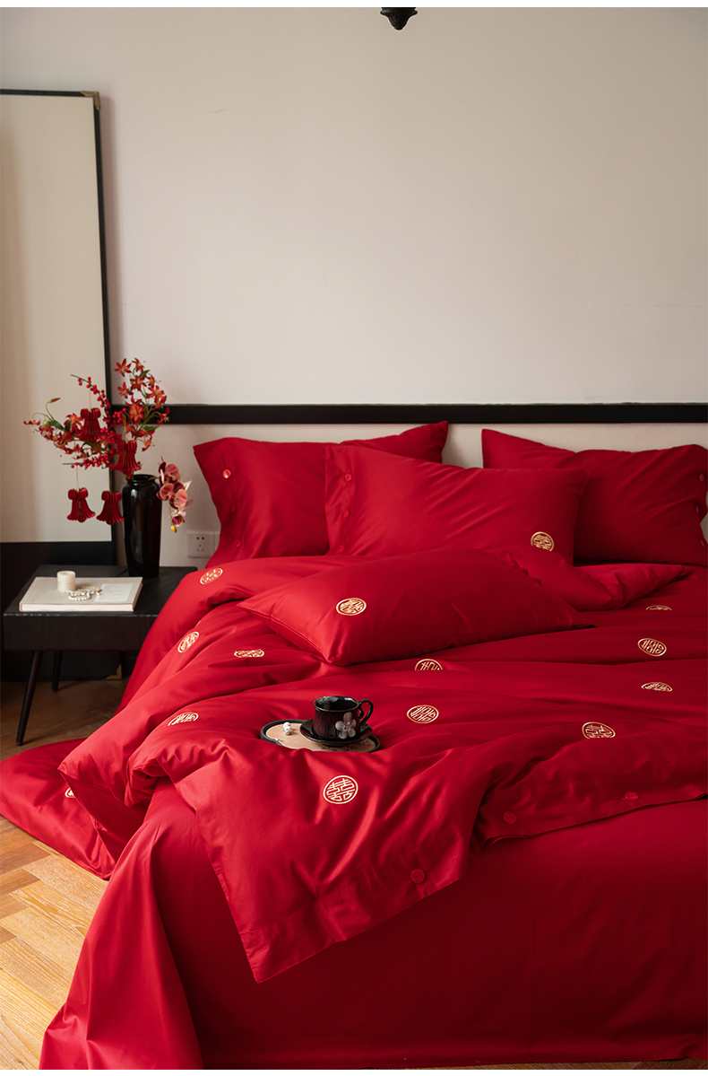 华超针织 2024新款100支长绒棉刺绣婚庆四件套 同喜同喜