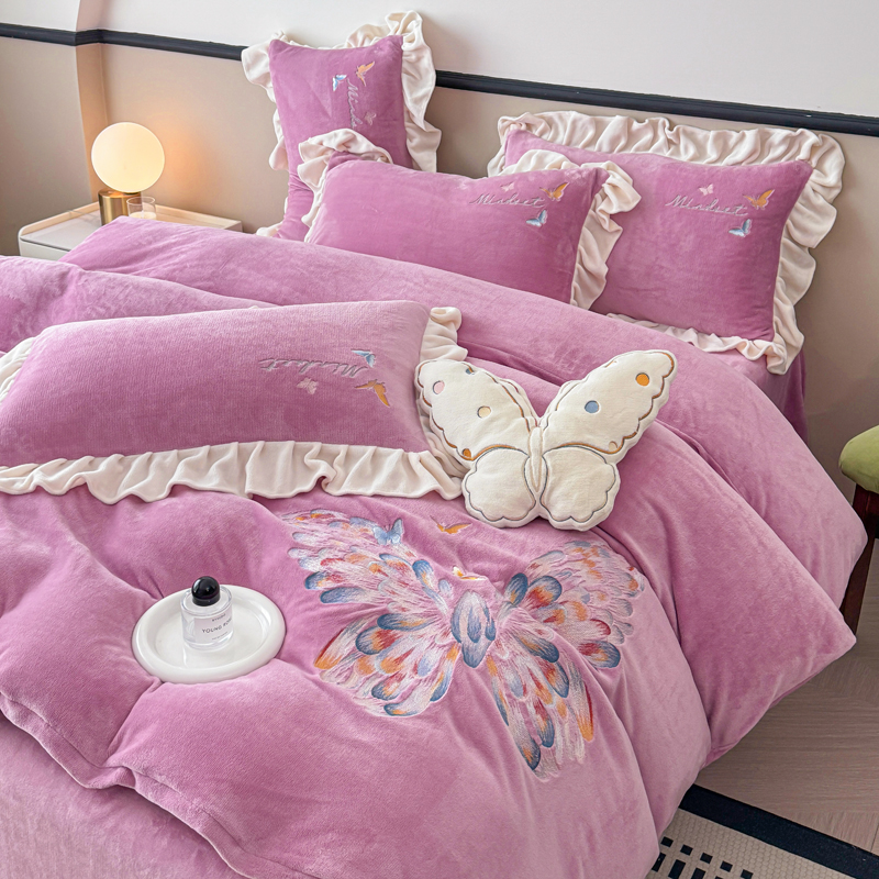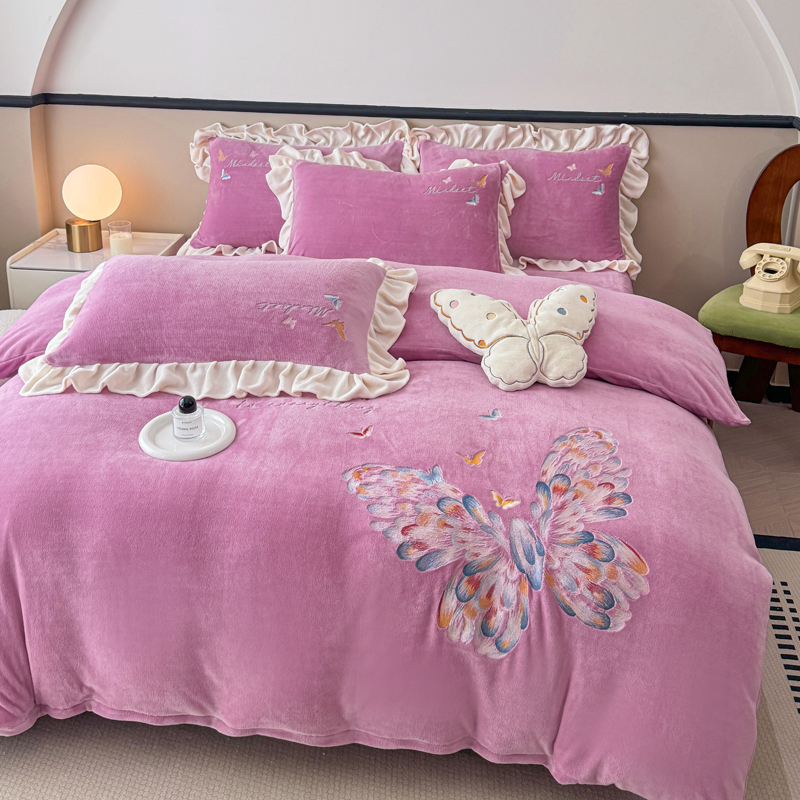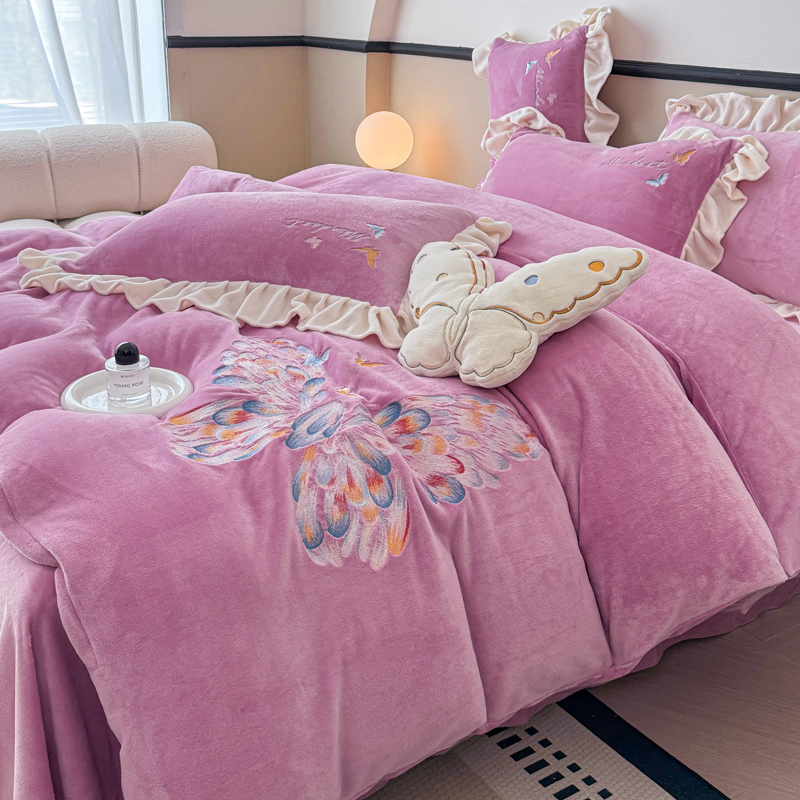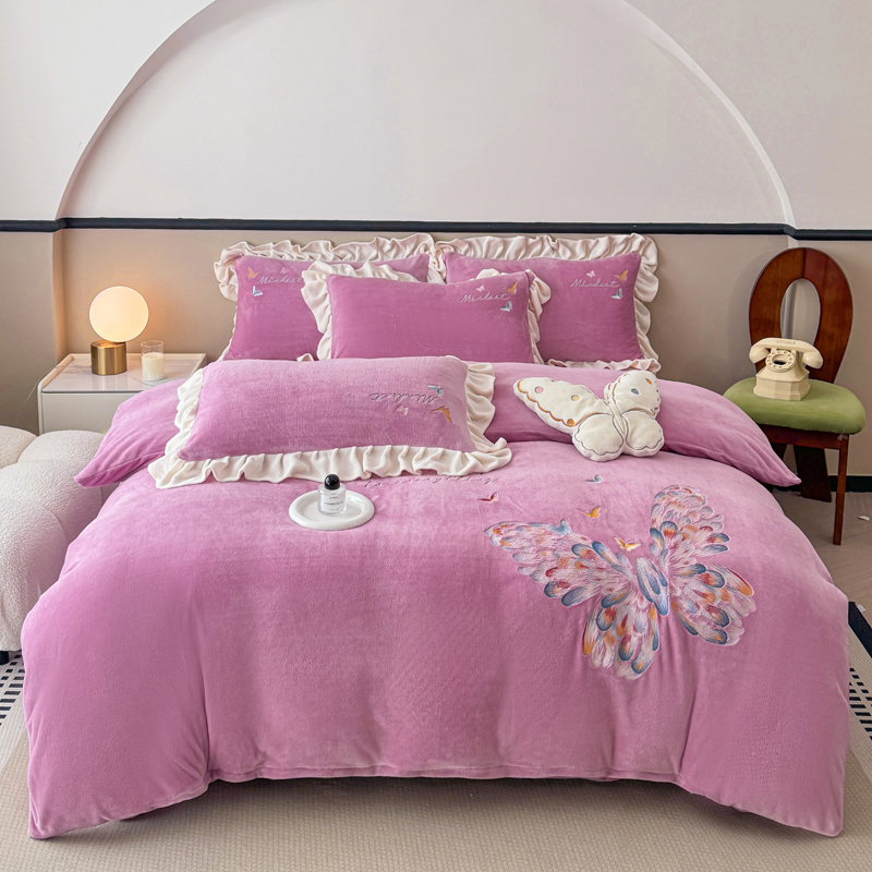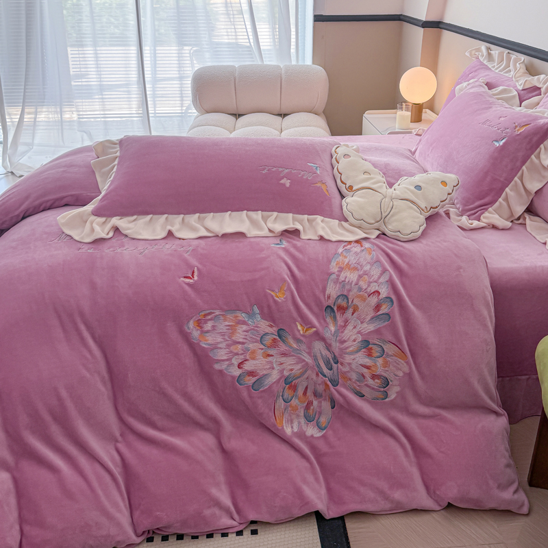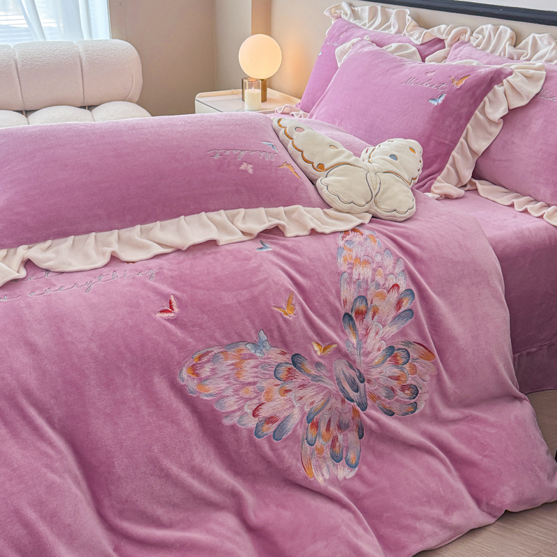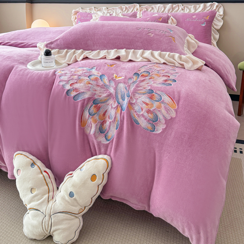商品名称:橘子家 2024新款牛奶绒绣花四件套-蝶舞 蝶舞-豆沙