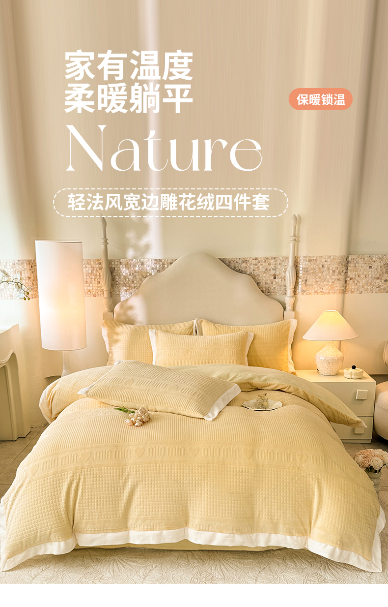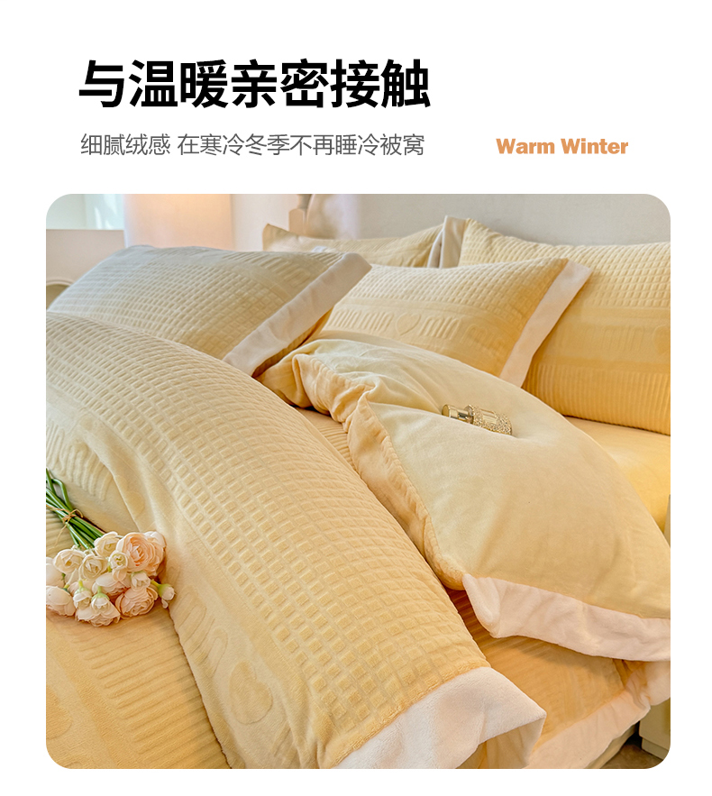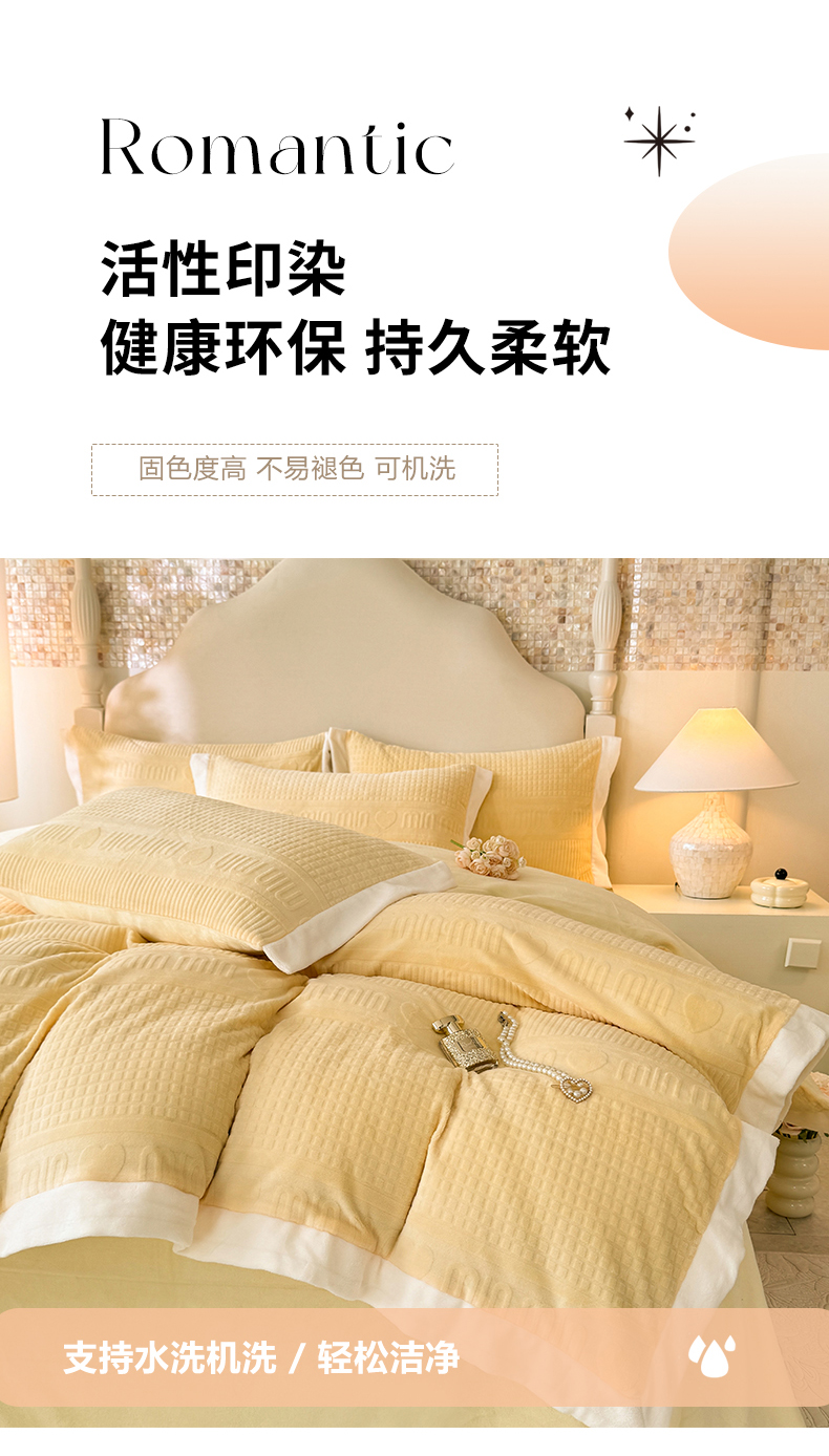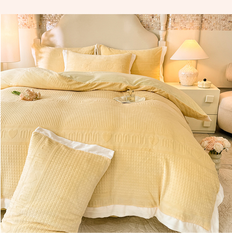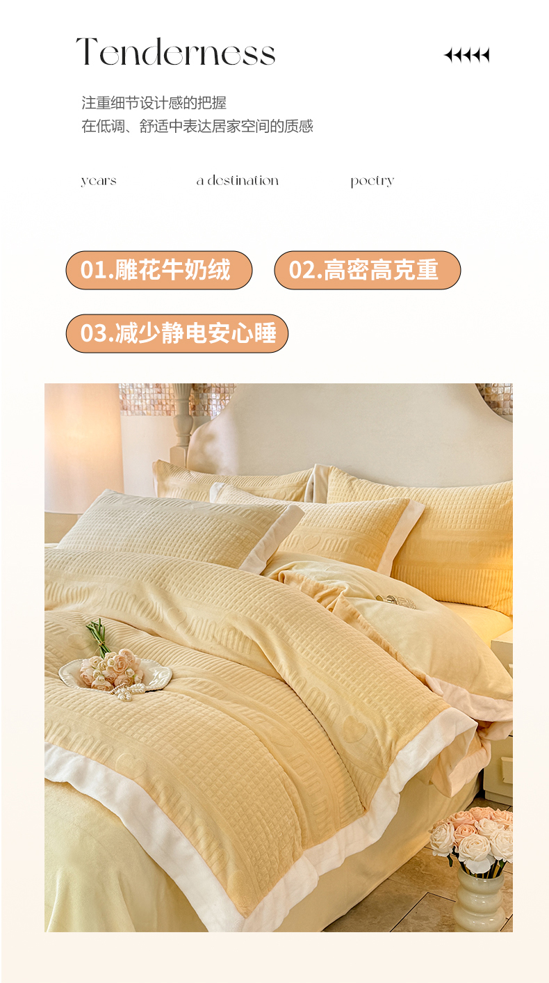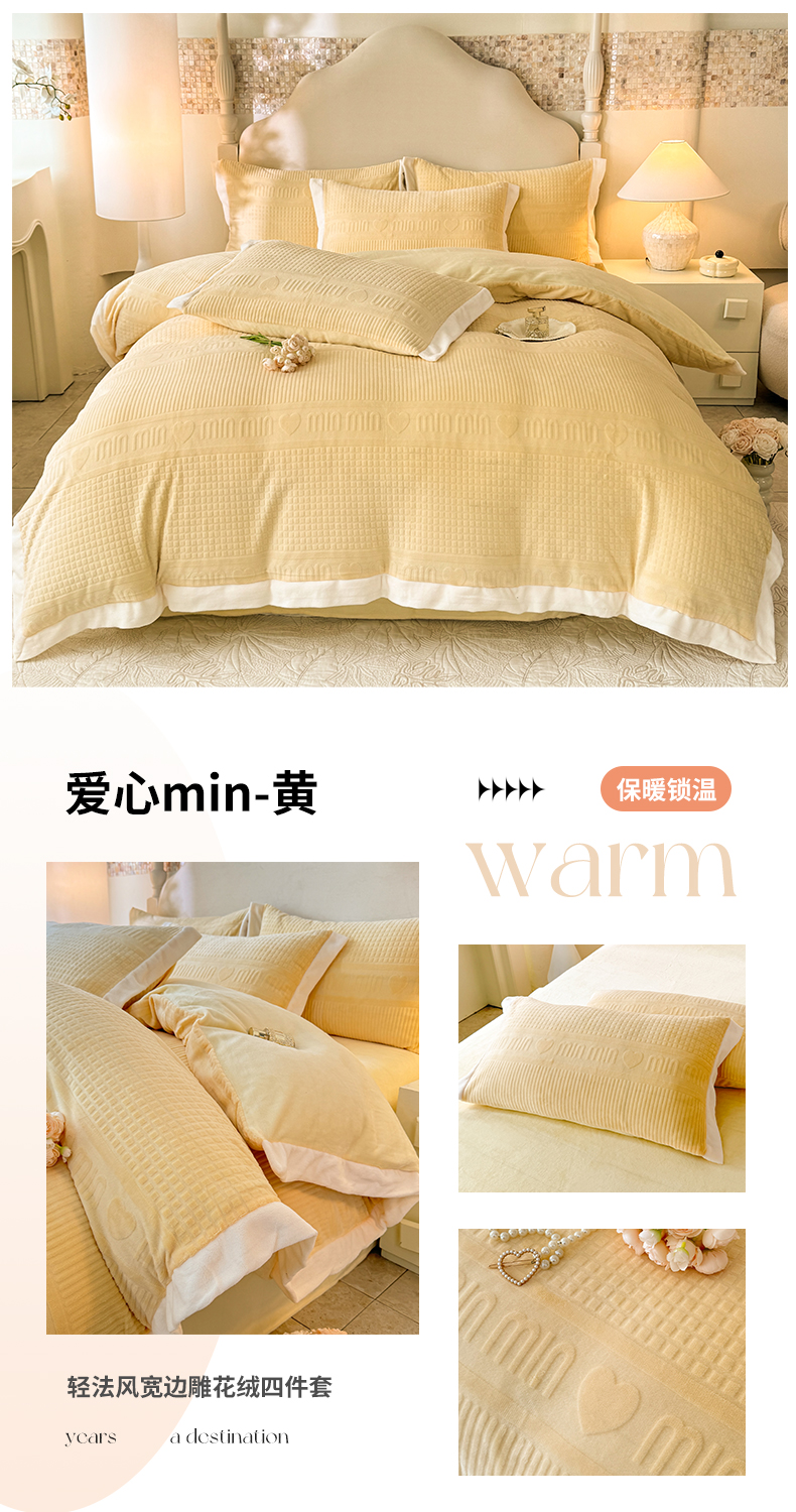 商品名称:捌月 2025新款轻法风宽边雕花牛奶绒四件套提花牛奶绒加厚保暖绒套件直播新品 爱心min-黄