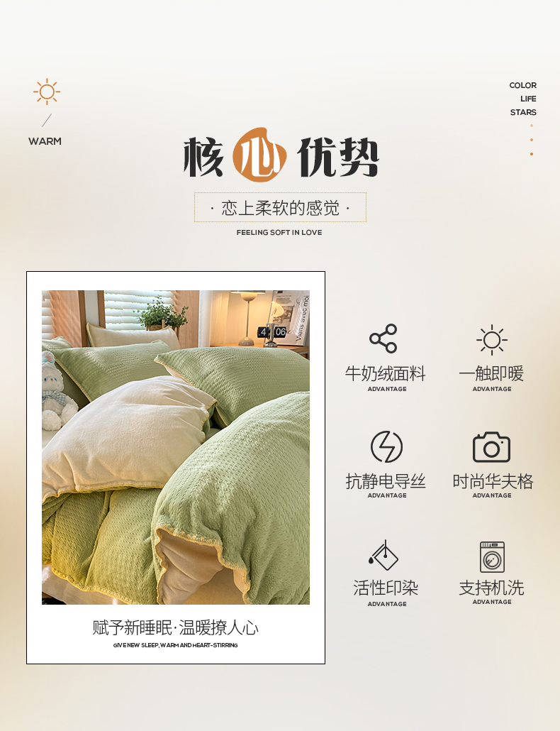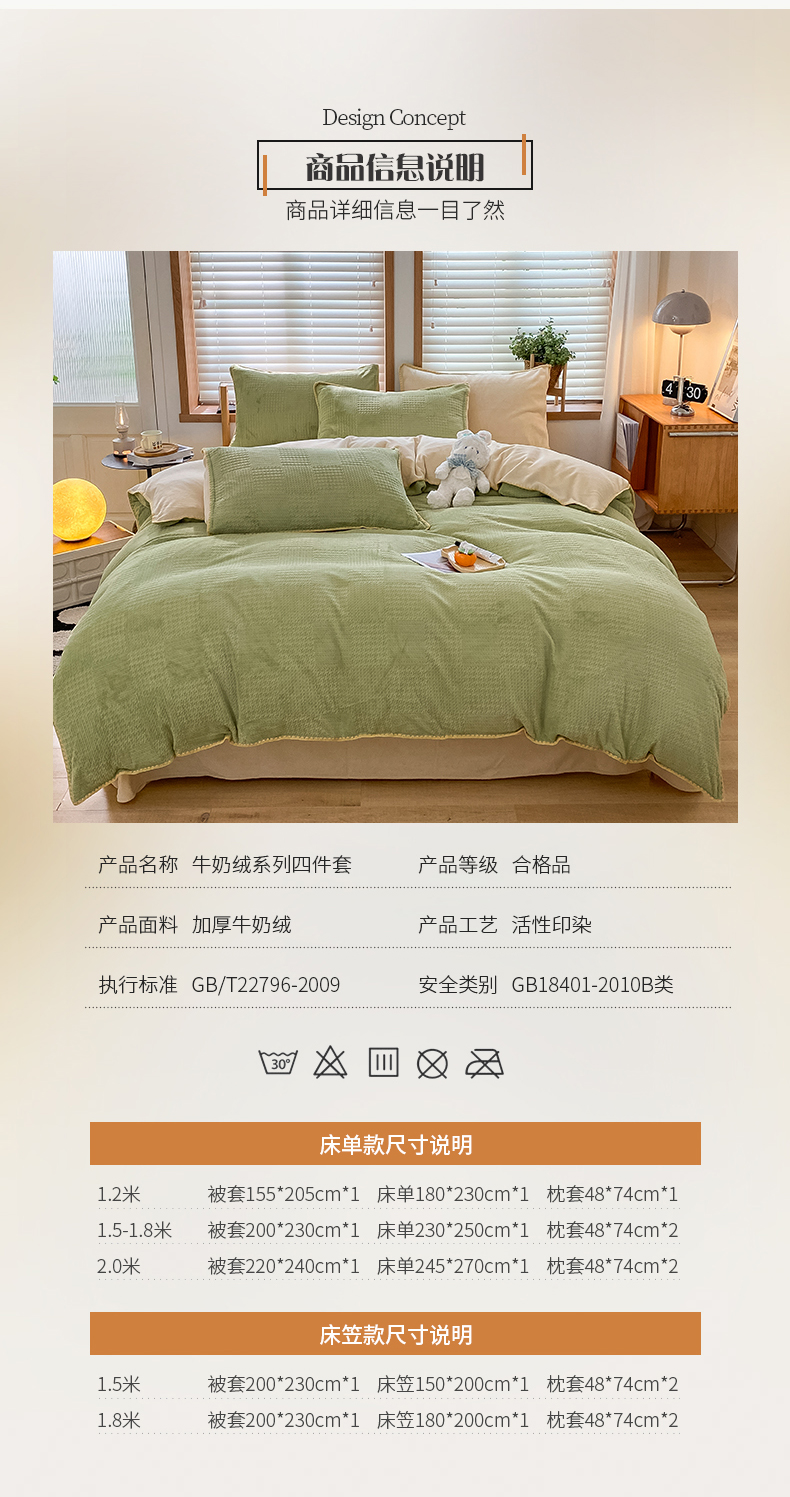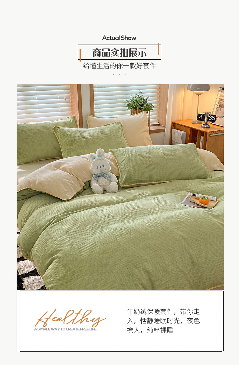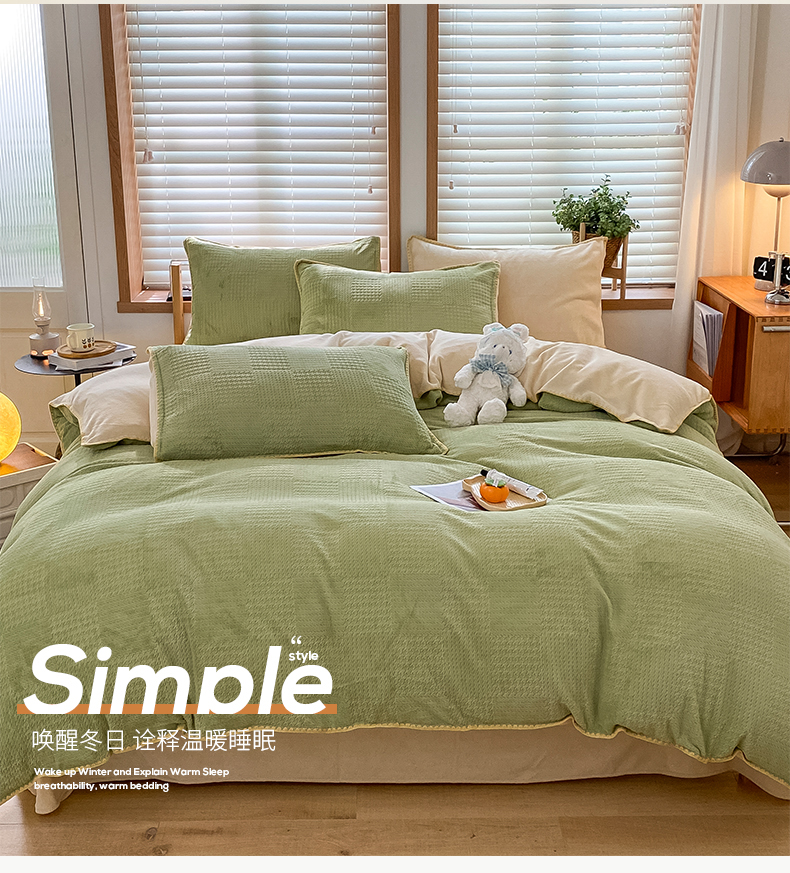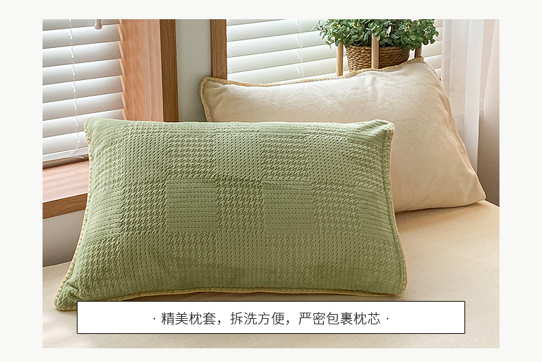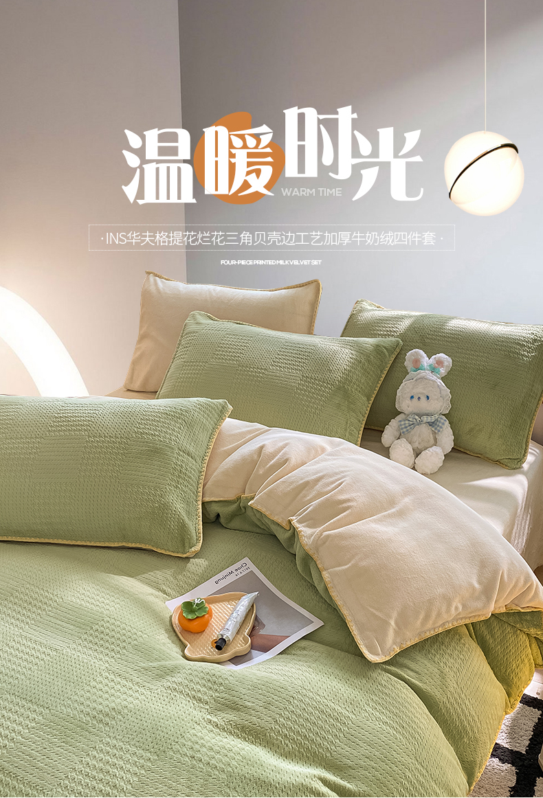当前位置: 91家纺网 > 商品网购 > 床品套件 > 四件套 > 牛奶绒四件套 > 桃子家居 2024新款A类无印ins华夫格提花烂花雕花剪花三角贝壳边工艺加厚牛奶绒四件套单品 绒华夫格-绿黄