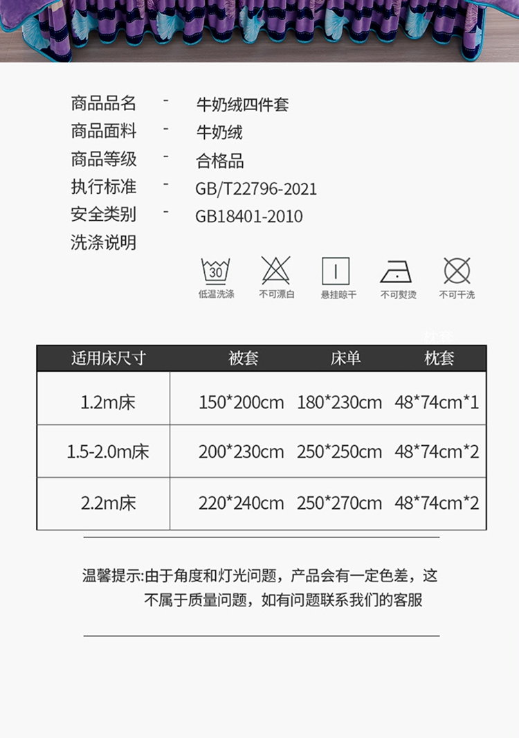 3、通州区市场监督局友情提醒,近期涉及到床上用品不褪色不掉毛不缩水的投诉和以世界知名品牌图案为面料的床品举报较多。请各商家自检自查,对照整改或进行下架处理。