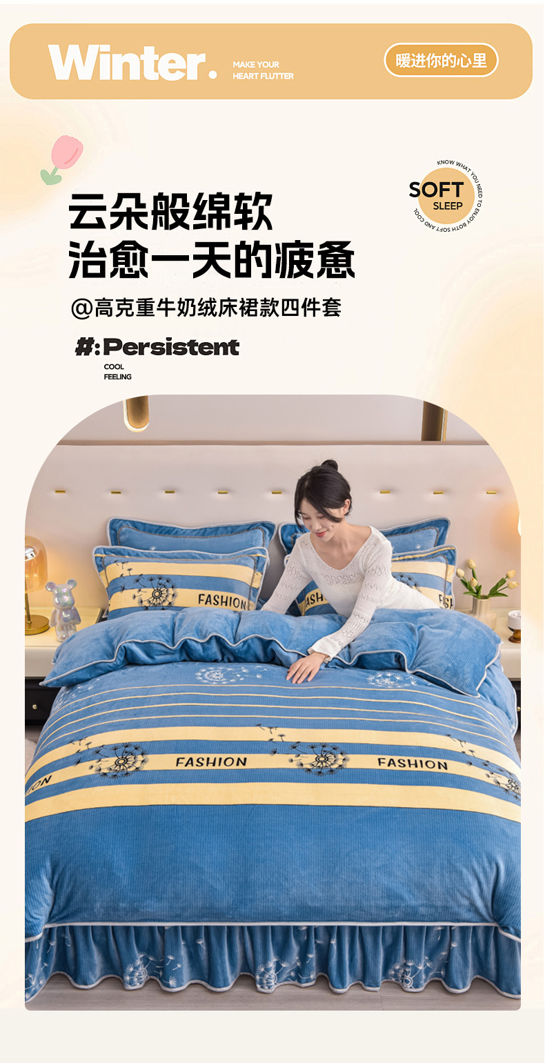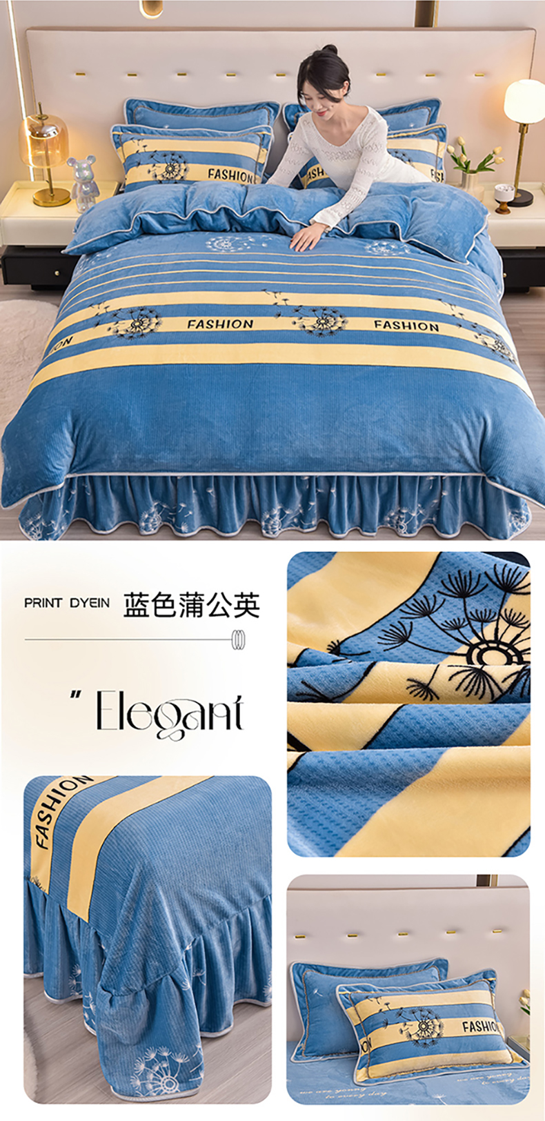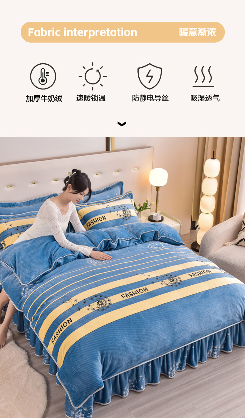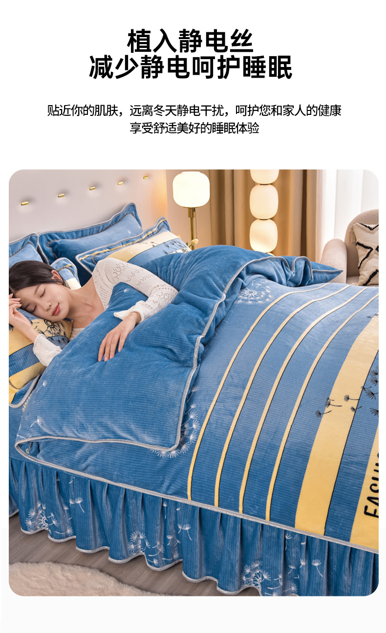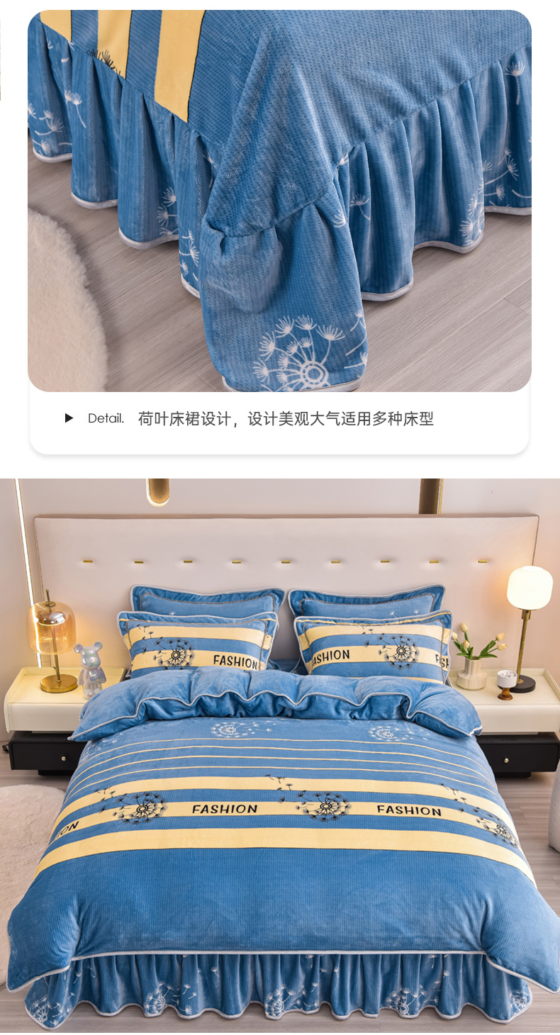商品名称:晚静家纺 2024新款8.5斤牛奶绒金貂法莱绒床裙款保暖绒四件套 蓝色蒲公英