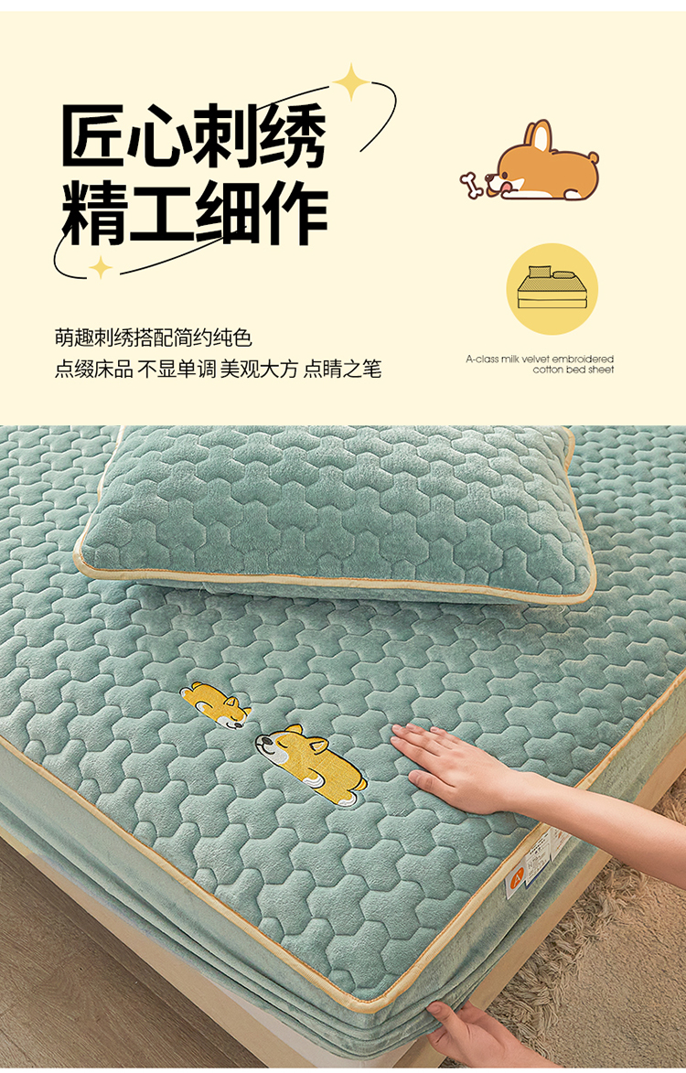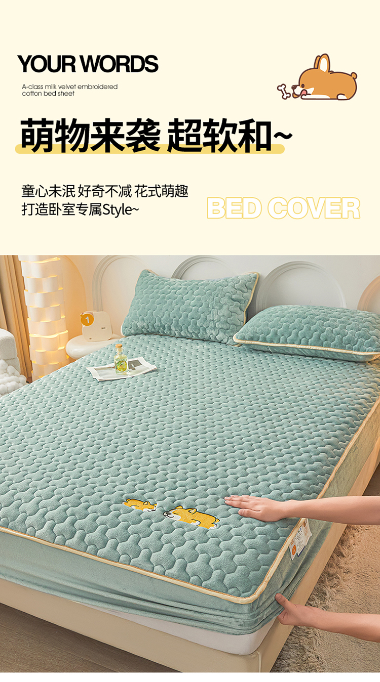 2024新款A类牛奶绒刺绣夹棉床笠-小柯基 小柯基-清新蓝