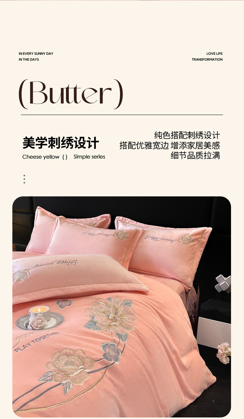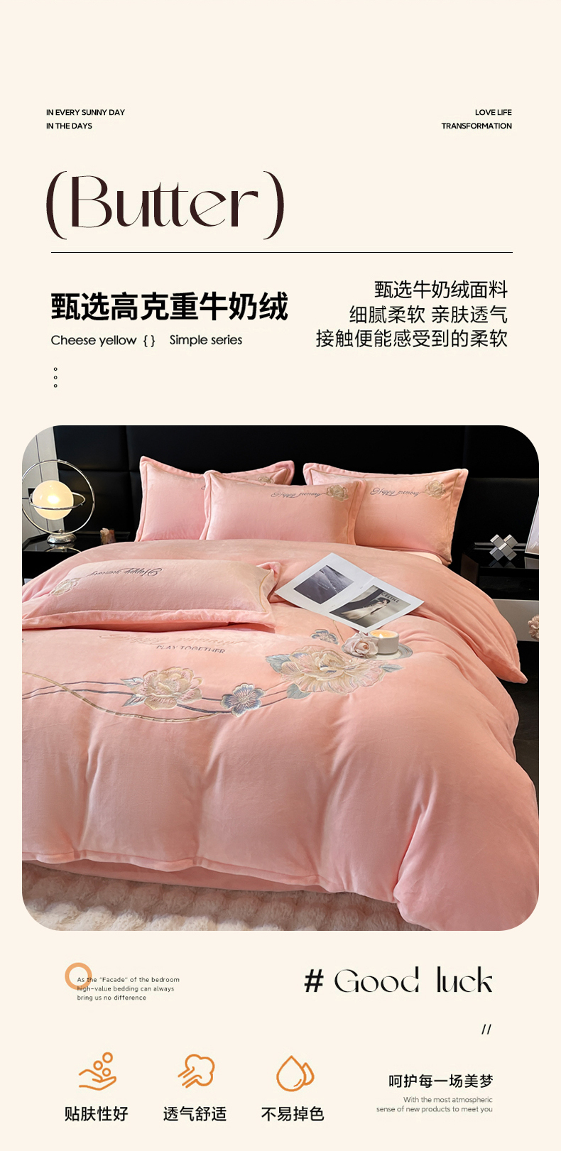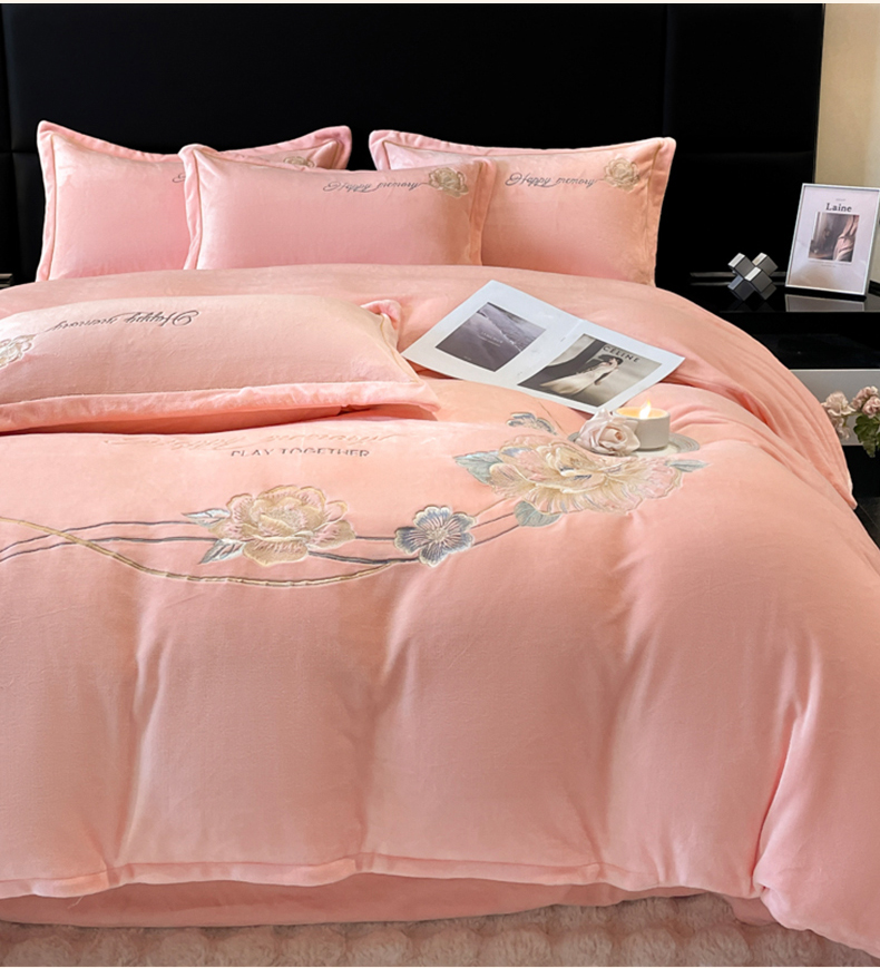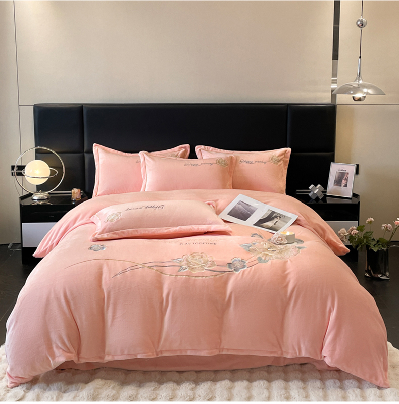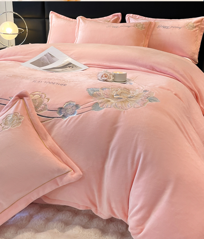 商品名称:畅畅家纺 2024秋冬新款牛奶绒绣花四件套 芳华-伊莉莎系列 芳华-浅粉