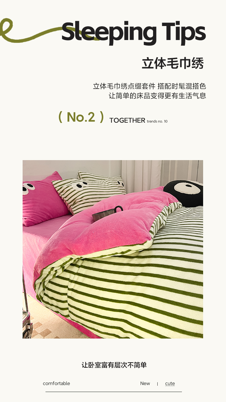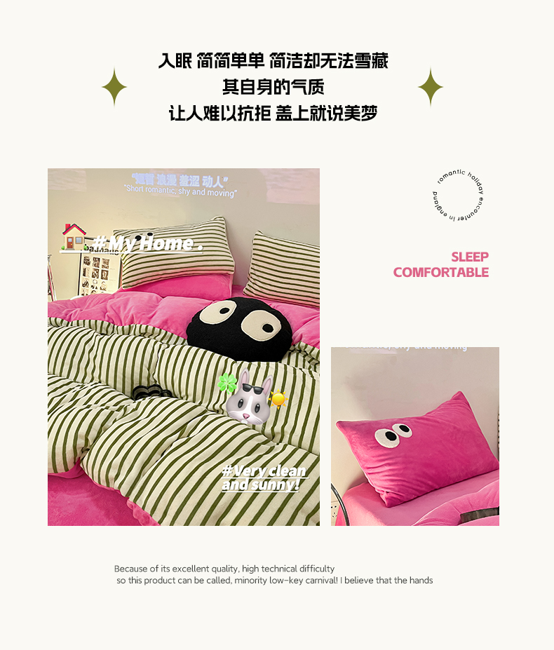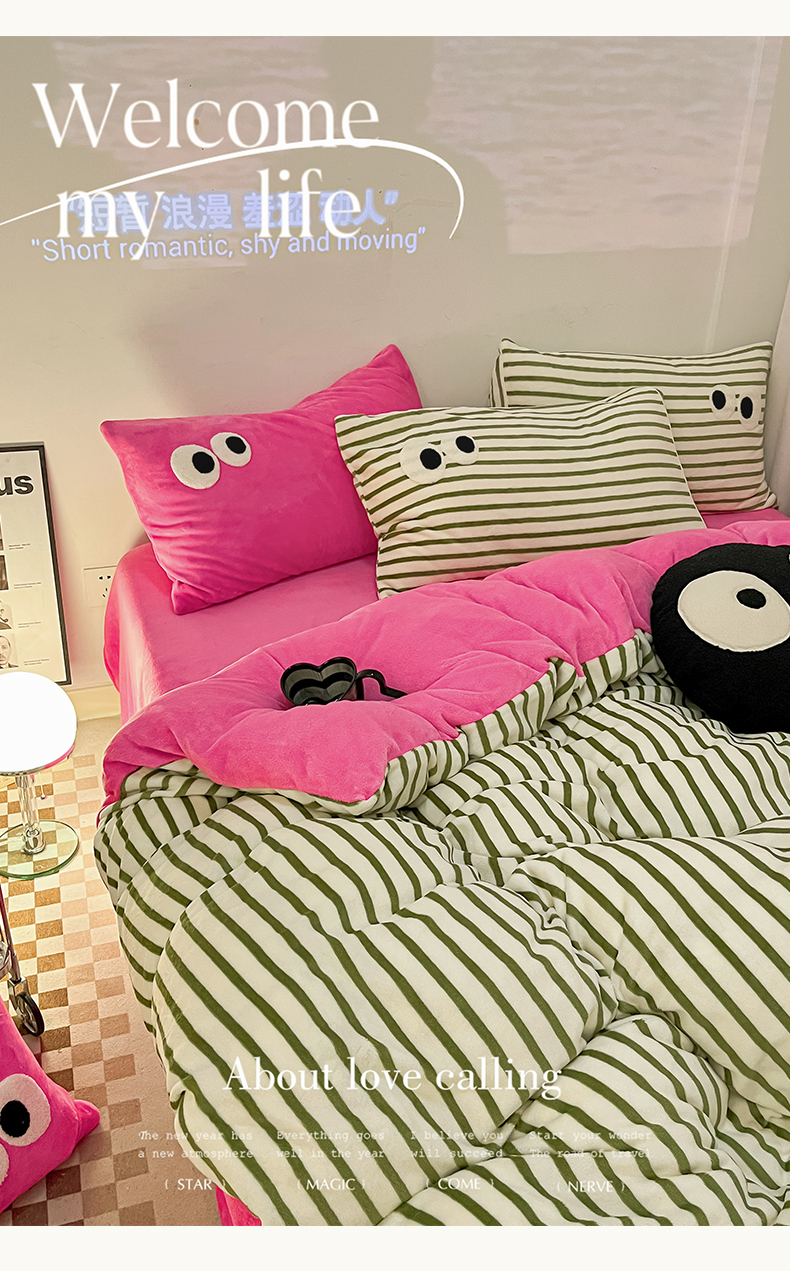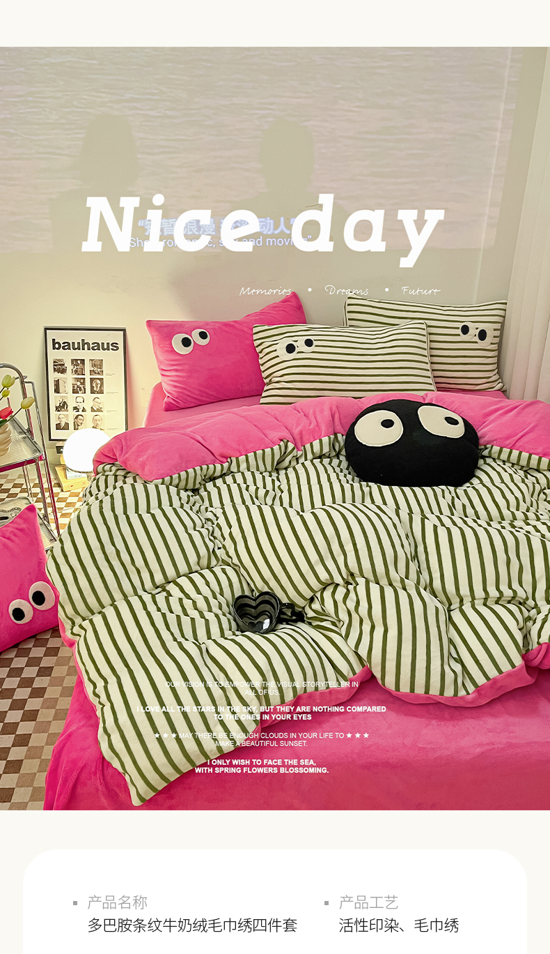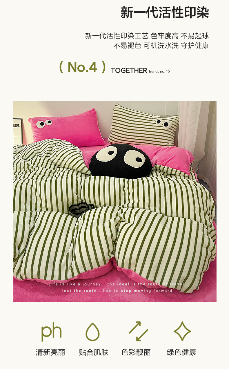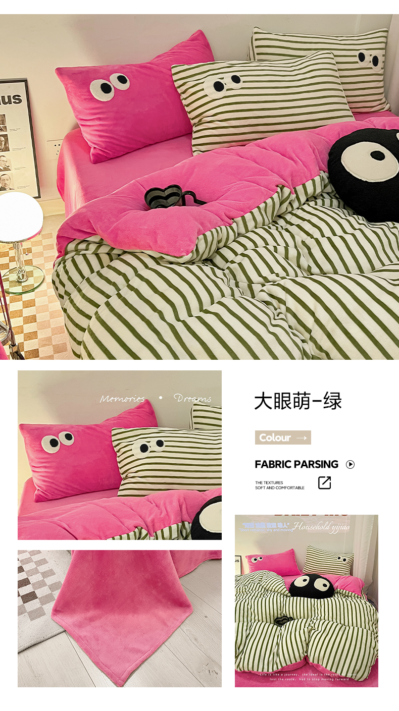 商品名称:如一 2024新款大眼萌条纹牛奶绒四件套 大眼萌-绿