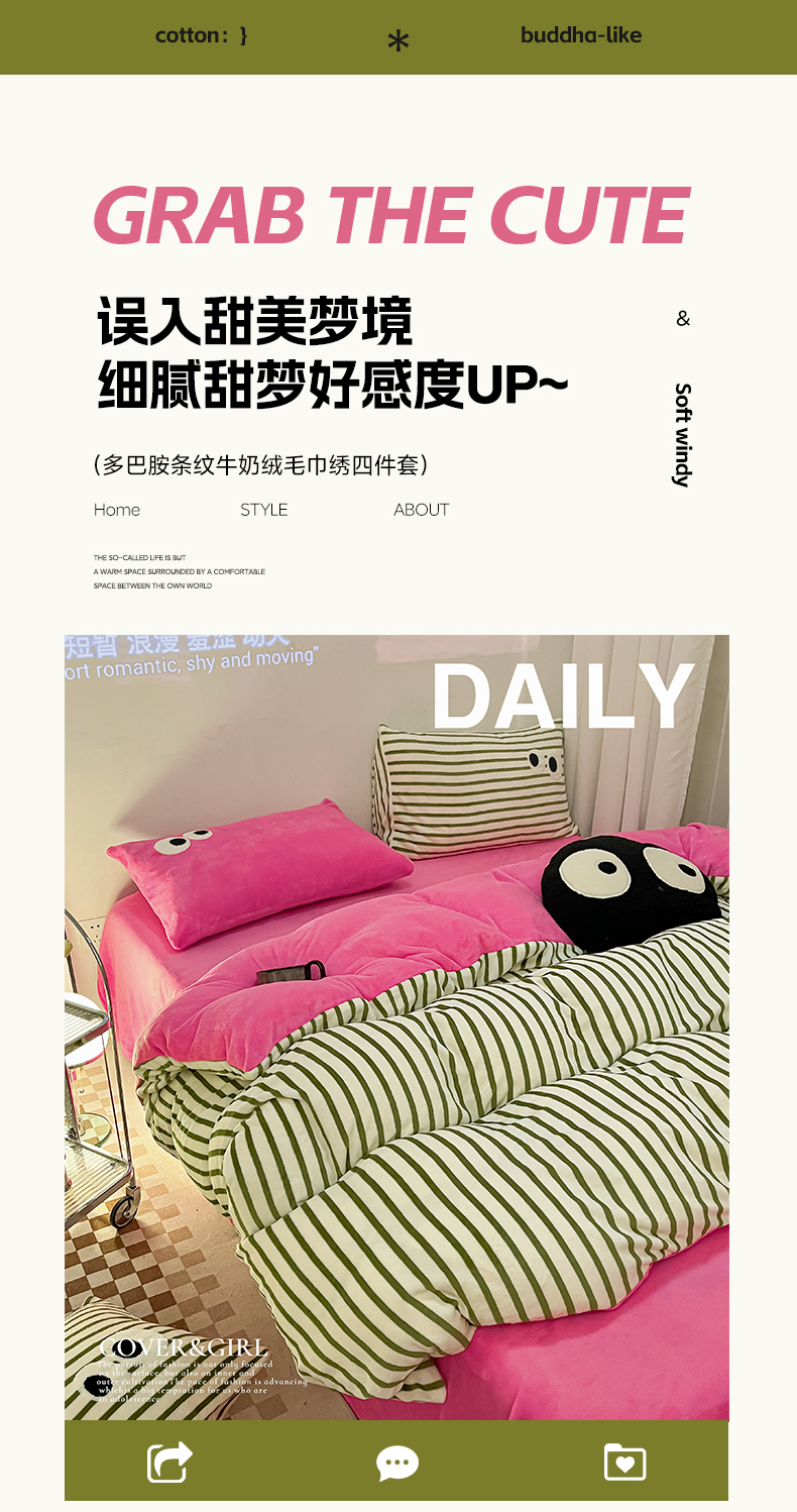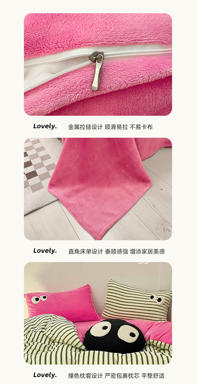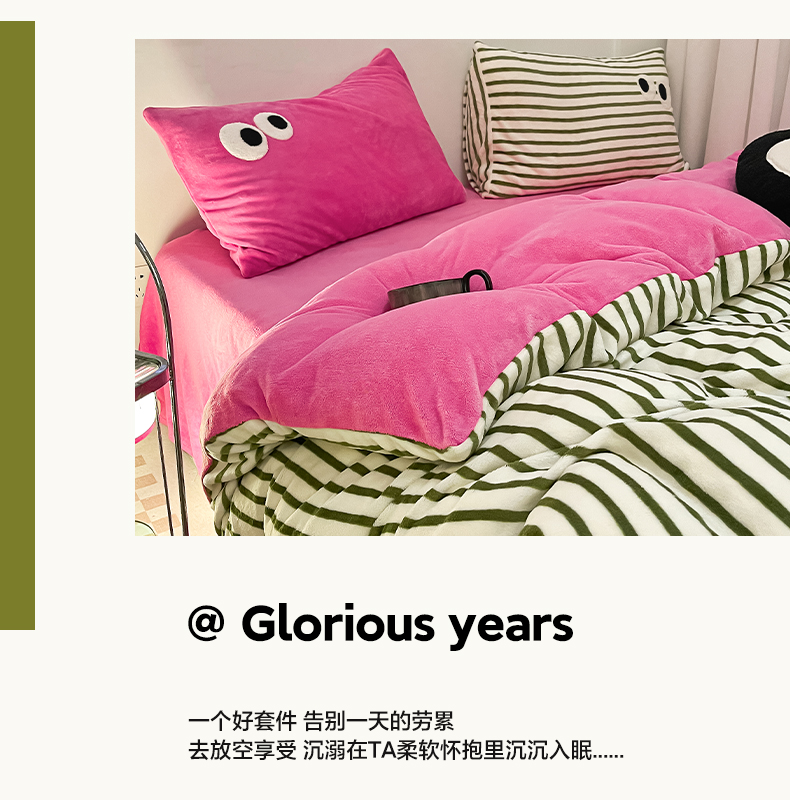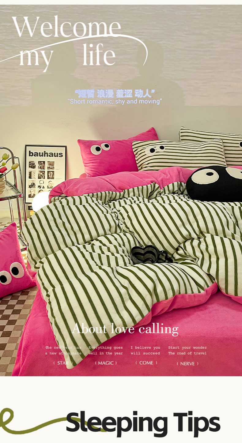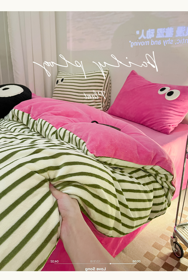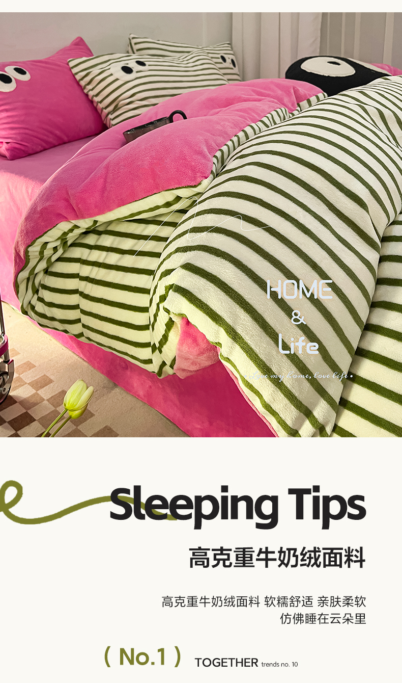 商品名称:如一 2024新款大眼萌条纹牛奶绒四件套 大眼萌-绿
