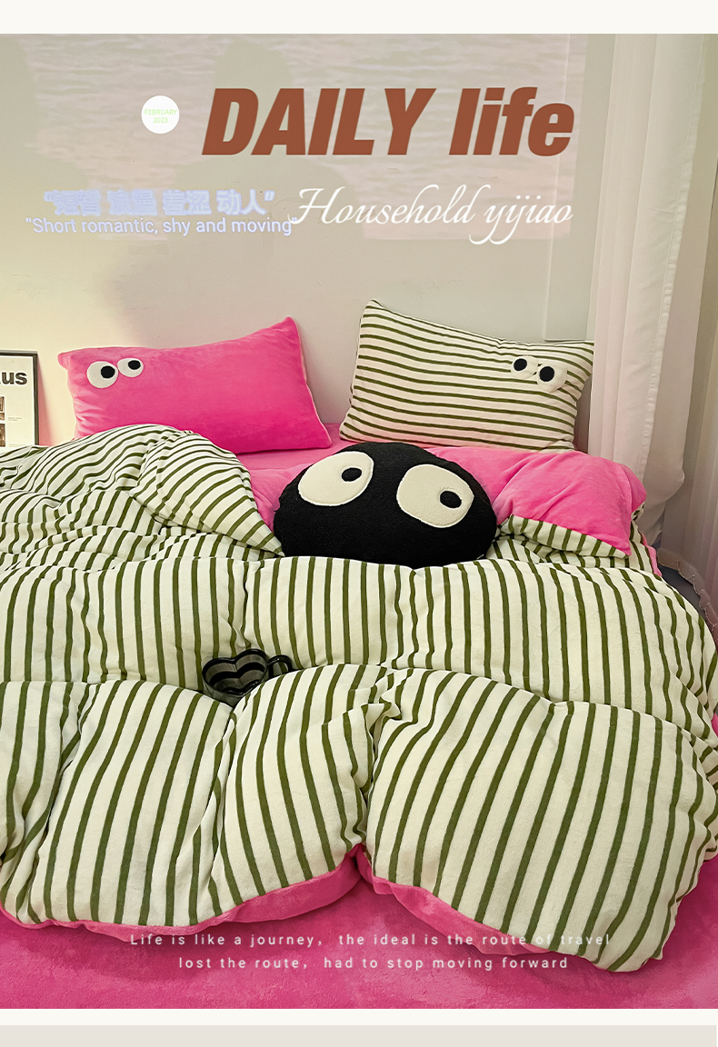 如一 2024新款大眼萌条纹牛奶绒四件套 大眼萌-绿