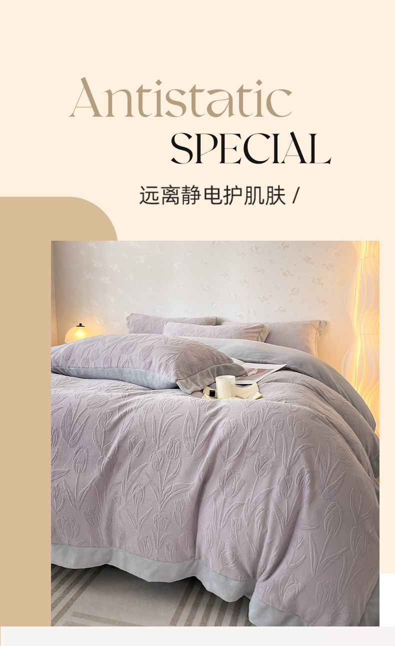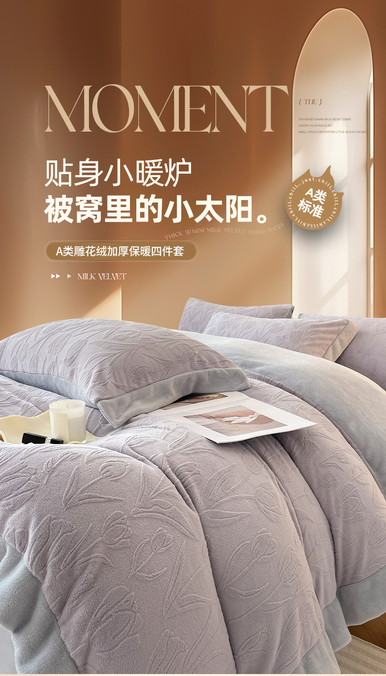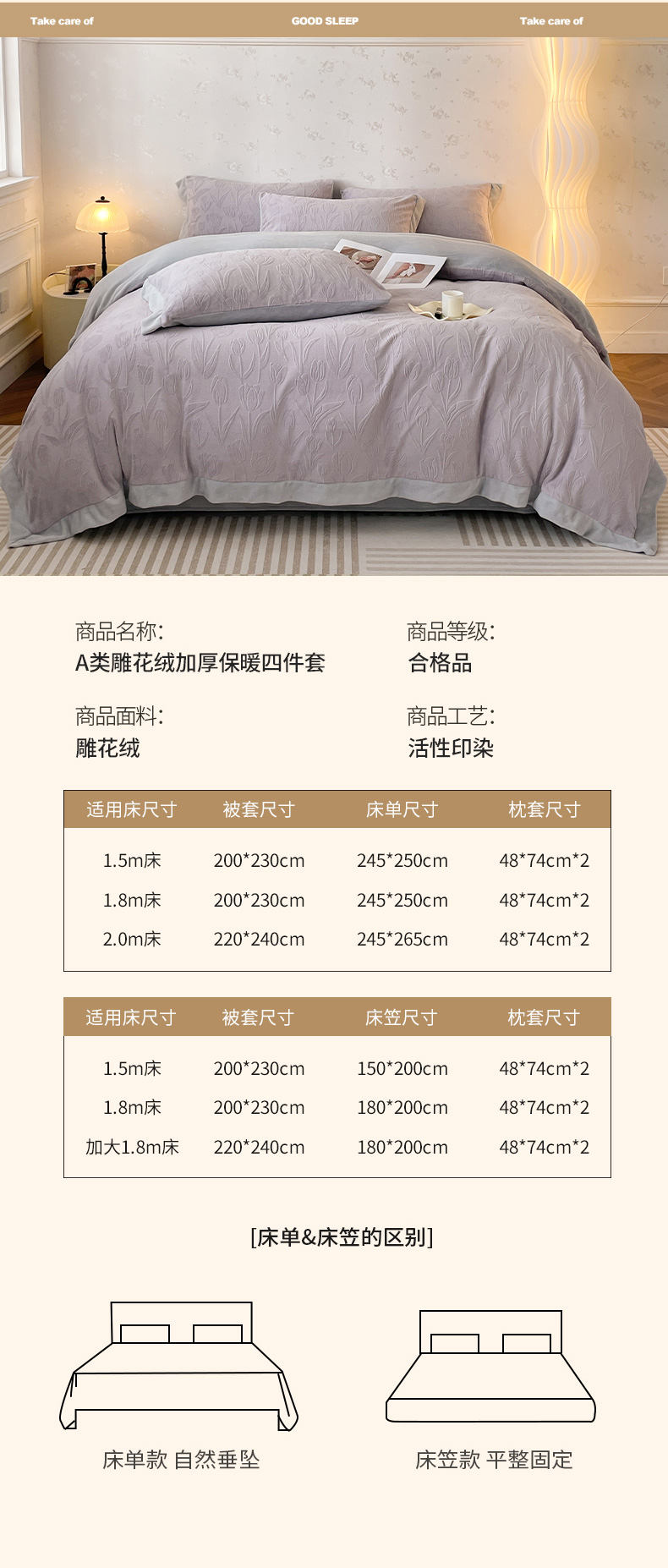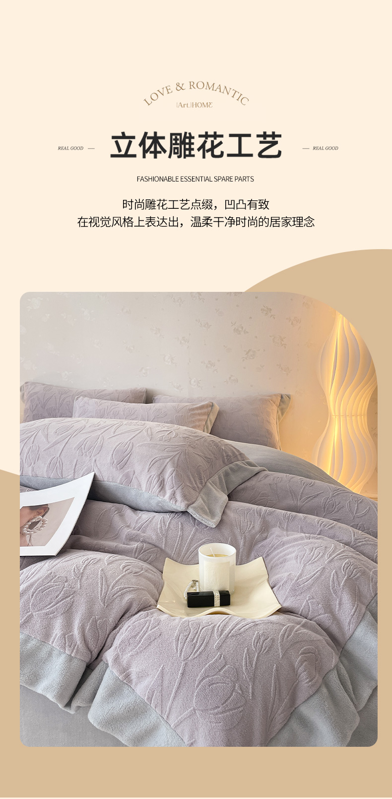 商品名称: 2024秋冬款9斤重高级感雕花牛奶绒四件套加厚珊瑚绒加绒被套床单床笠床上用品-郁金秘语 风信紫