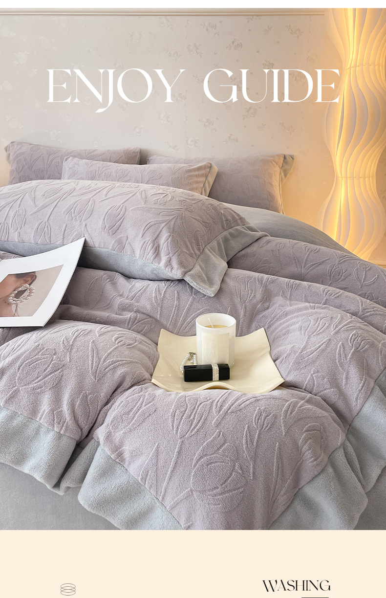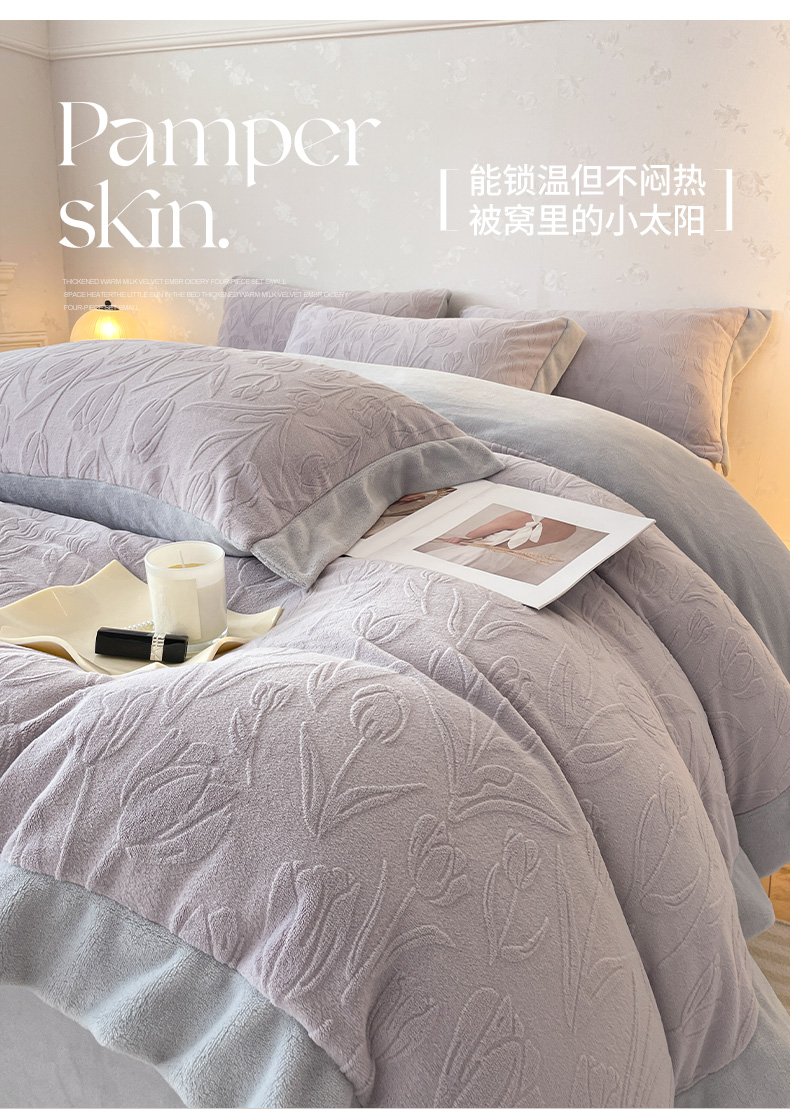 2024秋冬款9斤重高级感雕花牛奶绒四件套加厚珊瑚绒加绒被套床单床笠床上用品-郁金秘语 风信紫