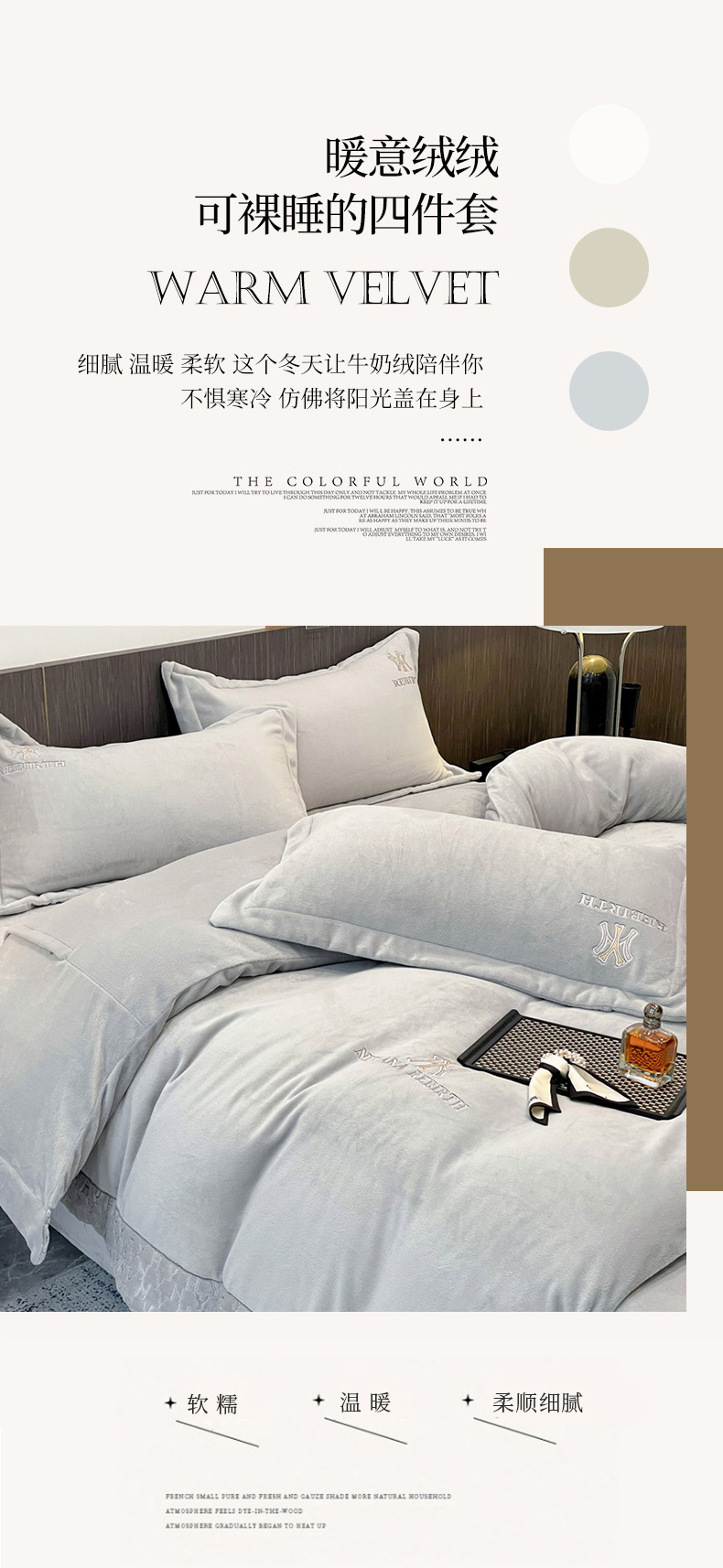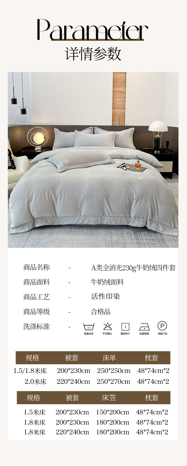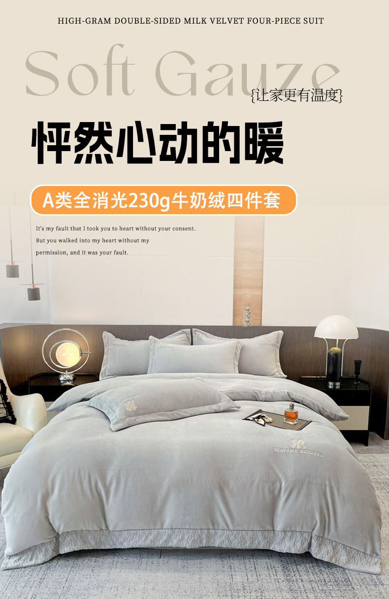 商品名称:星尚家纺 2024新款全消光A类230g牛奶绒四件套-维也纳 高级灰
