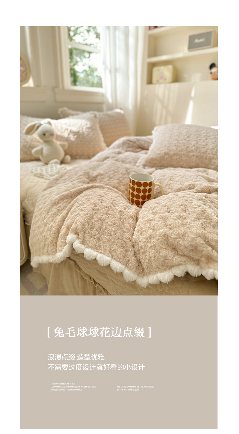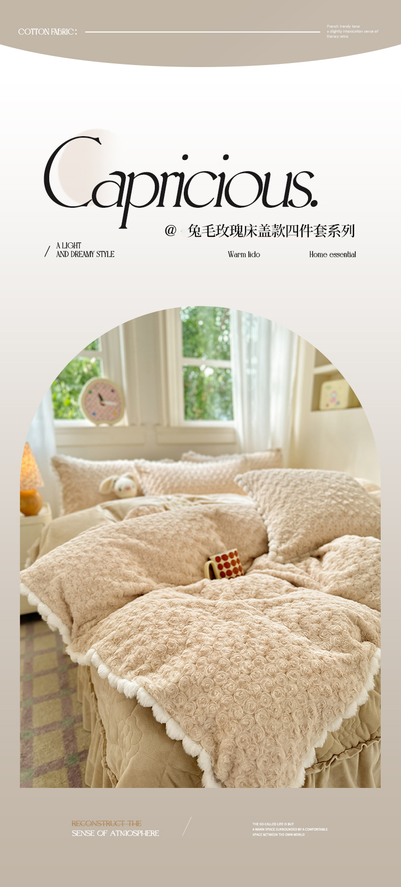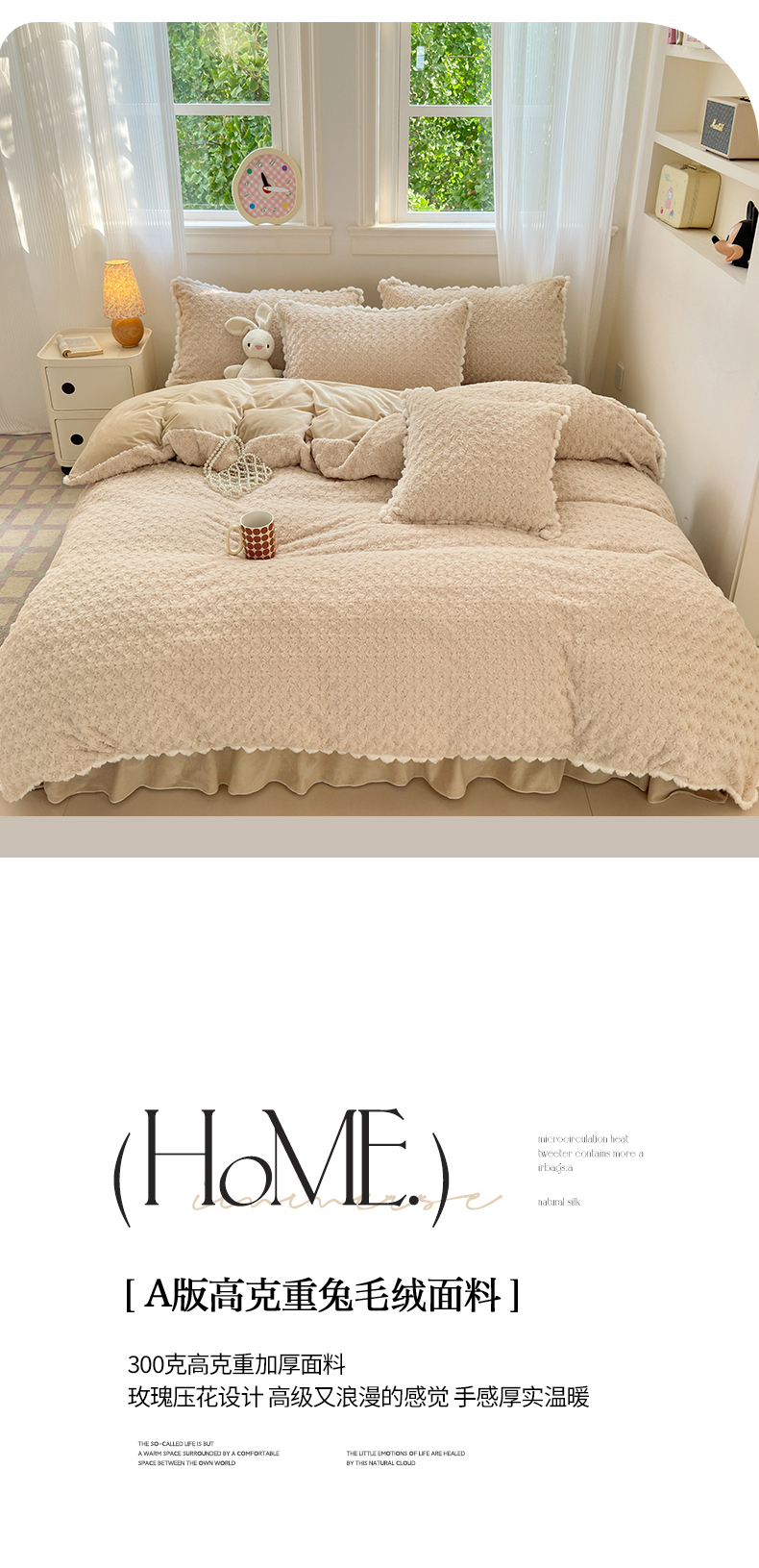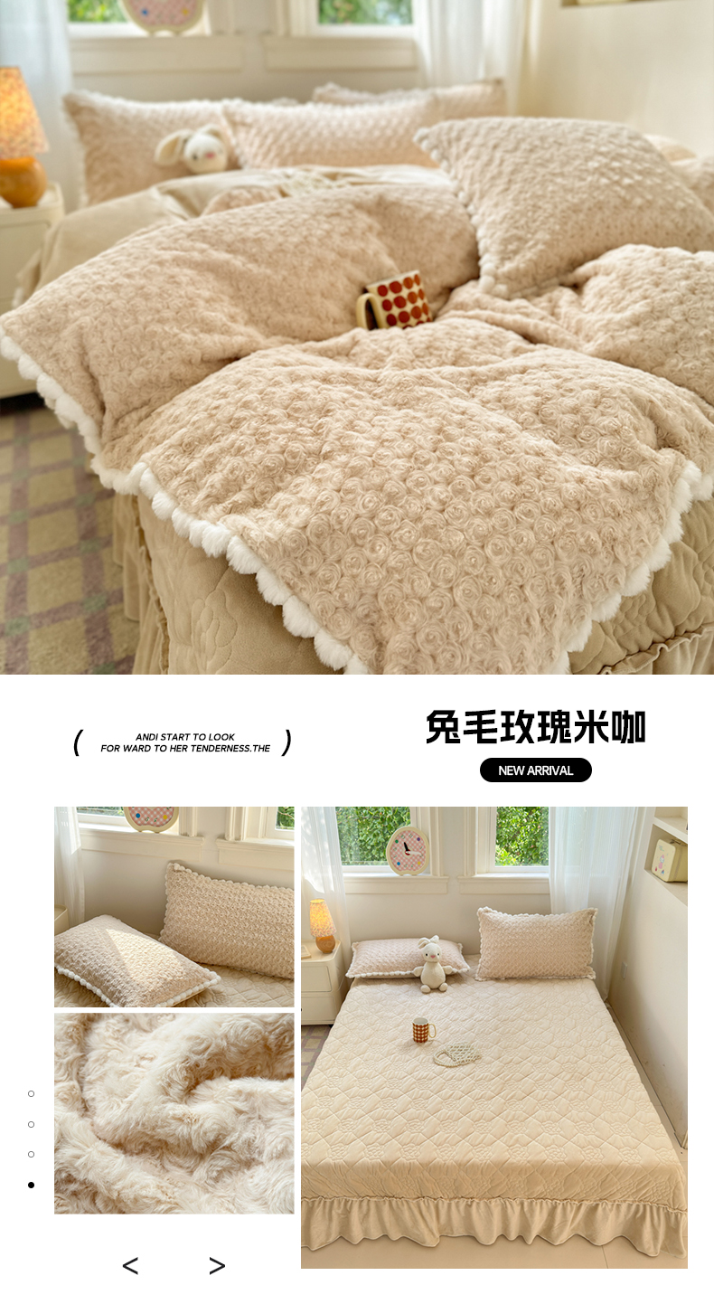 商品名称:淑女公社家纺 2024秋冬新款A版兔毛玫瑰B版婴儿绒床盖款四件套兔毛玫瑰米咖色