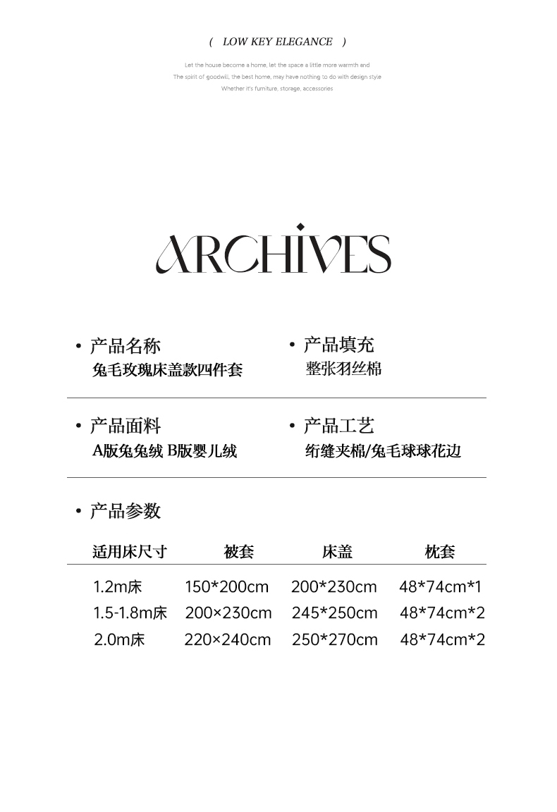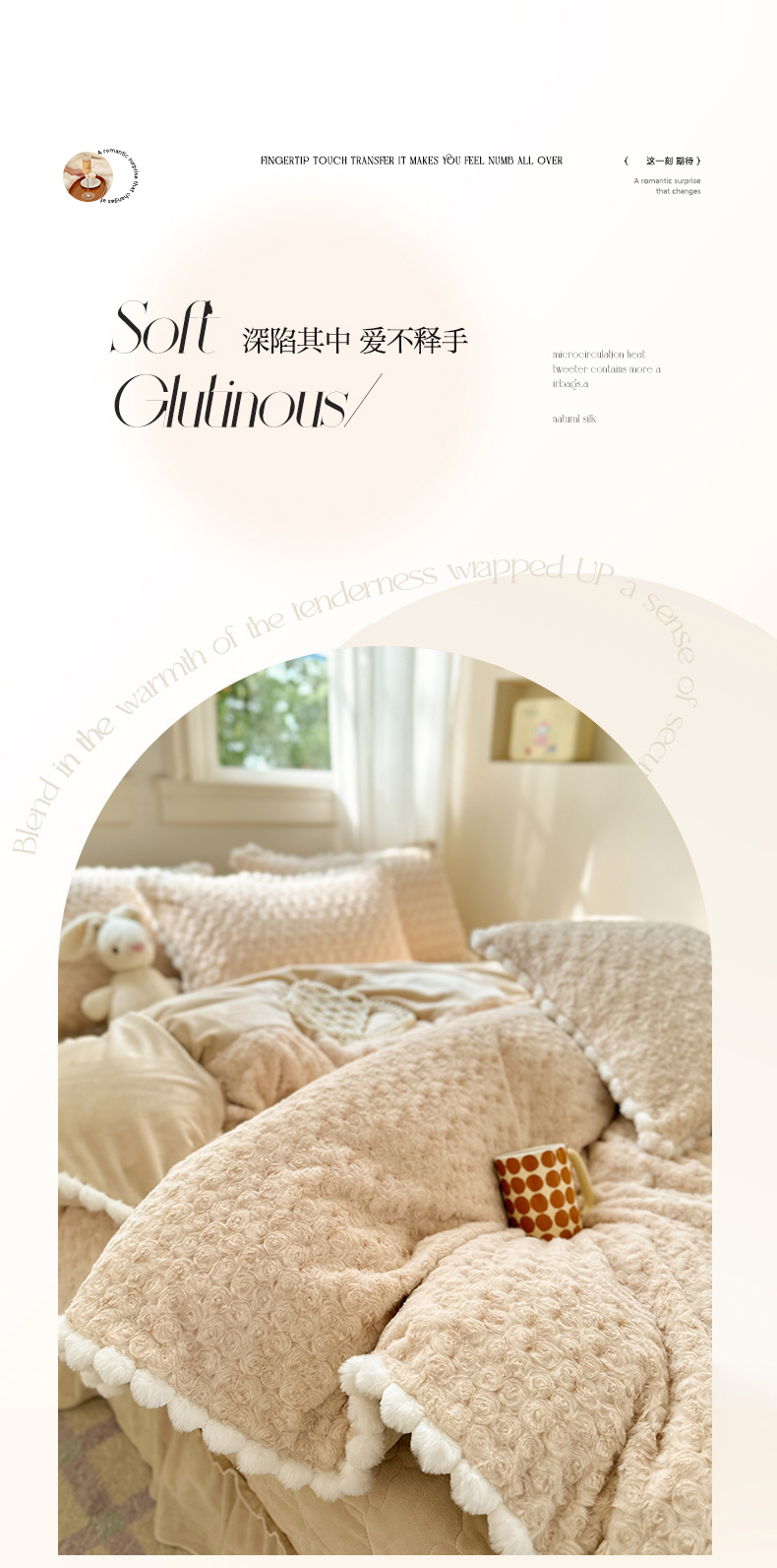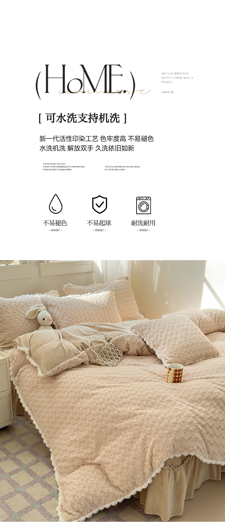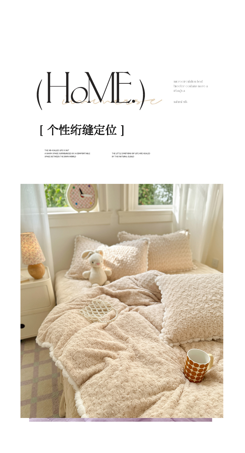 商品名称:淑女公社家纺 2024秋冬新款A版兔毛玫瑰B版婴儿绒床盖款四件套兔毛玫瑰米咖色