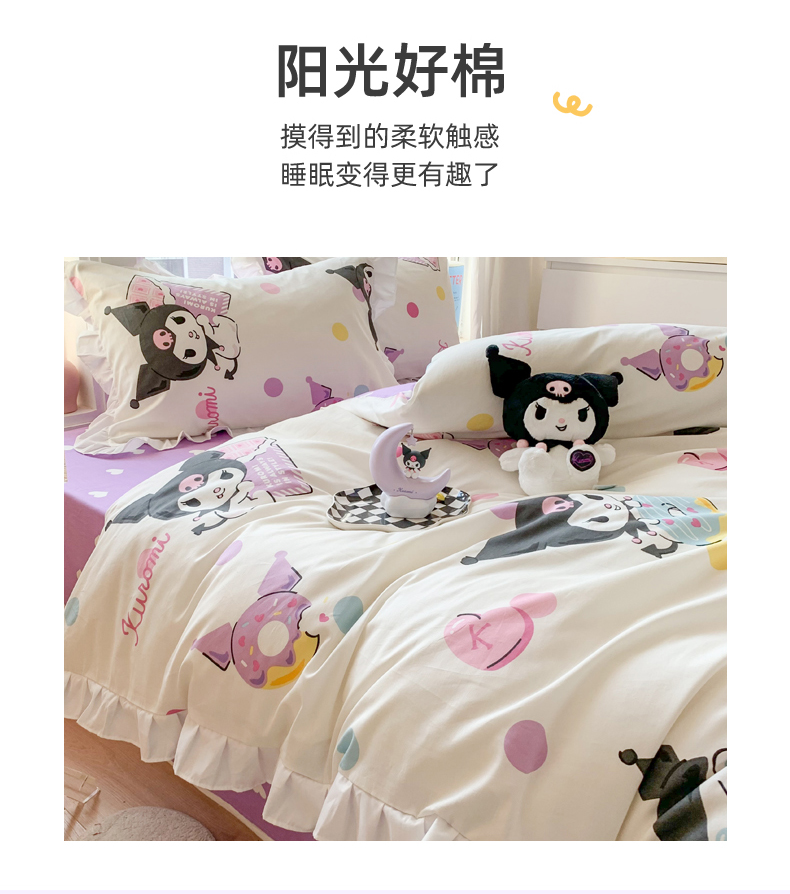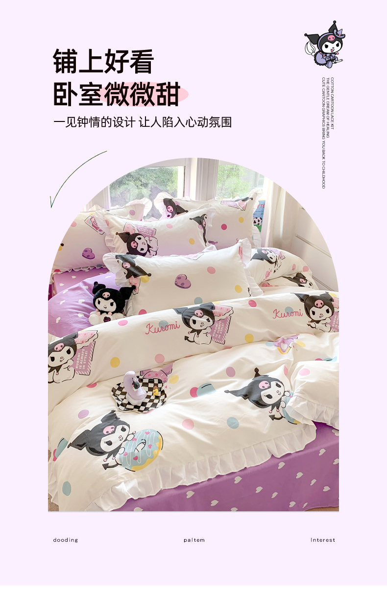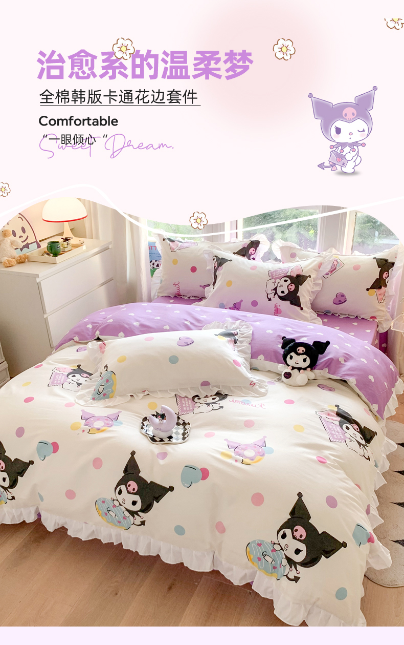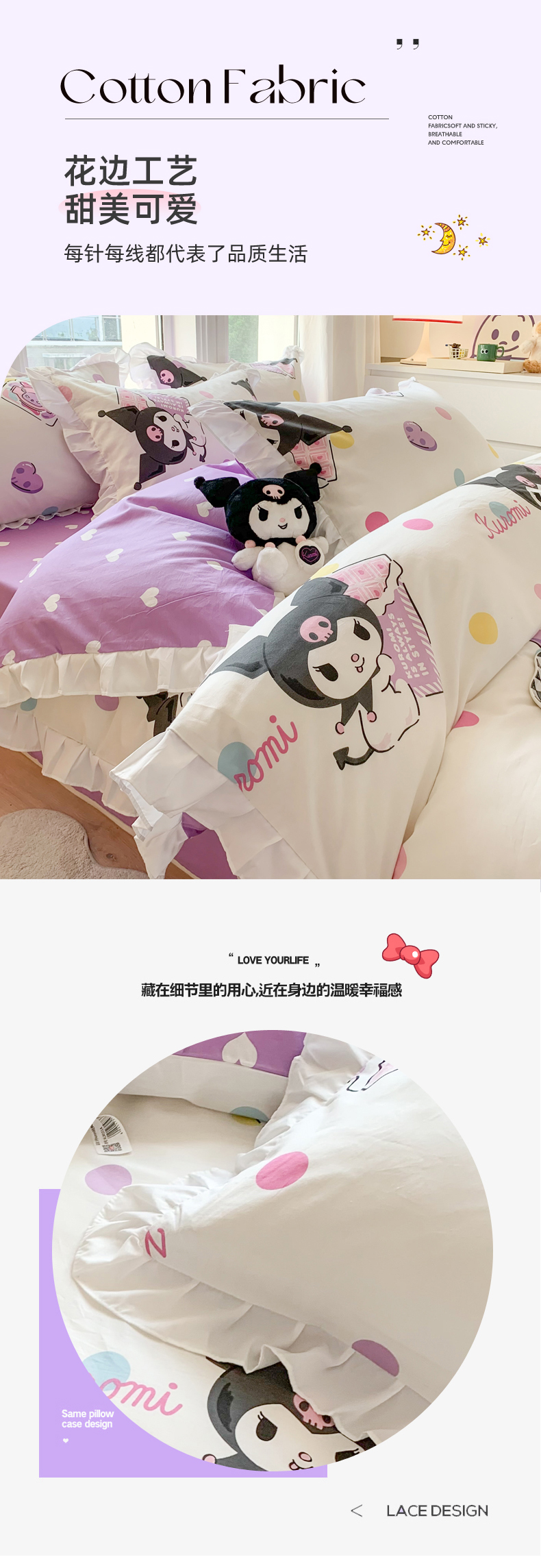 当前位置: 91家纺网 > 商品网购 > 床品套件 > 四件套 > 全棉普通四件套 > 玉元坊 2025新款三丽鸥系列白花边被套纯棉全棉床裙三件套四件套-库洛米白花边款式 波点库洛米