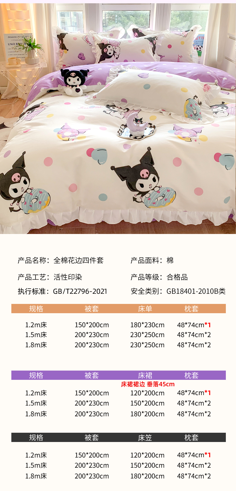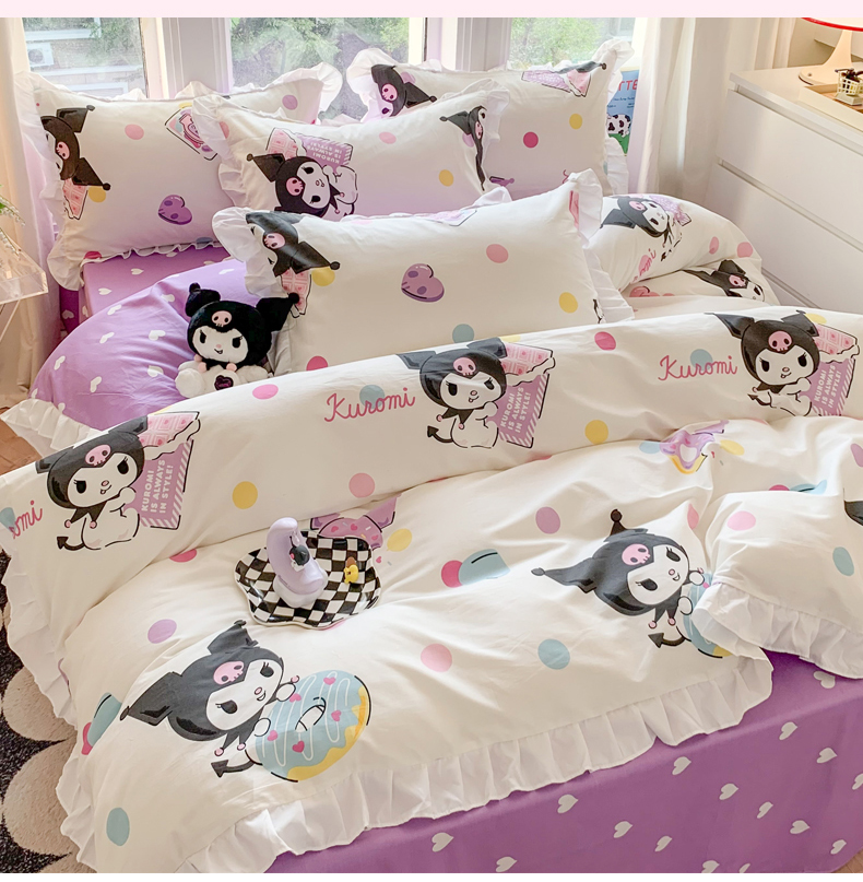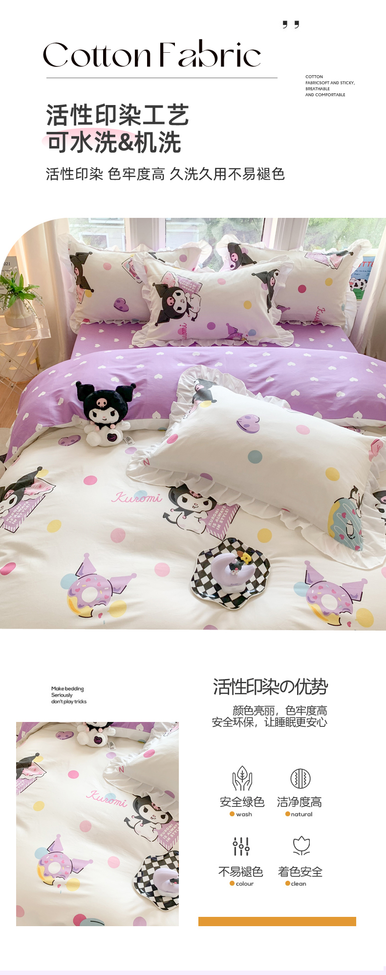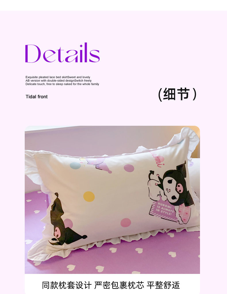 当前位置: 91家纺网 > 商品网购 > 床品套件 > 四件套 > 全棉普通四件套 > 玉元坊 2025新款三丽鸥系列白花边被套纯棉全棉床裙三件套四件套-库洛米白花边款式 波点库洛米