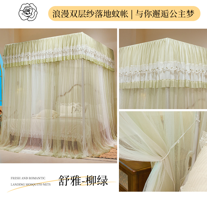当前位置: 91家纺网 > 商品网购 > 床上用品 > 蚊帐 > 宫廷蚊帐 > 雪姿家纺 2025新款刺绣花边双层宫廷三开门落地蚊帐-舒雅 素雅-柳绿