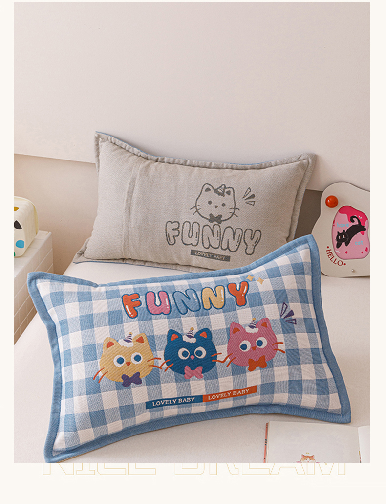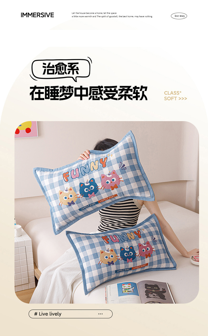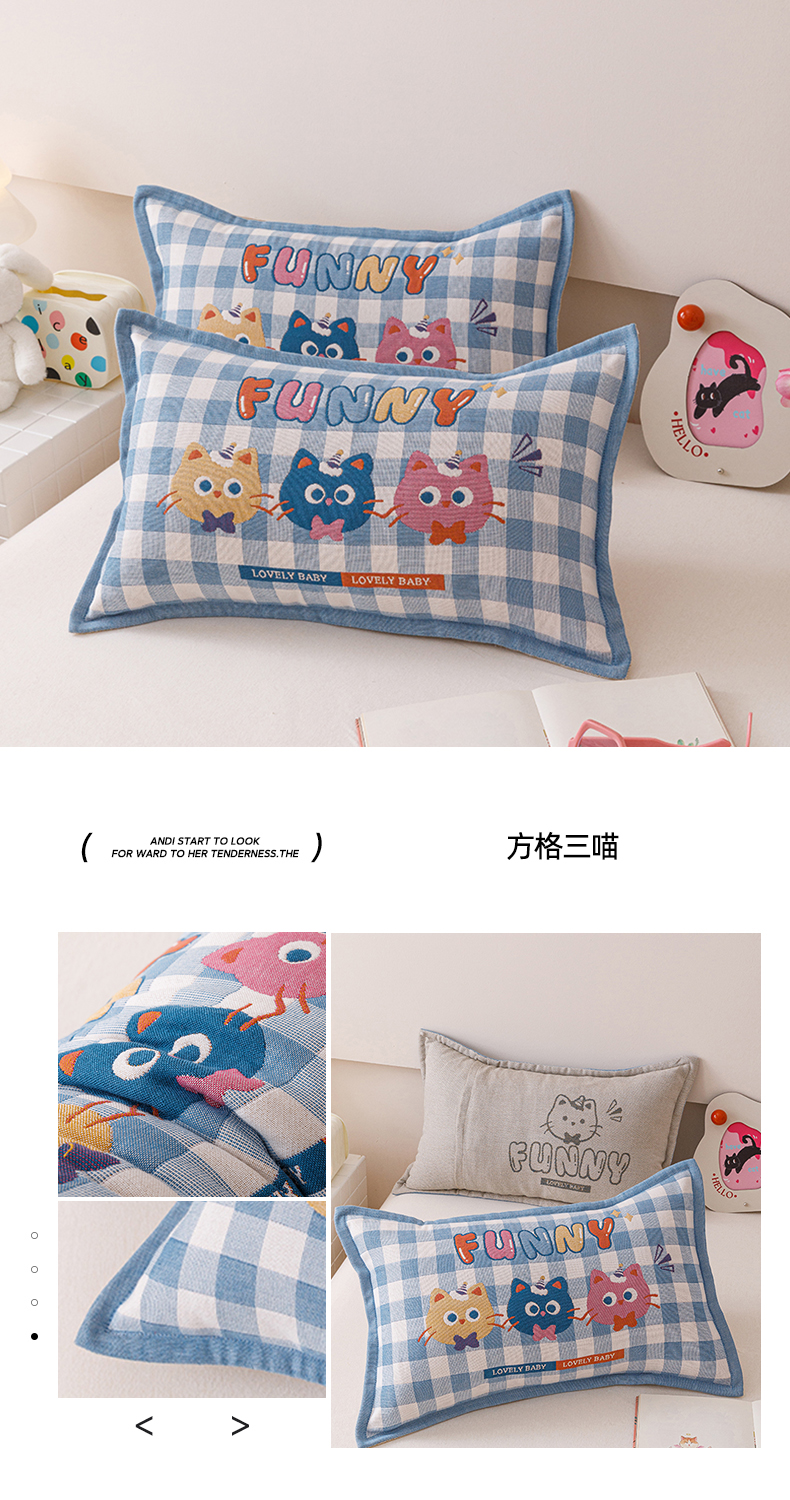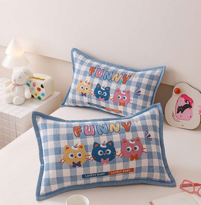 悦然毛巾被 2025新款全棉四层纱布儿童枕套 方格三喵