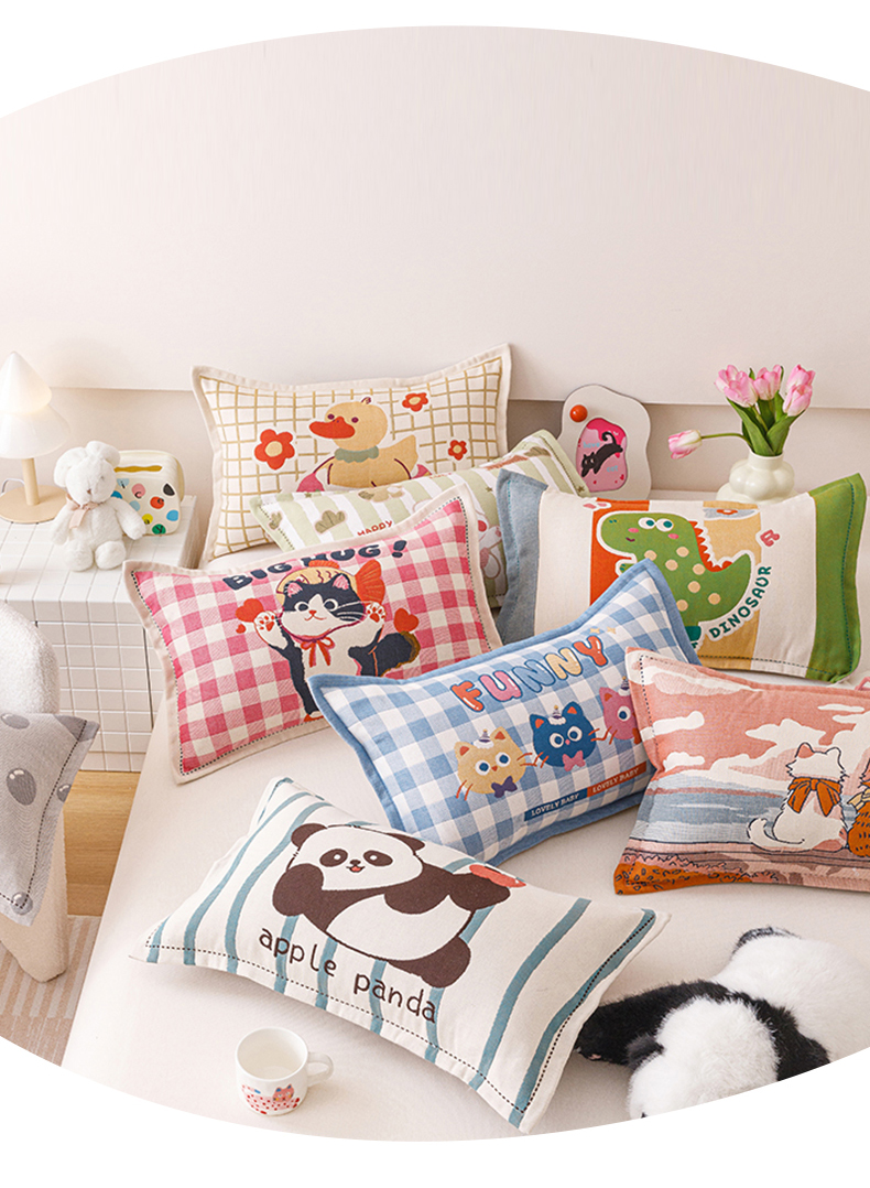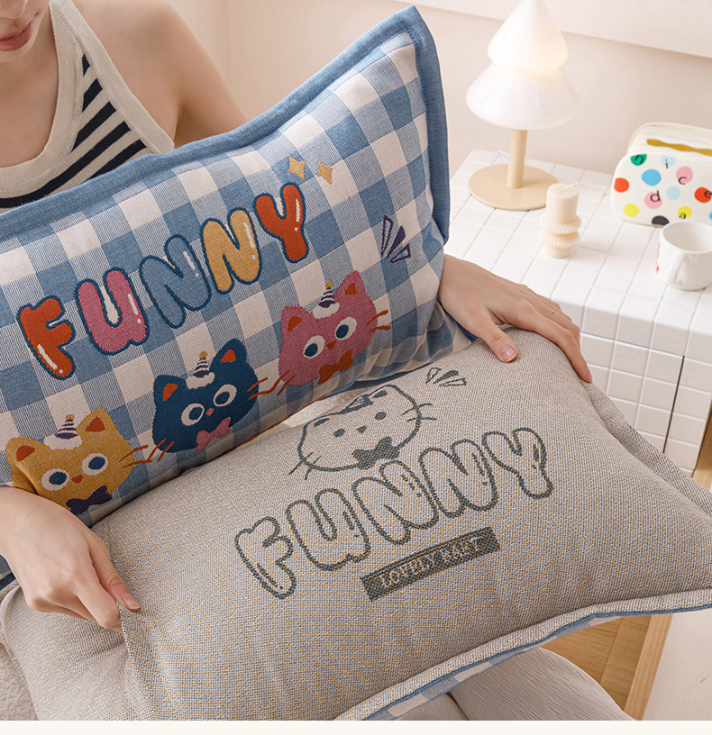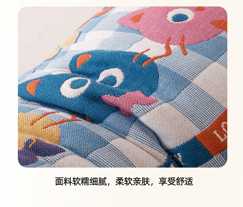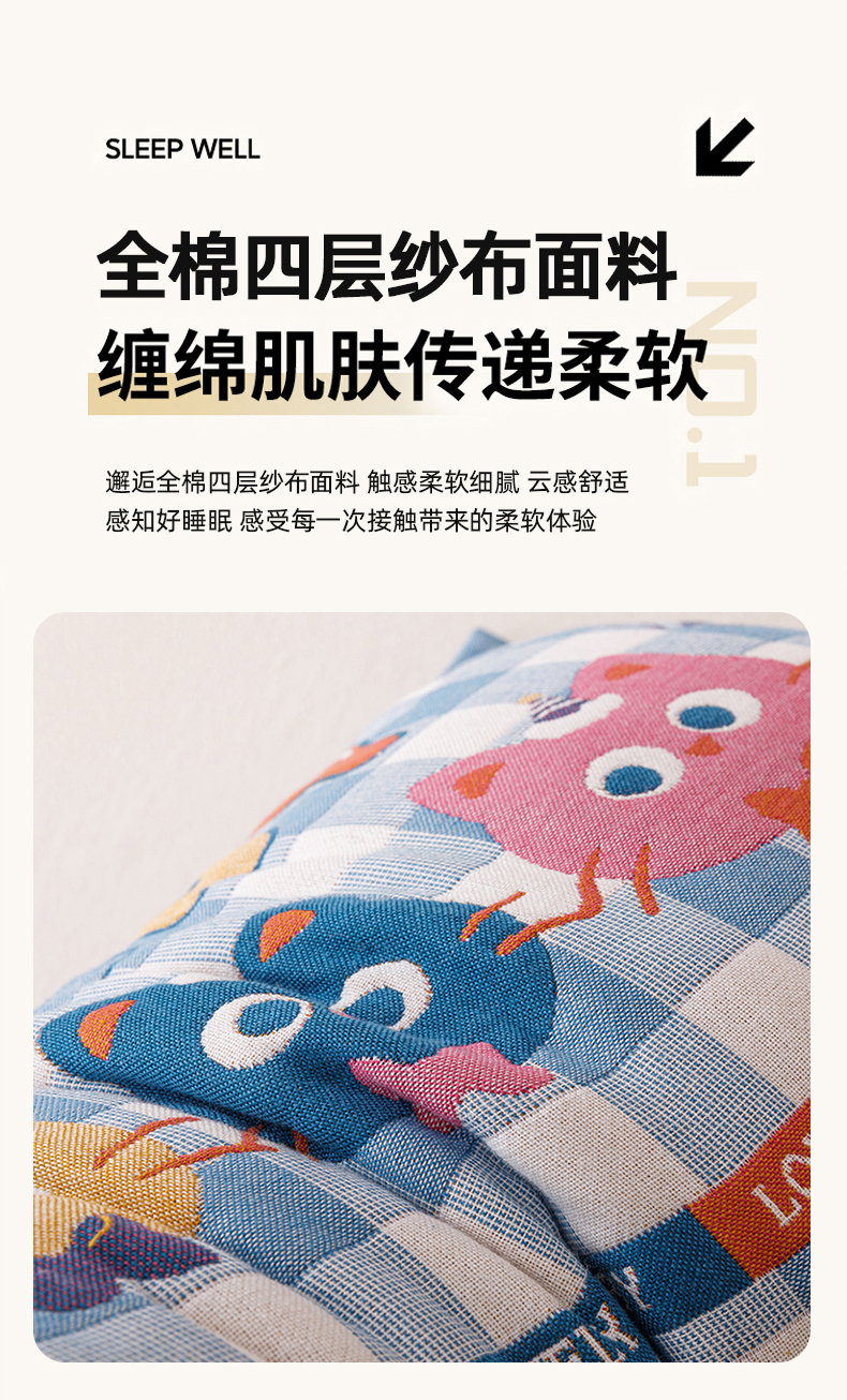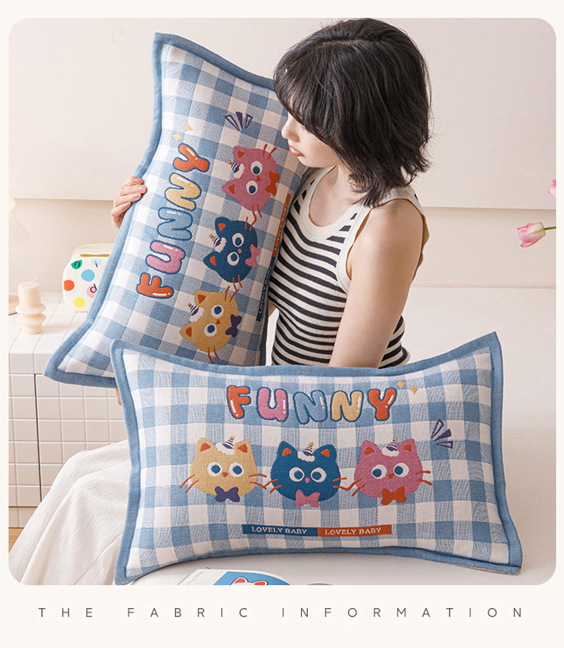 悦然毛巾被 2025新款全棉四层纱布儿童枕套 方格三喵