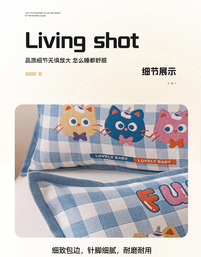 商品名称:悦然毛巾被 2025新款全棉四层纱布儿童枕套 方格三喵
