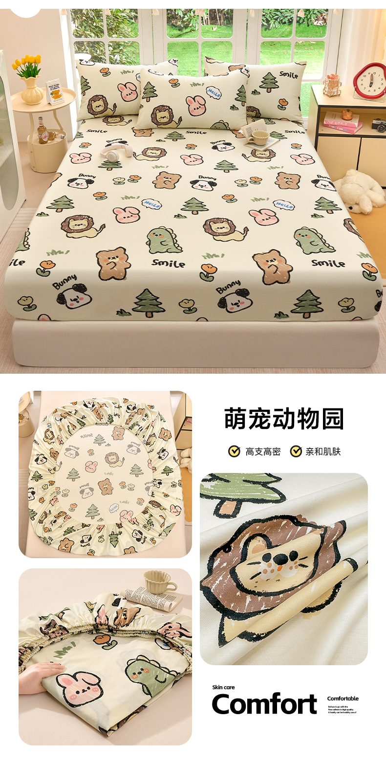 • 91家纺网 家纺一手货源 找家纺 木堇家居 2025新款春夏全棉小清新卡通床单床笠枕套单品系列-床笠系列 3  萌宠动物园
