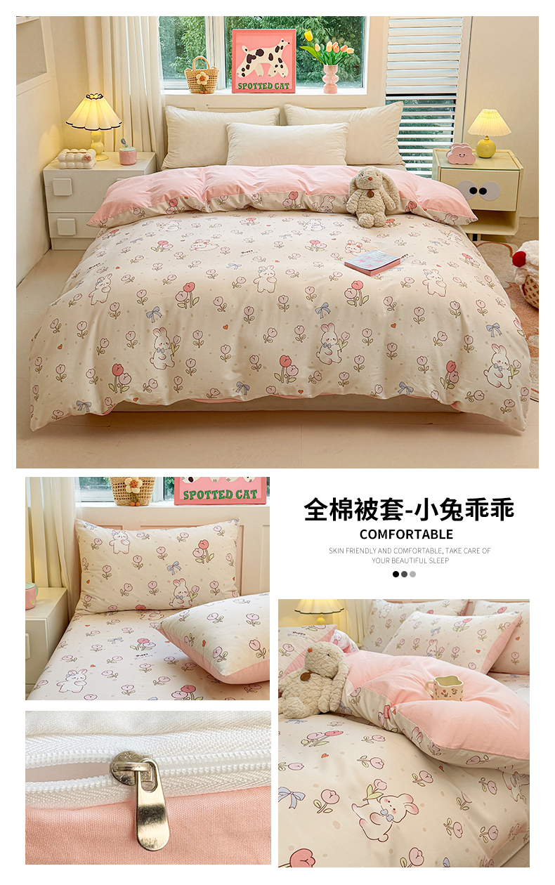 • 91家纺网 家纺一手货源 找家纺 雯豆2025春夏新款全棉纯棉被套三件套学生成人被罩 全棉被套-小兔乖乖