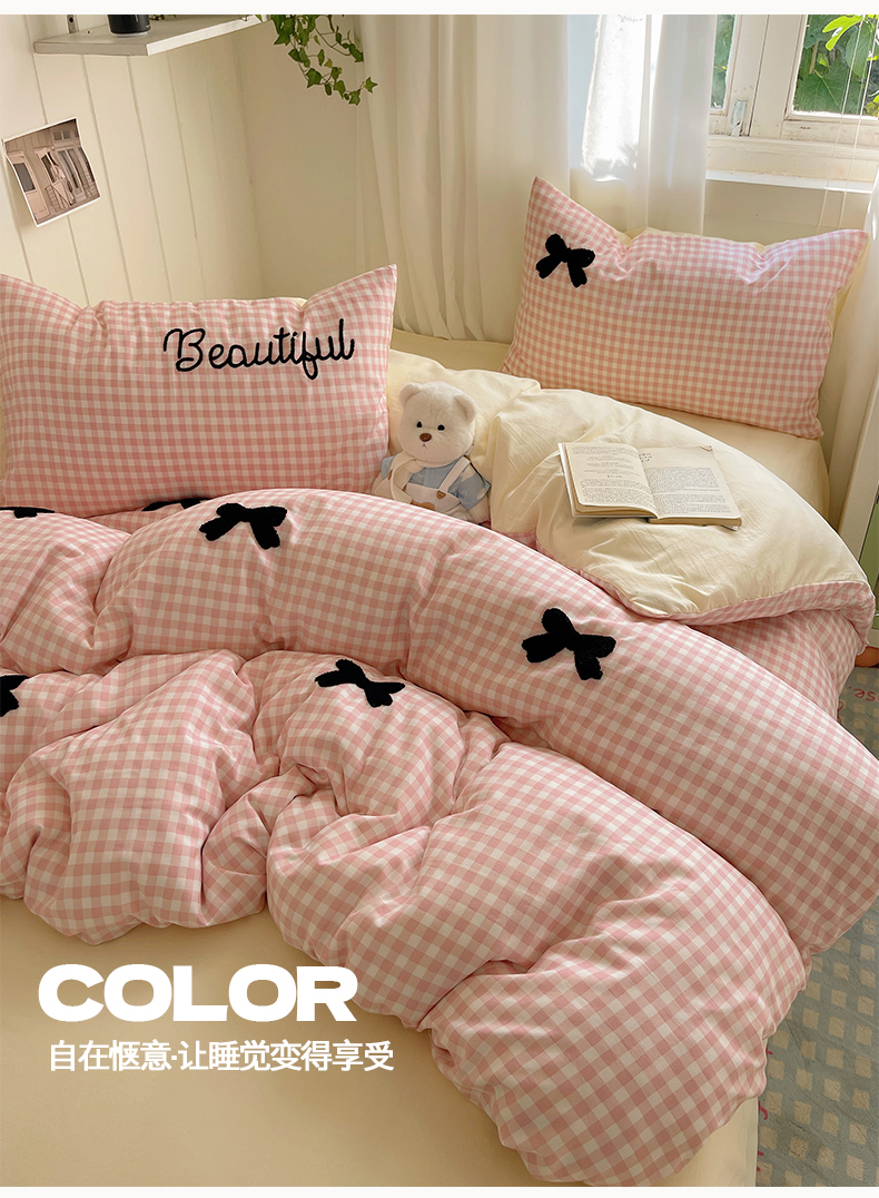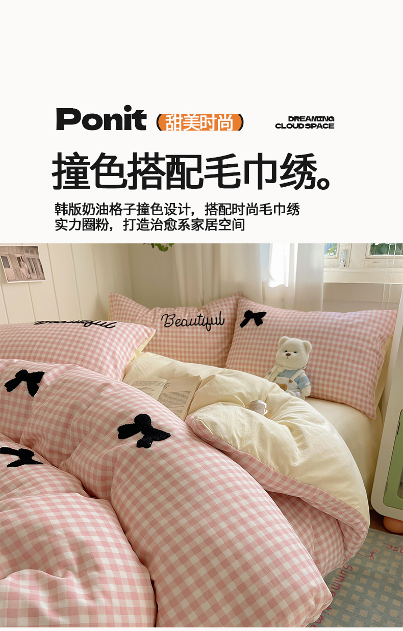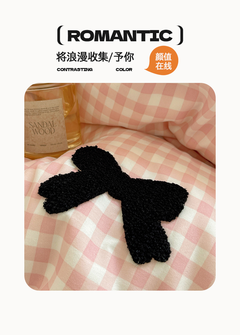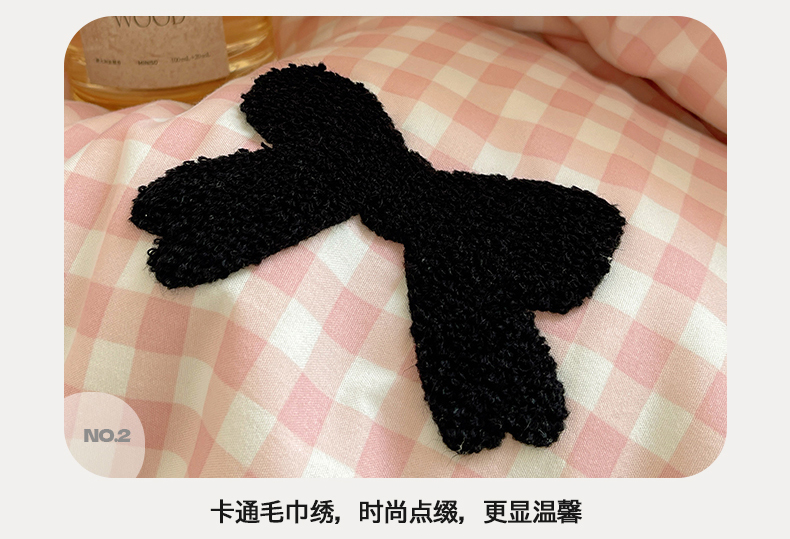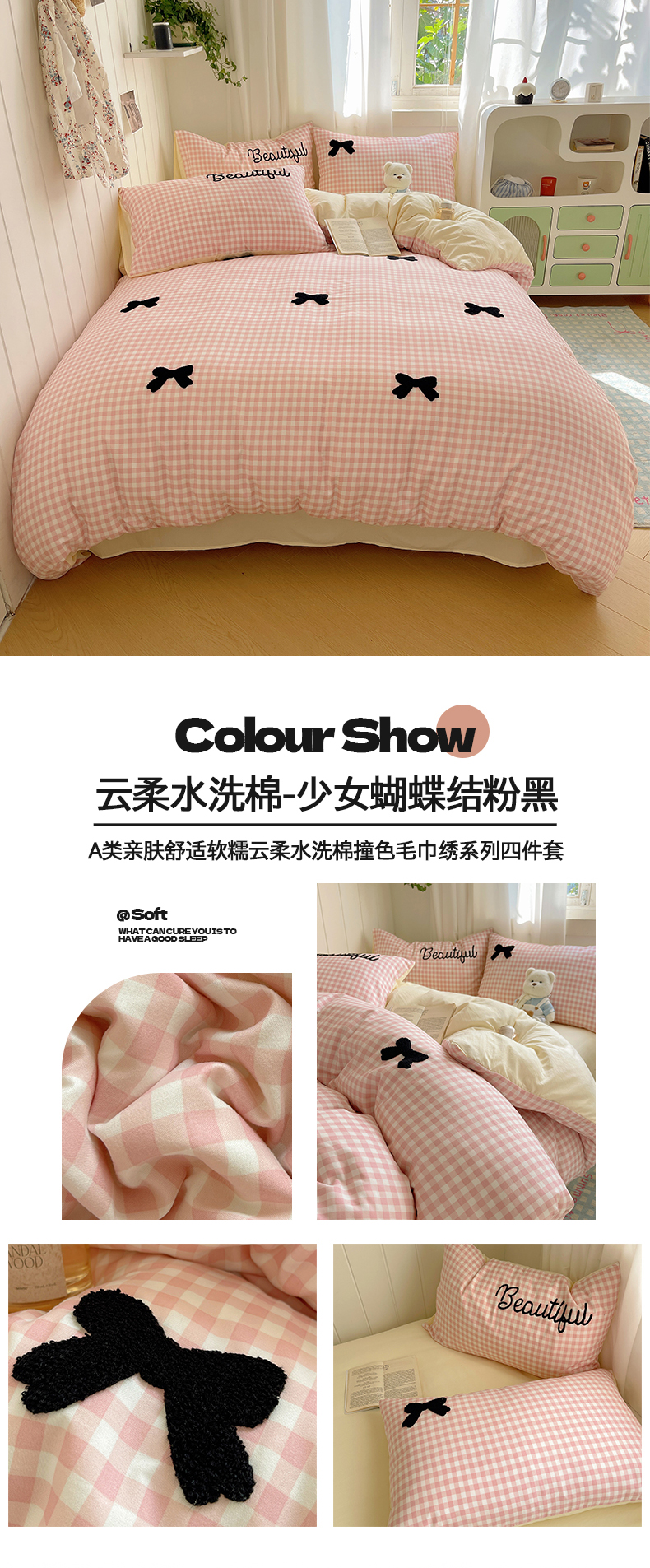 当前位置: 91家纺网 > 商品网购 > 床品套件 > 四件套 > 水洗棉四件套 > 桃心家居 2025新款A类亲肤舒适软糯云柔水洗棉奶油格子撞色毛巾绣猫咪蝴蝶结水洗棉系列四件套 云柔水洗棉-少女蝴蝶结粉黑