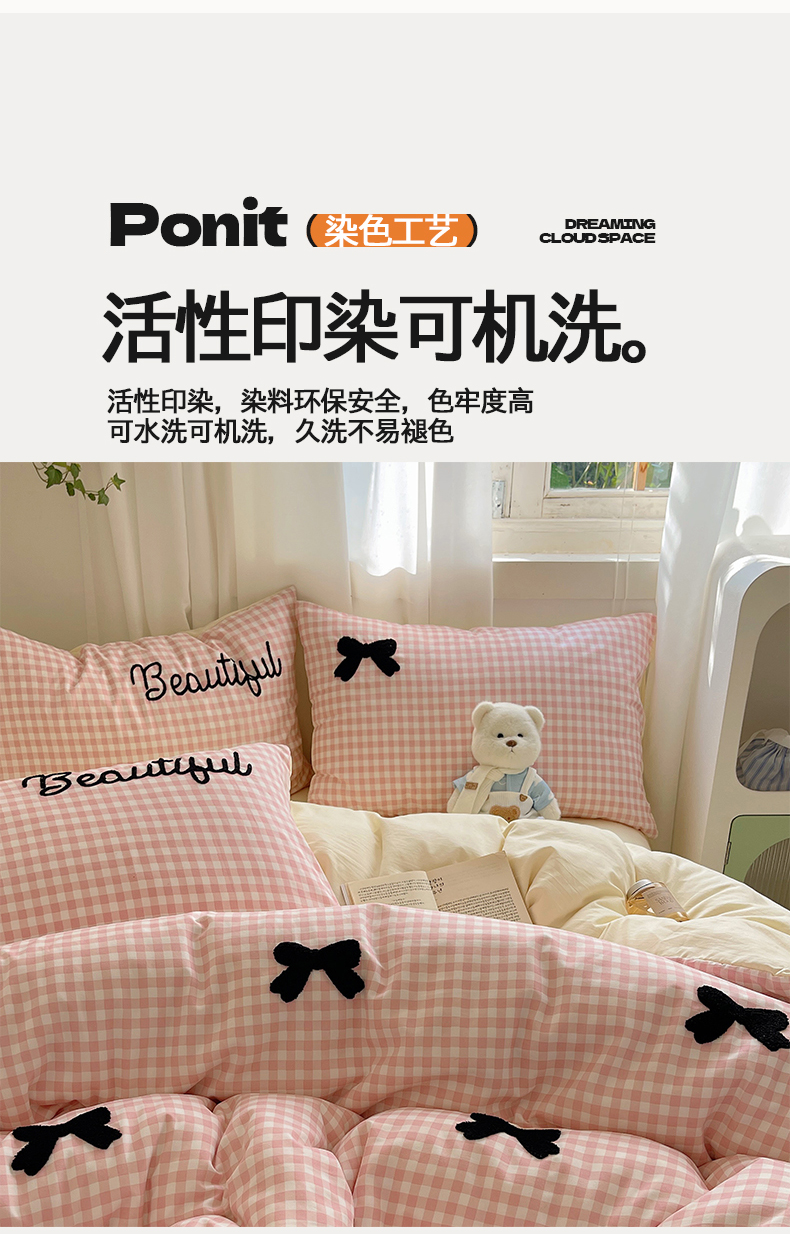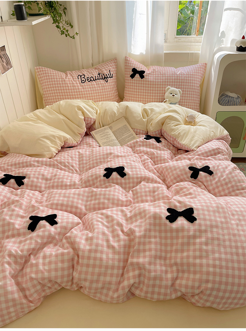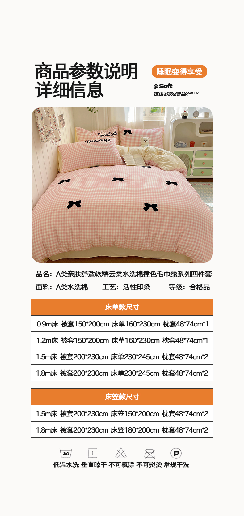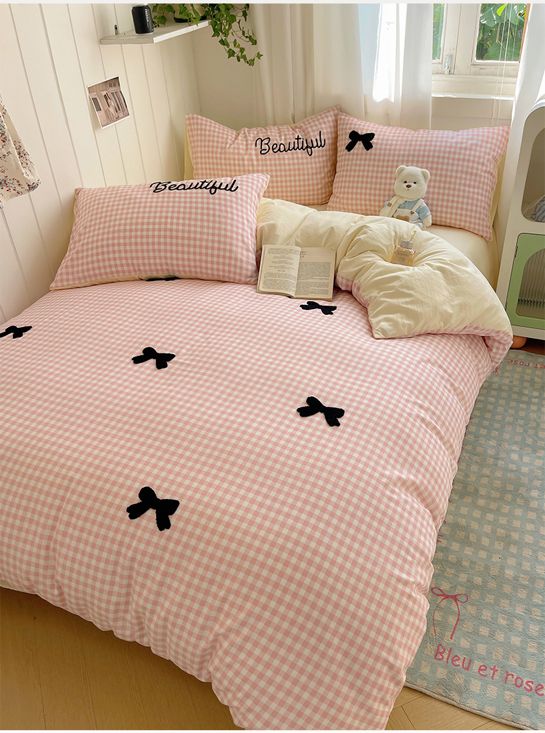 当前位置: 91家纺网 > 商品网购 > 床品套件 > 四件套 > 水洗棉四件套 > 桃心家居 2025新款A类亲肤舒适软糯云柔水洗棉奶油格子撞色毛巾绣猫咪蝴蝶结水洗棉系列四件套 云柔水洗棉-少女蝴蝶结粉黑