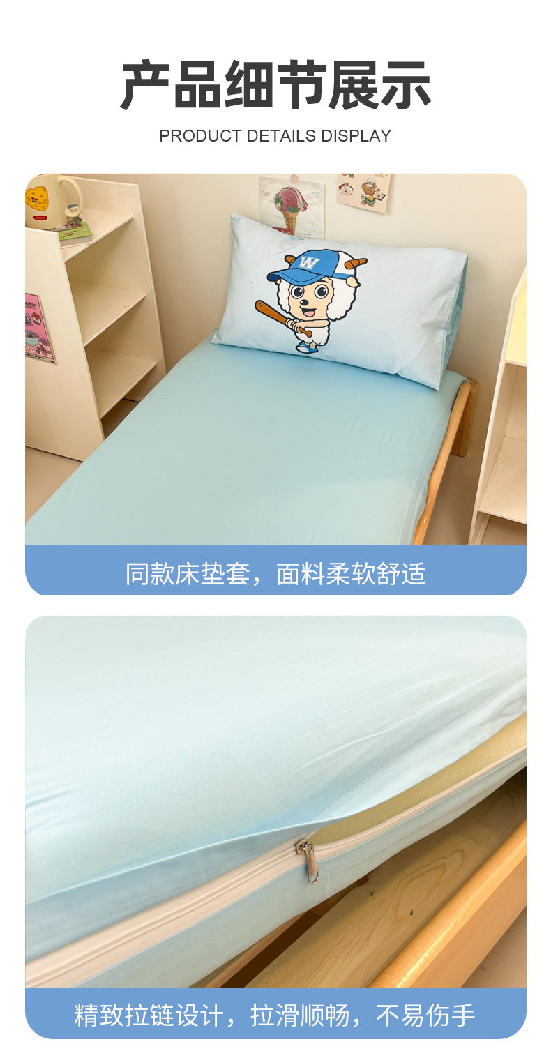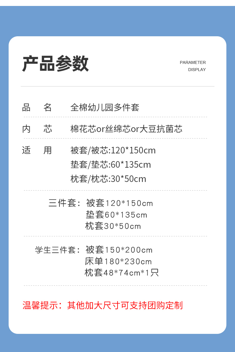 幼儿园尺寸: 被套 120*150,垫套 60.*135, 枕套30*50一个
