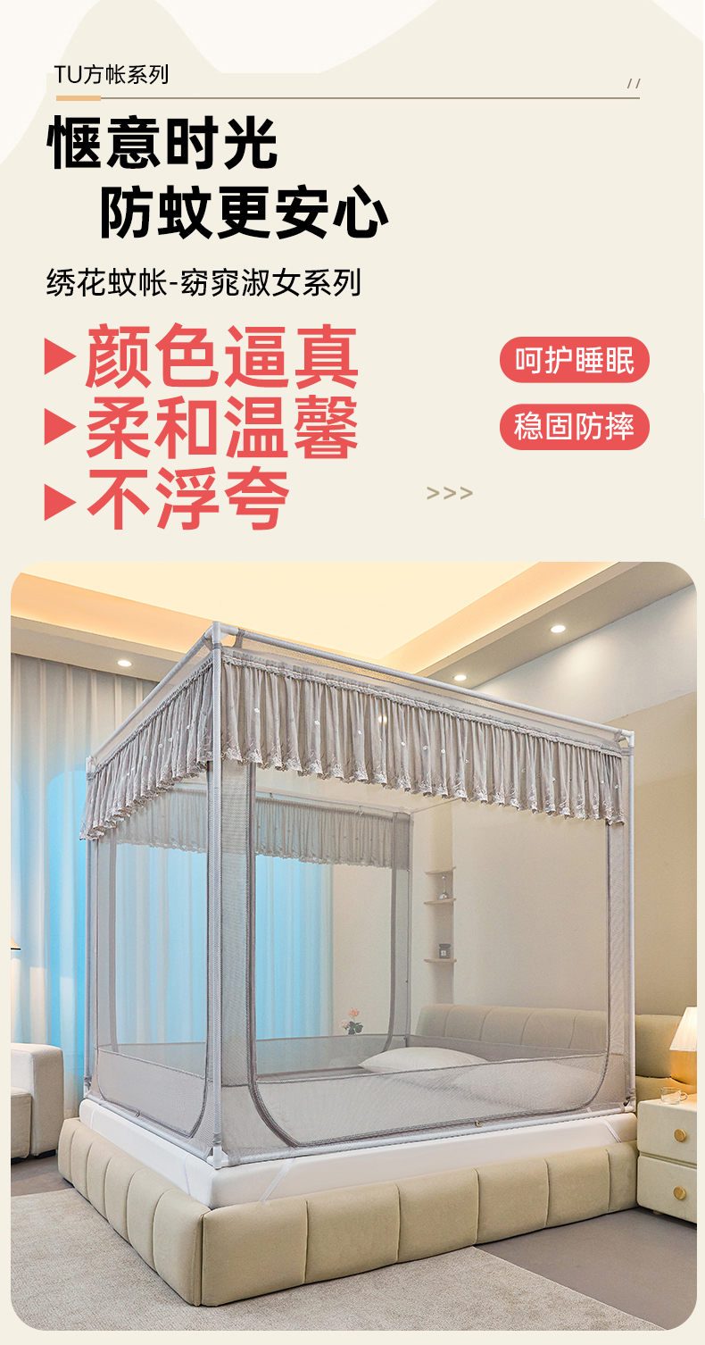 (总)梦尔佳蚊帐2025新款TU绣花蚊帐-859窈窕淑女系列,温馨如玉,高雅银灰,清爽水蓝,宛如白霞,喜庆粉红,优雅嫩黄