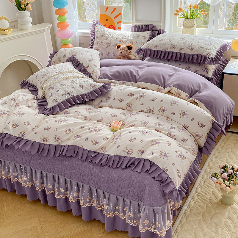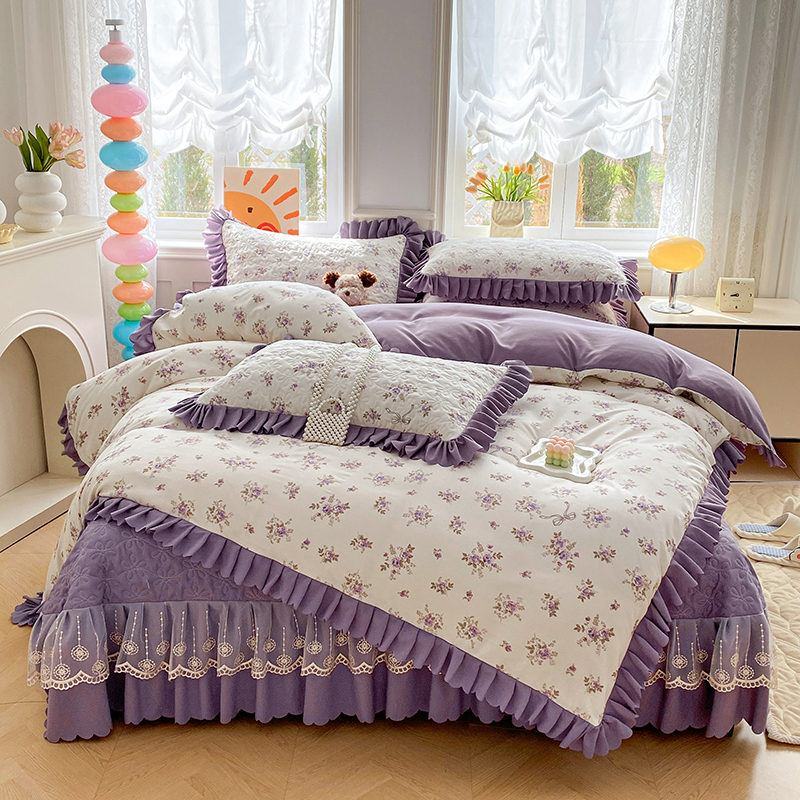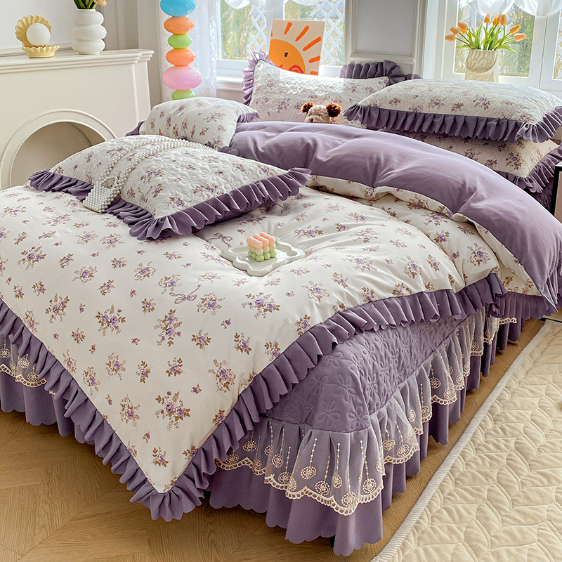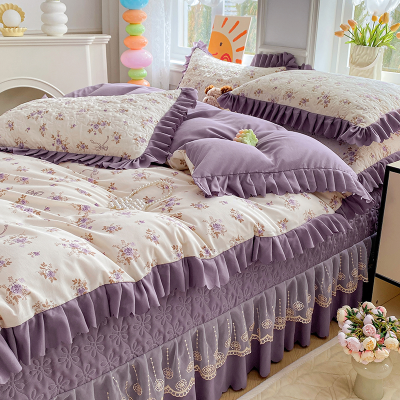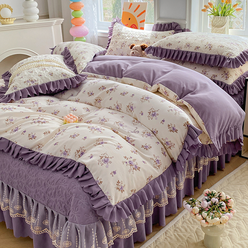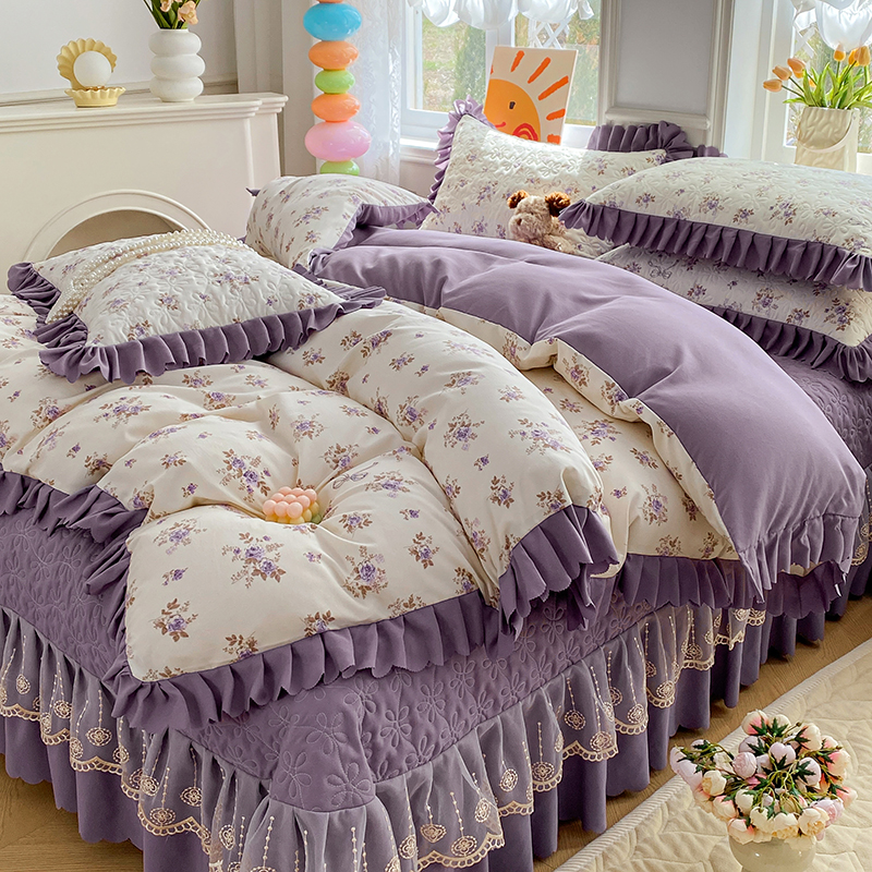 提花大世界 2025直播热款A类针织棉双层纱夹棉床盖床裙花边单件三件四件套 幽香私语