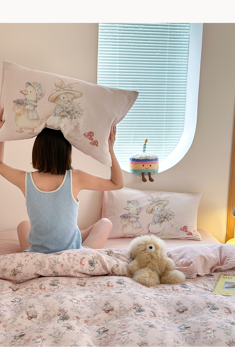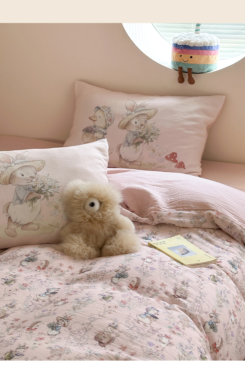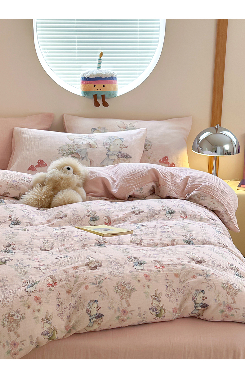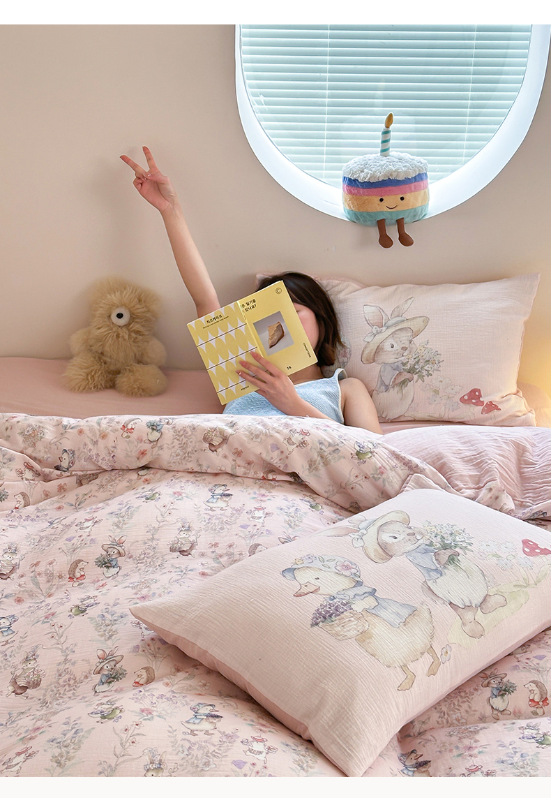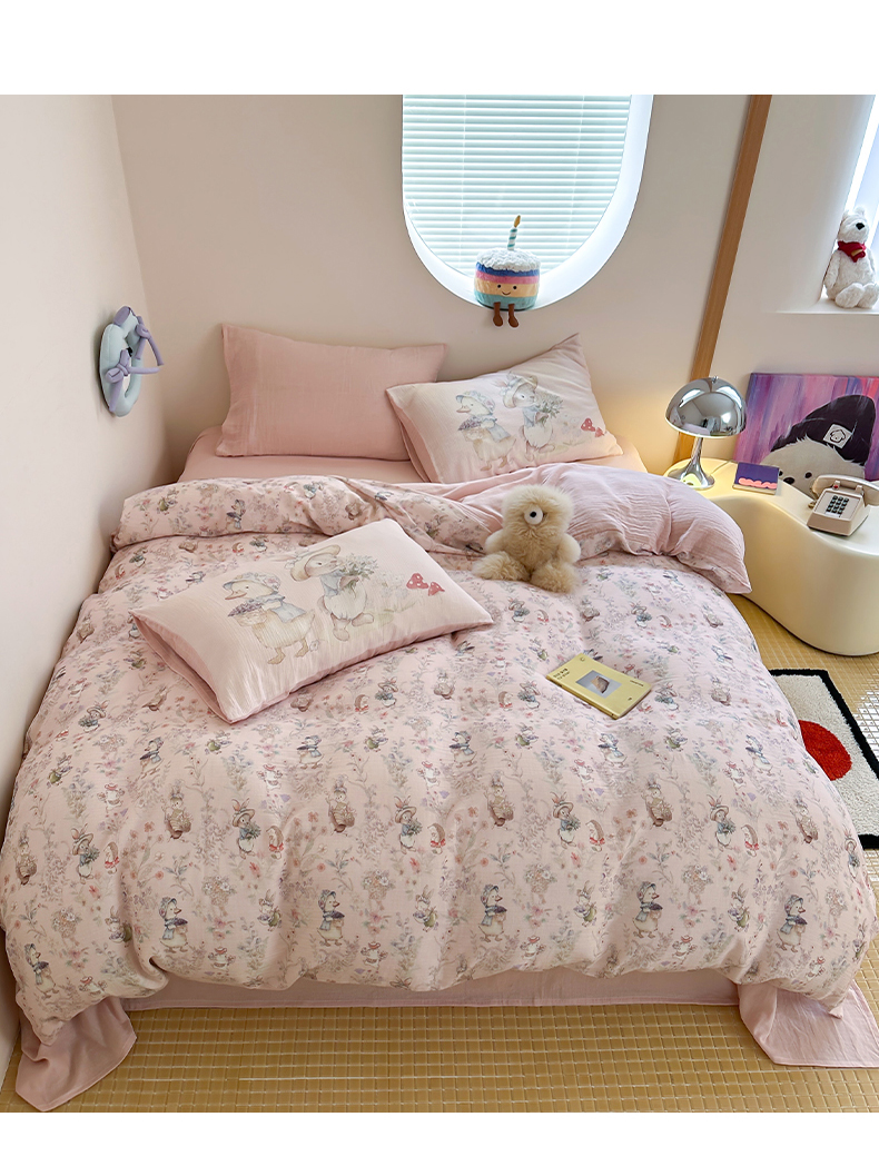 商品名称:卡巴伦家纺 2025新款全棉皱皱纱大版卡通数码印花款四件套一 班尼的花园-粉
