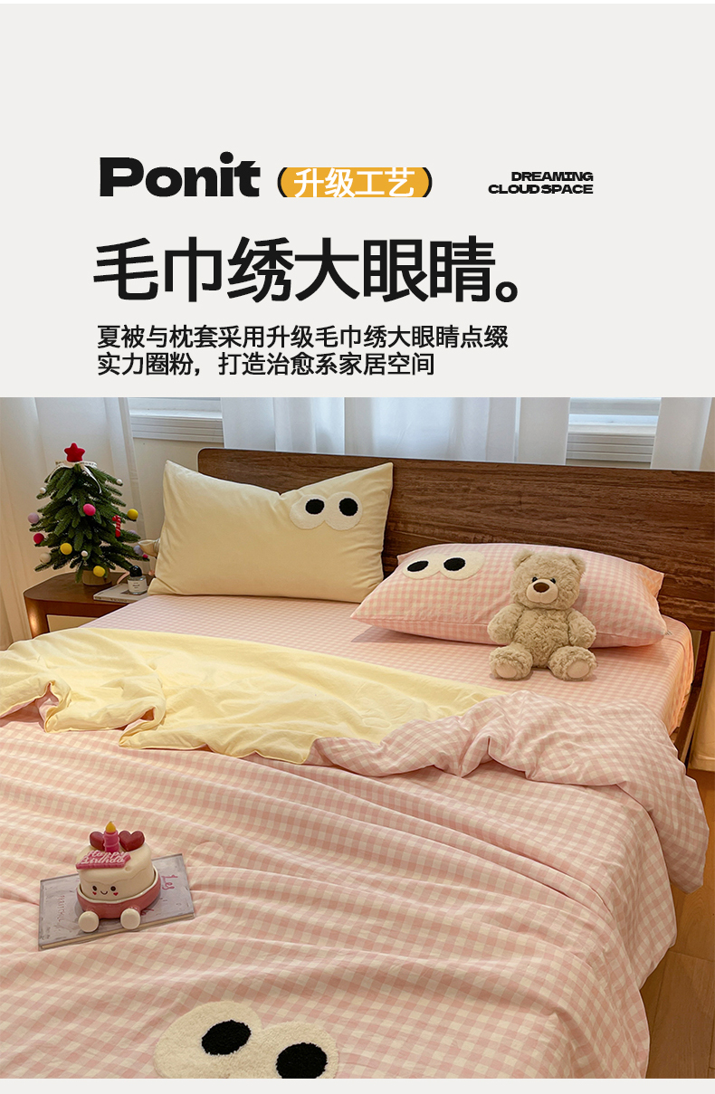 桃心家居 2025新款云柔水洗棉毛巾绣大豆单夏被夏被四件套 水洗棉-大眼睛夏被粉小格奶黄