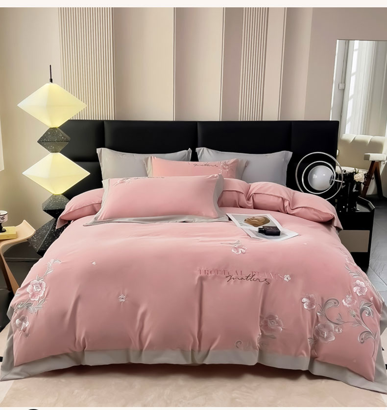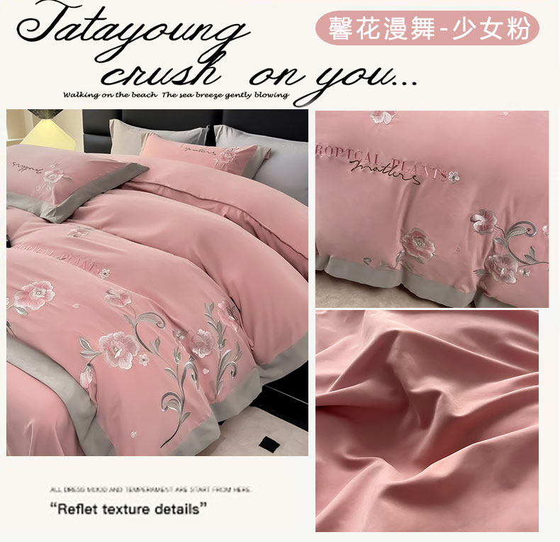 曲之慕 2025新品四季款高端刺绣四件套简约可水洗轻奢纯色刺绣四件套 馨花漫舞少女粉