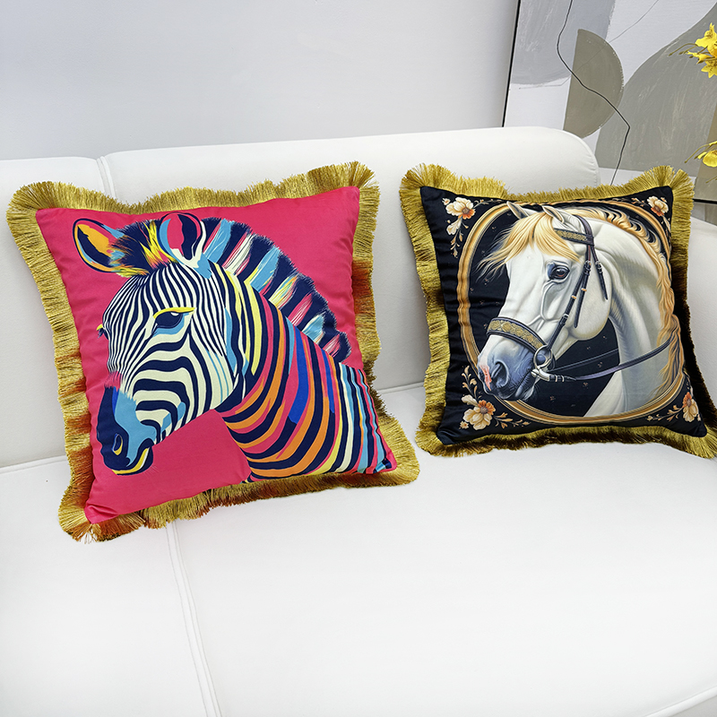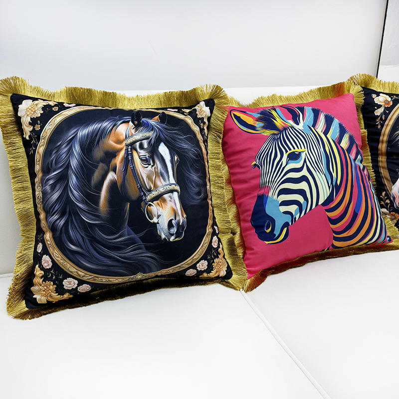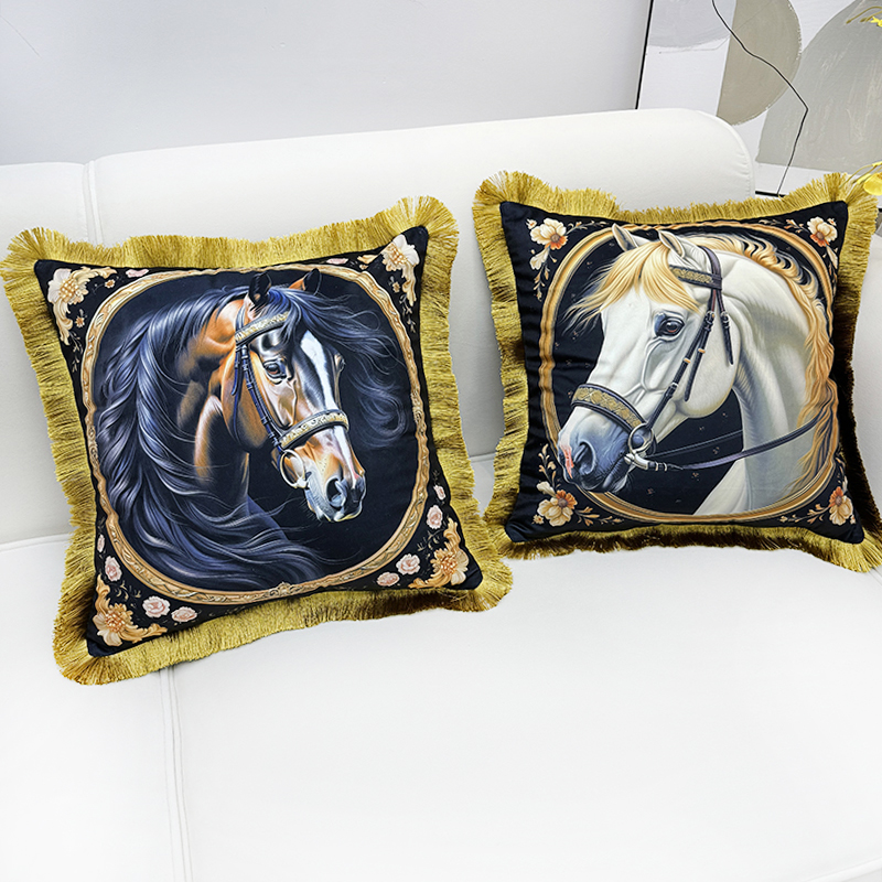 (总)爱家居 2025新款欧式美式沙发抱枕套靠垫套轻奢流苏白马绒抱枕含芯床头靠枕垫定制,汗血宝马,皇家白马,时尚斑马