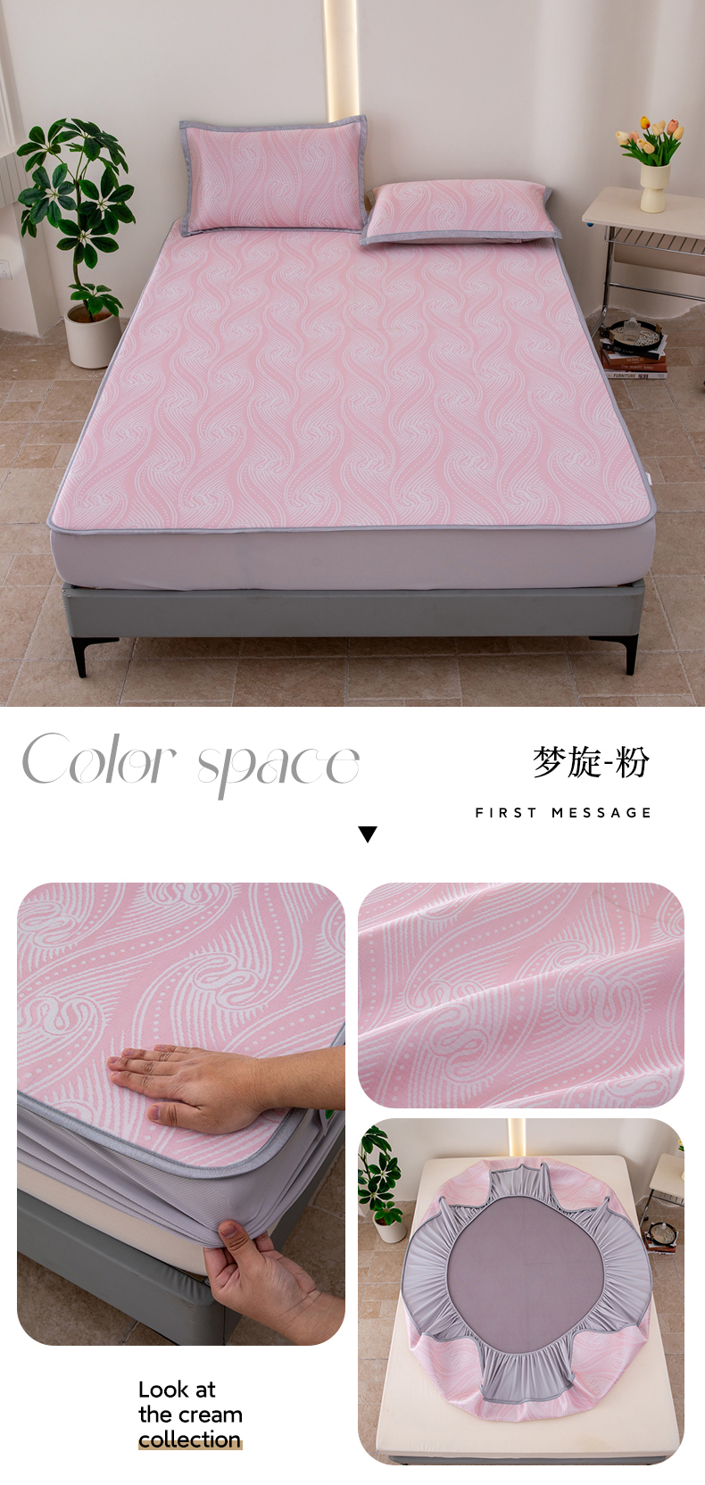 商品名称:凌云家纺 2025新款提花凉感冰丝席床笠款三明治凉席三件套 梦旋-粉