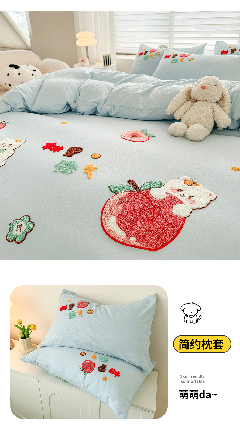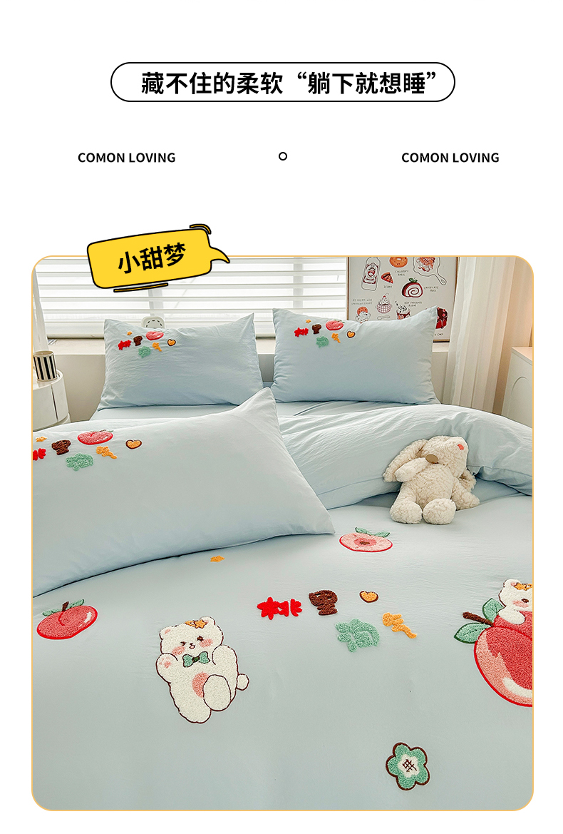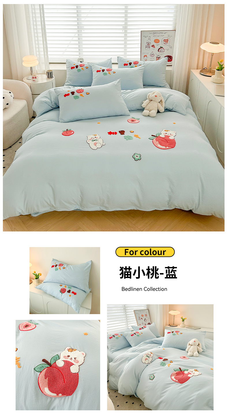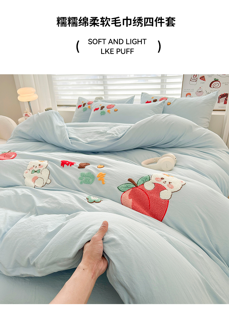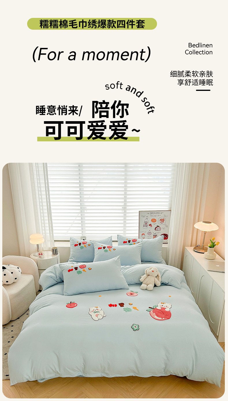 商品名称:包小包 2025新款糯糯绵毛巾绣可爱卡通爆款四件套 猫小桃-蓝
