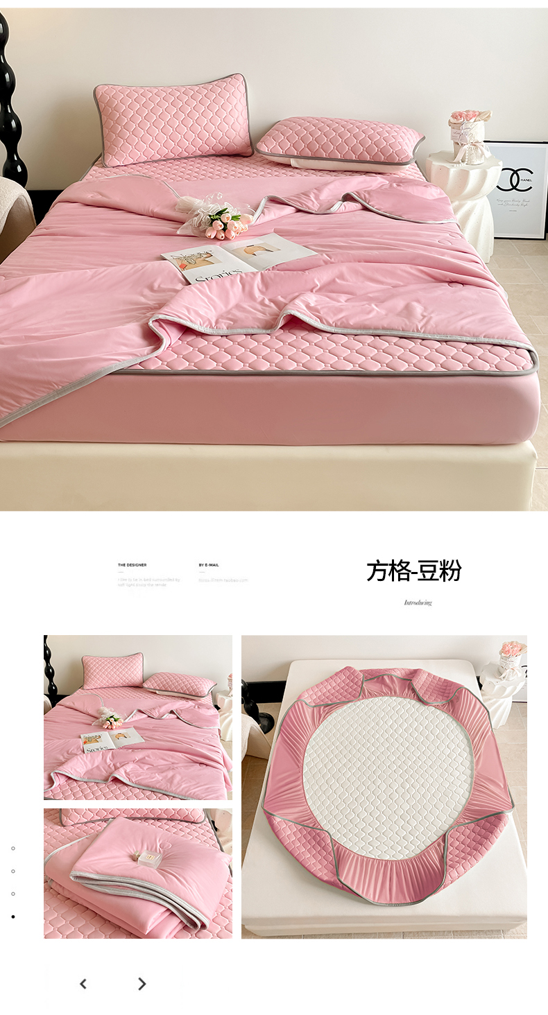 • 91家纺网 家纺一手货源 找家纺 苏拉家居 2025新款加厚0.5纯色凉感丝乳胶凉席夏被四件套 方格-豆粉