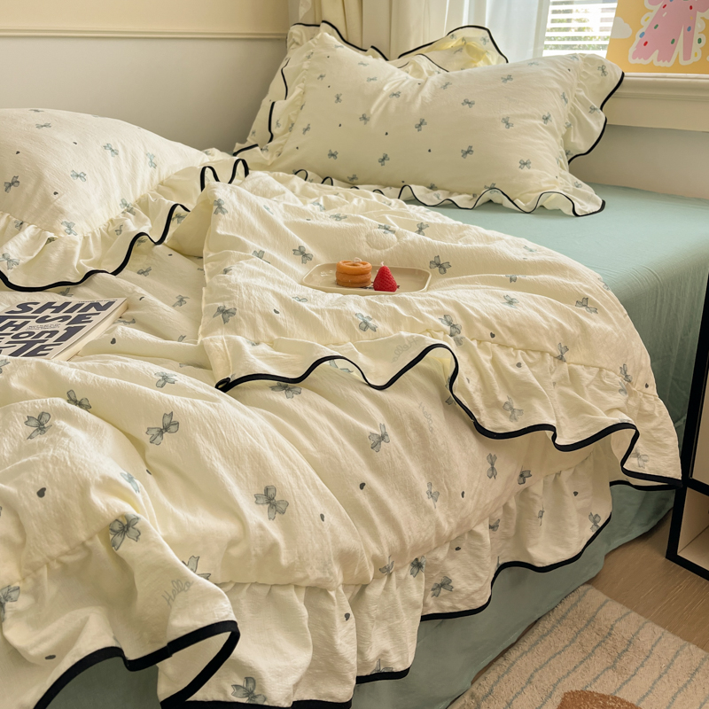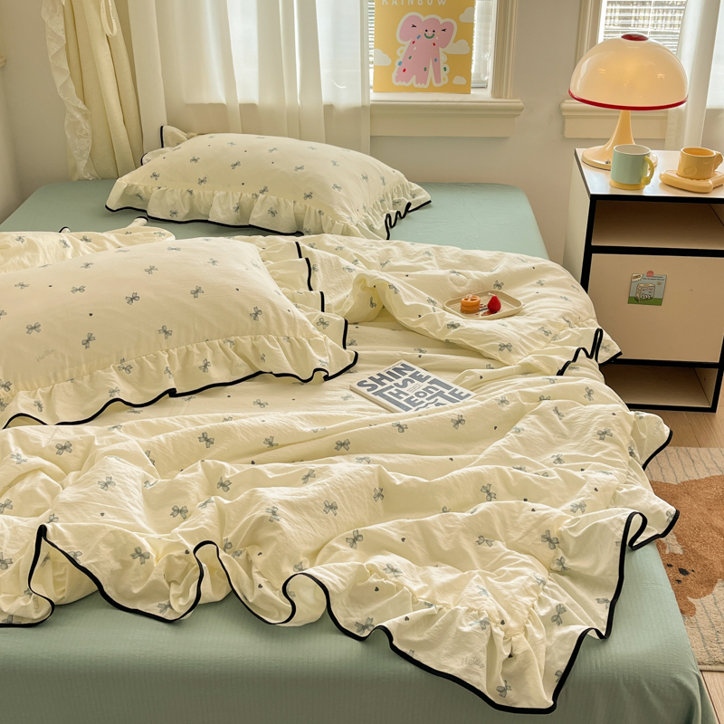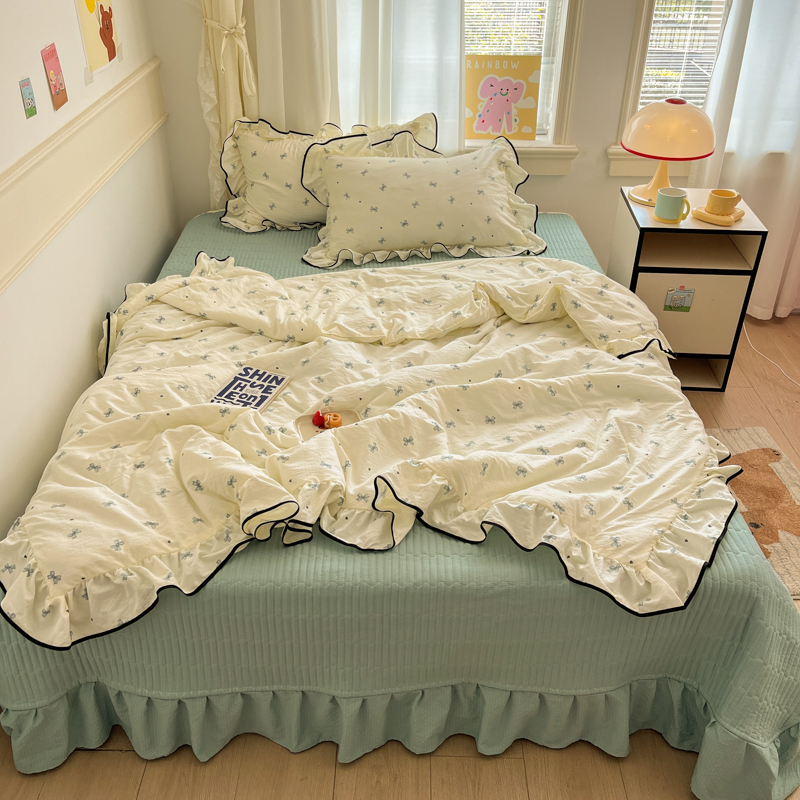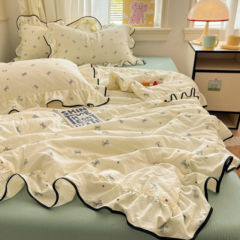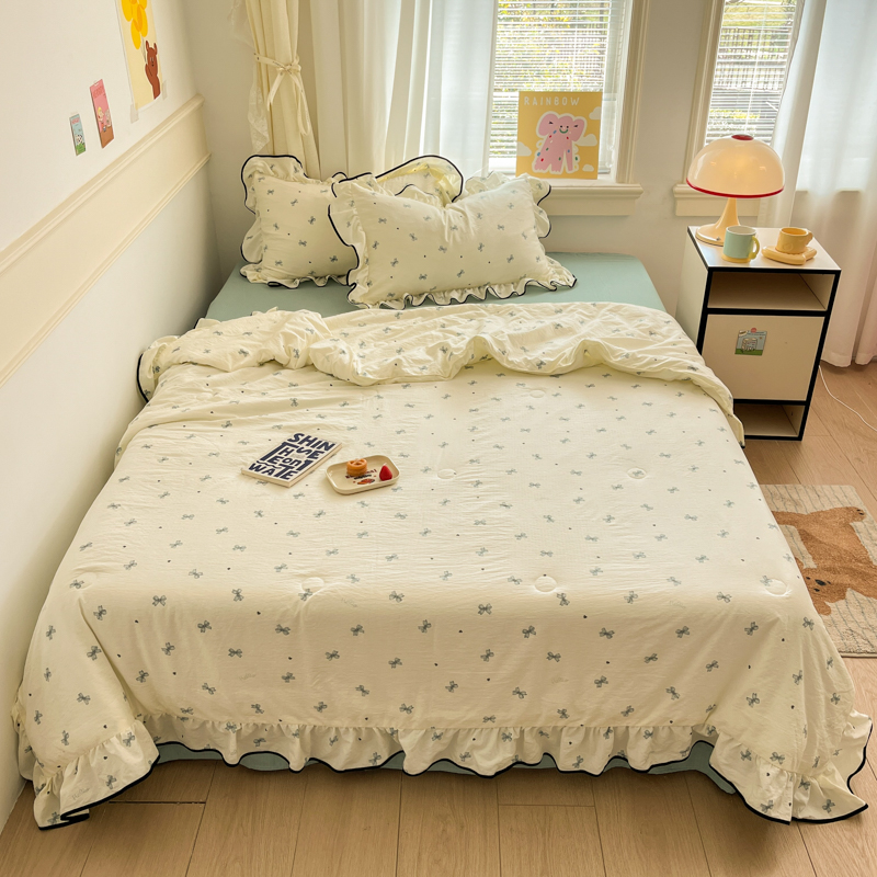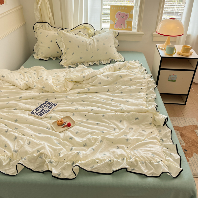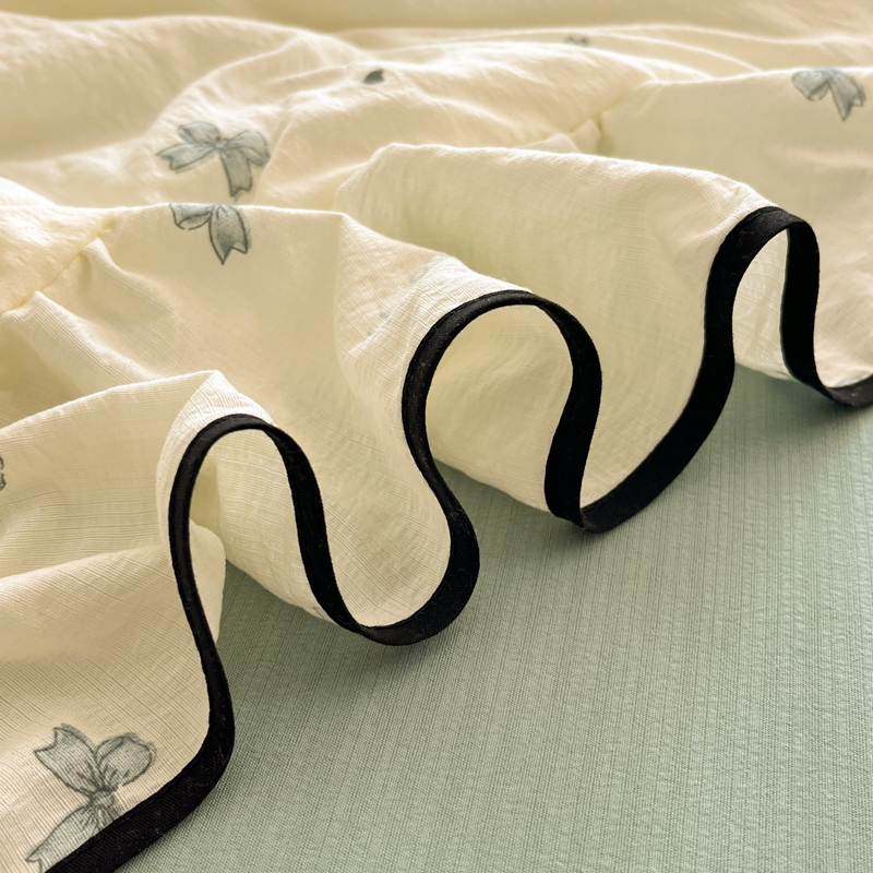 商品名称:欧尚 2025新款细黑边夏被床单床盖三件套 蓝色蝴蝶结
